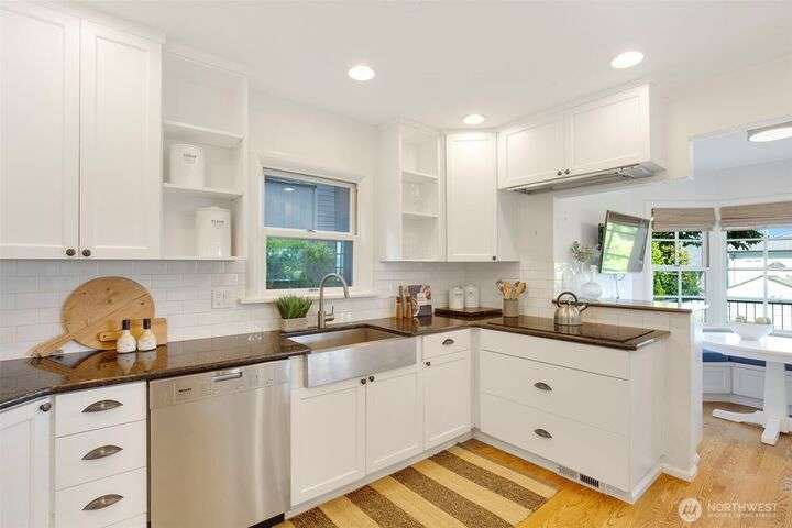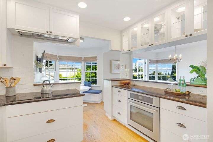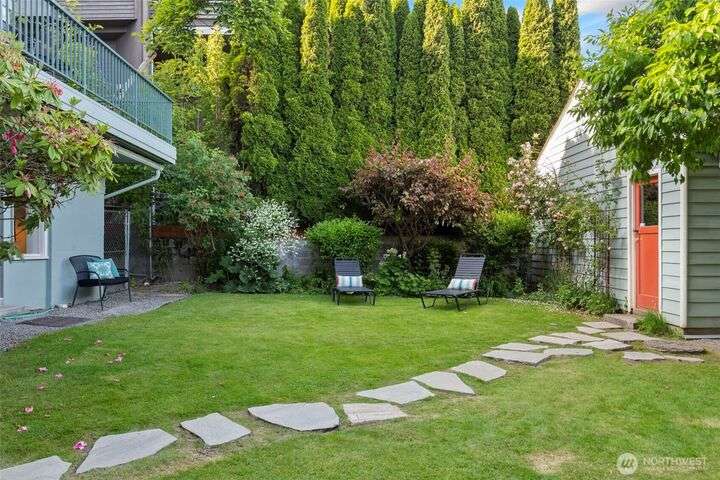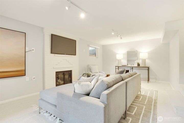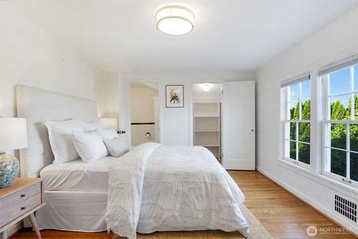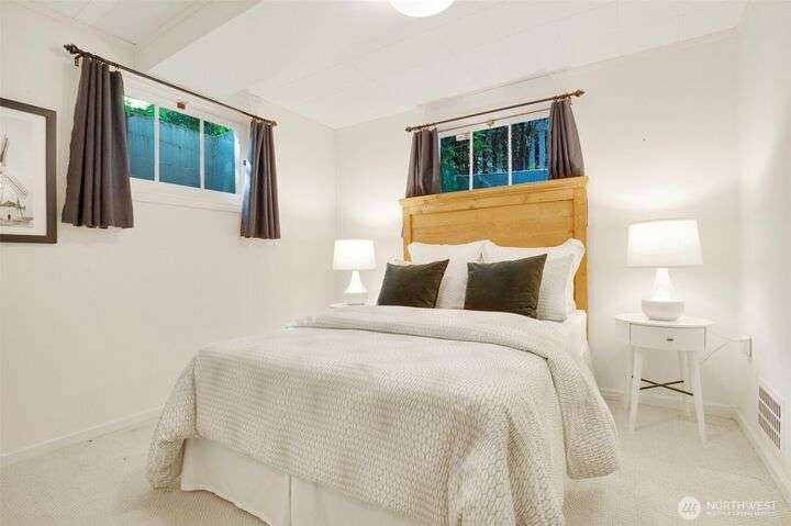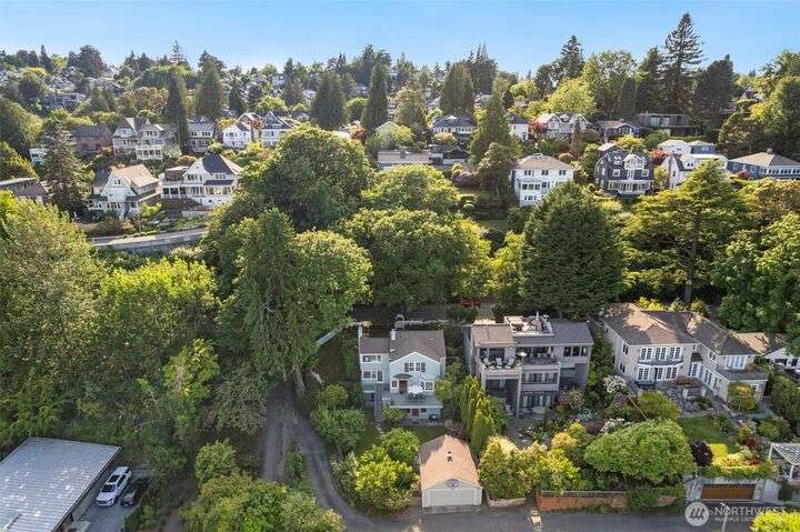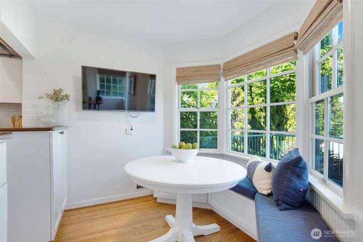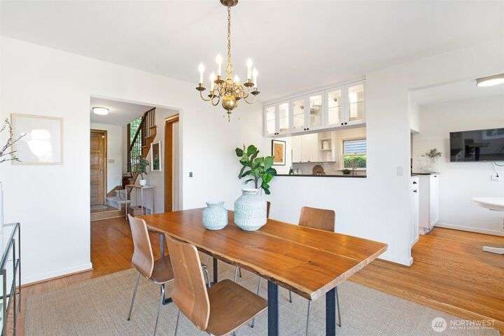 Perched in a coveted Denny Blaine enclave, this timeless residence offers refined living, adaptable spaces, and views of Lake Washington and Mt. Rainier. The main level features a gracious living room, formal dining area, well-appointed kitchen, powder room, and bedroom or home office. Upstairs, two bedrooms, a full bath, and a sunlit bonus room are nestled among the treetops. The lower level expands the living options with a fourth bedroom, ¾ bath, a versatile flex space ideal for a gym or guest suite, plus a media room, storage, and laundry. An expansive deck invites quiet mornings or effortless entertaining. Lush grounds with fruit trees, garden beds, and a two-car garage complete this serene and private setting.