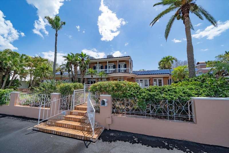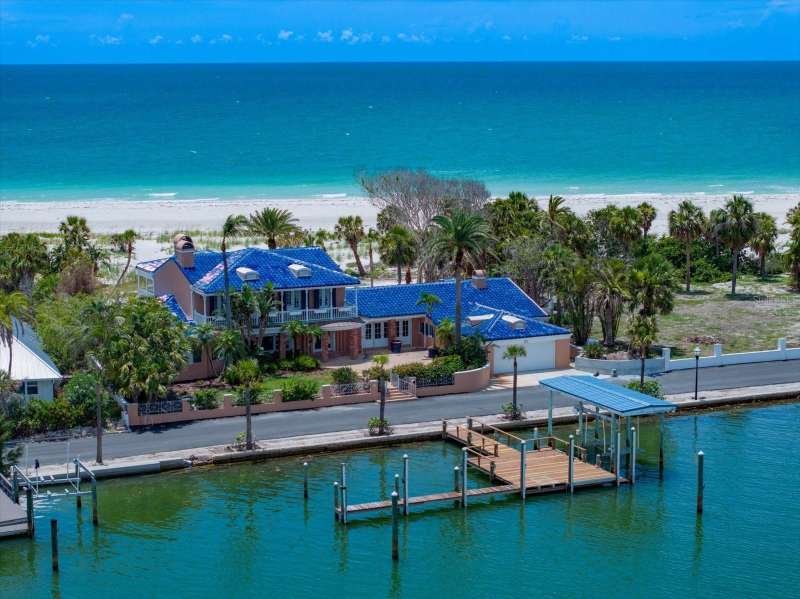 Nestled in the coveted, gated 11-home community at the north end of Clearwater Beach, 1114 Mandalay Point offers a truly rare chance to own one of the most extraordinary waterfront properties on Florida's Gulf Coast. Spanning over an acre, this estate delivers full Gulf-to-Bay frontage - 140 feet on the beach side and 137 feet on the bay side - providing unmatched panoramic views of both sunrise and sunset. Stroll down the private road for dinner at the Carlouel Beach & Yacht Club - or go by boat. This property is a boater's dream, offering 8-10 feet of protected deep-water dockage and a covered boat slip with quick access to the Intracoastal Waterway and Gulf of Mexico. Dockage will accommodate a 70 + foot yacht. The existing 5-bedroom, 4.5 bath home features vaulted ceilings, two fireplaces, separate master suite with sitting room and balconies overlooking the gulf and bay, dining room with a wall of French doors overlooking the bayside courtyard - all ideal for reimagining to reach its full potential. Whether you envision restoring the current structure or building a custom Gulf-to-Bay masterpiece, 1114 Mandalay Point presents an unrivaled setting for luxury waterfront living.
