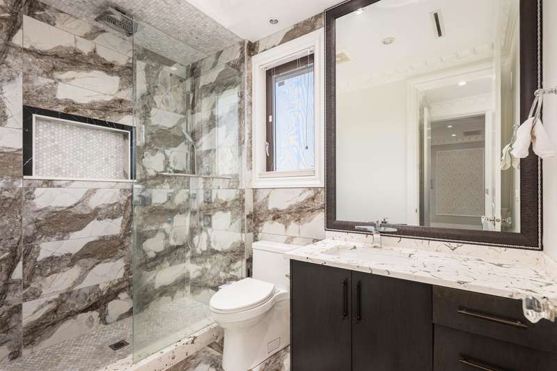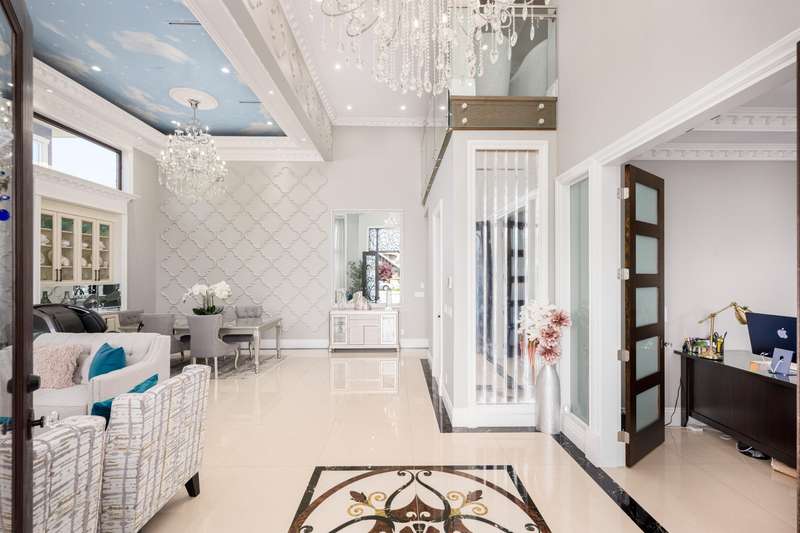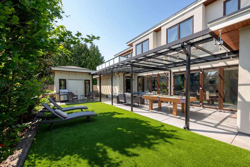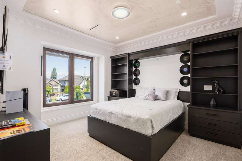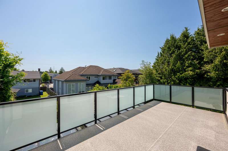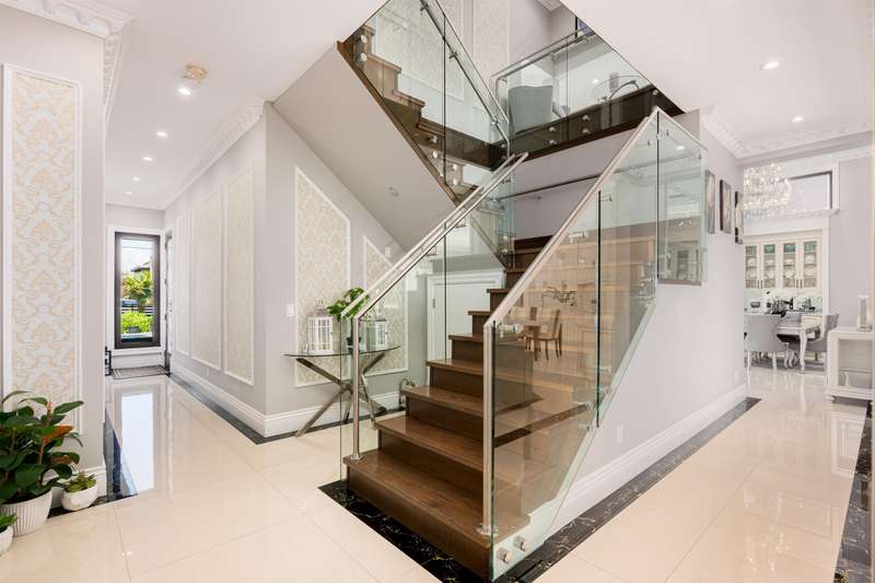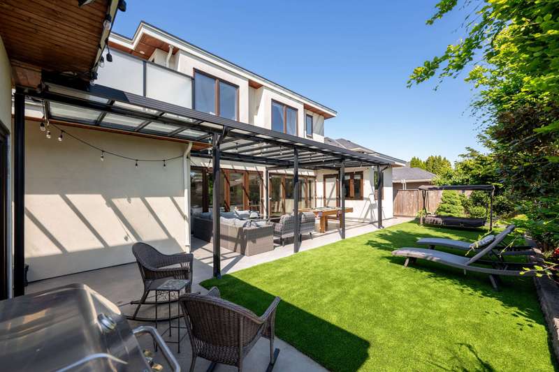 Better than new! This stunning south-facing custom home sits on an 8,713 sqft lot on a quiet street, featuring top-quality craftsmanship throughout. Soaring ceilings in the living and dining areas. Bright and cozy south-facing family room with large German folding patio doors. Main floor media room with full bath can be converted to an ensuite. Legal suite offers great mortgage helper potential. Upstairs boasts four spacious ensuite bedrooms. Equipped with intercom, built-in speakers, and security system. Close to shops, banks, restaurants, schools, transit, and more. A must-see!