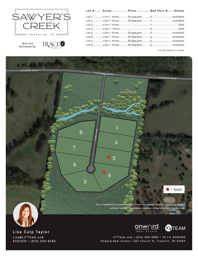 Discover the stunning new Sawyer's Creek community, featuring 8 pristine homesites each set on expansive 1.73+ acre lots. This specific lot is perked for up to 6 bedrooms and spans 1.77 acres, providing ample space for your dream residence. Located in a gated community, Sawyer's Creek offers exclusivity and security in a picturesque setting. Designed and developed by the renowned Trace Construction, this community provides you with the flexibility to bring your own builder or collaborate with Trace Construction to create your custom dream home. Sawyer's Creek is ideally situated off Coleman Road, nestled between the charming locales of Leiper's Fork and historic Downtown Franklin, ensuring a perfect blend of tranquility and convenience. Embrace the opportunity to be part of this fantastic community and build the home you've always envisioned.