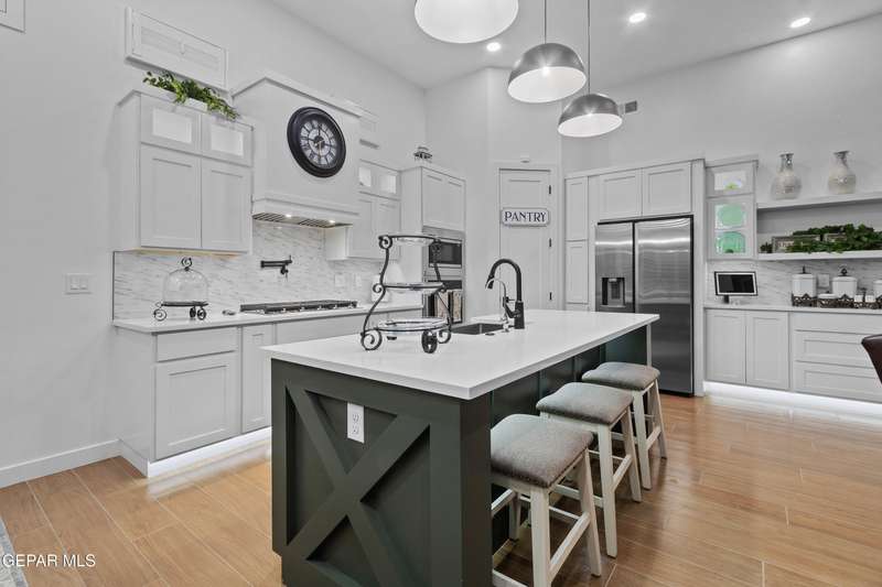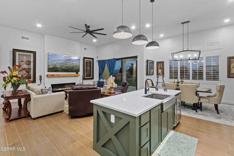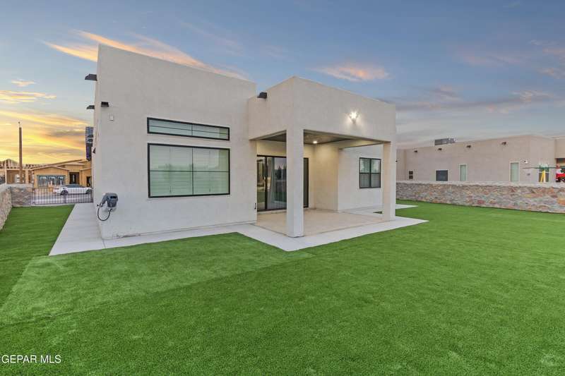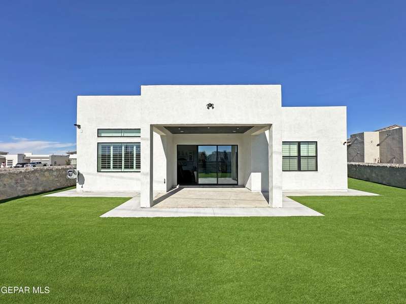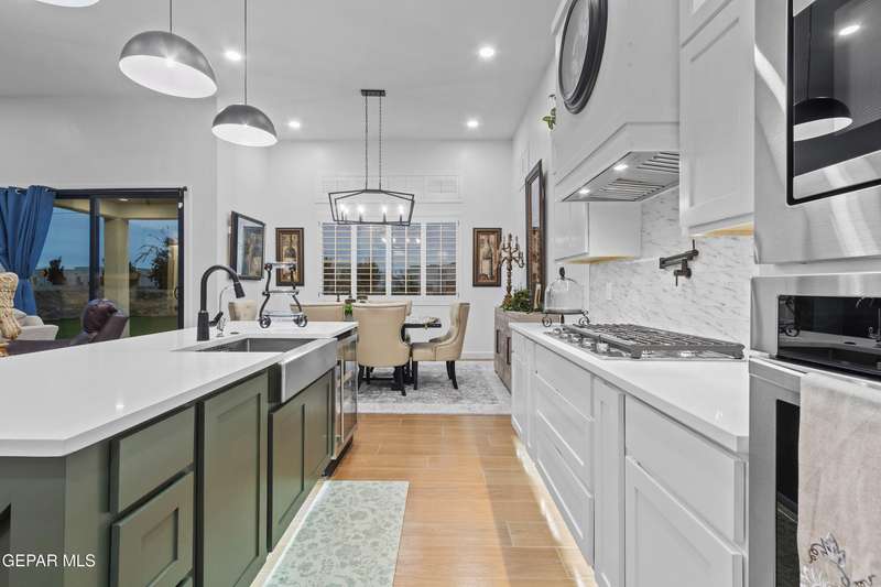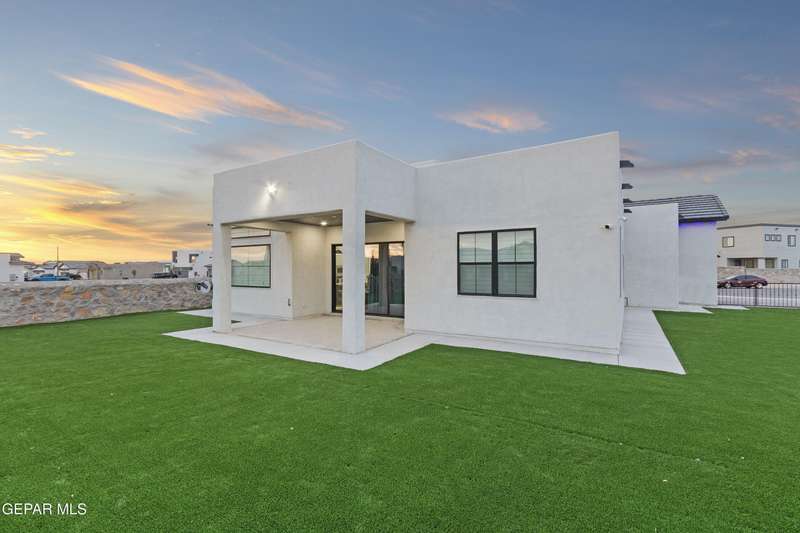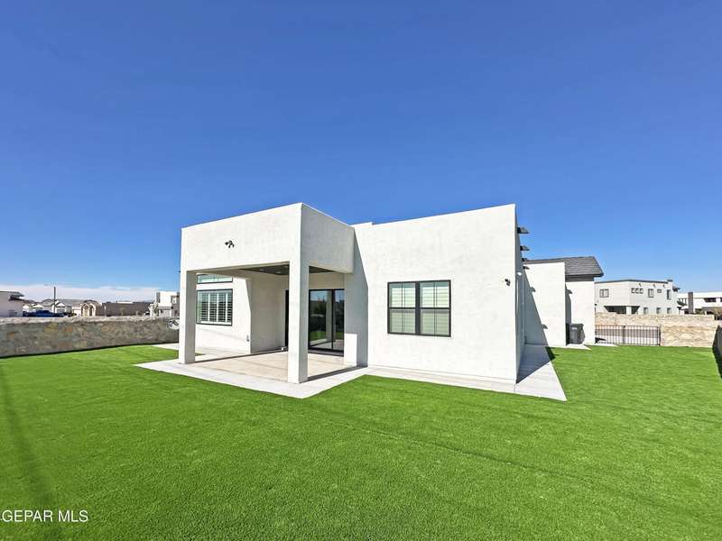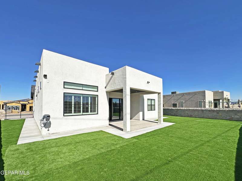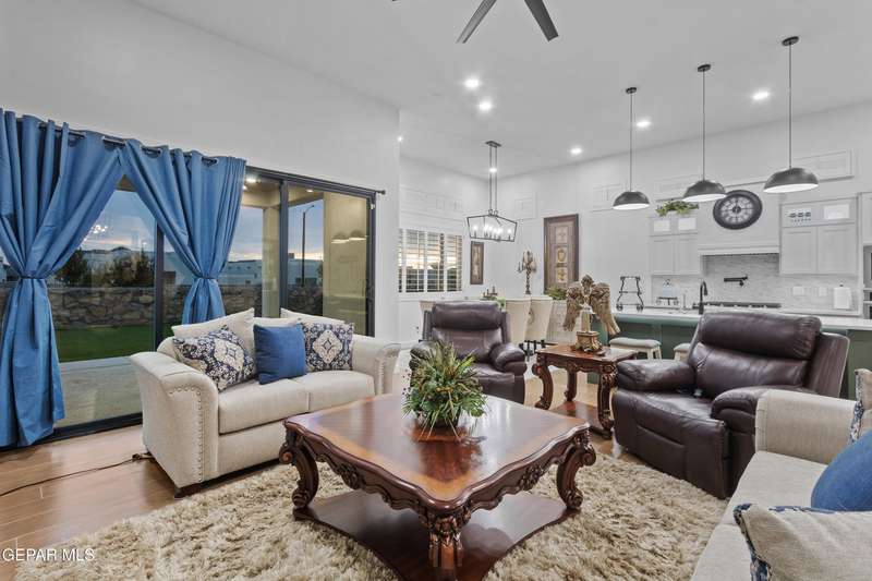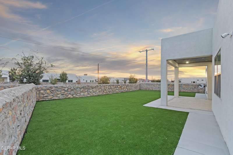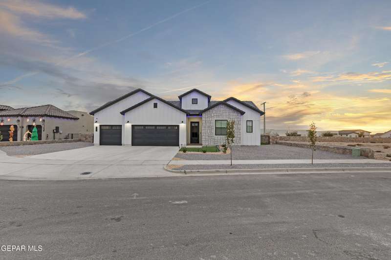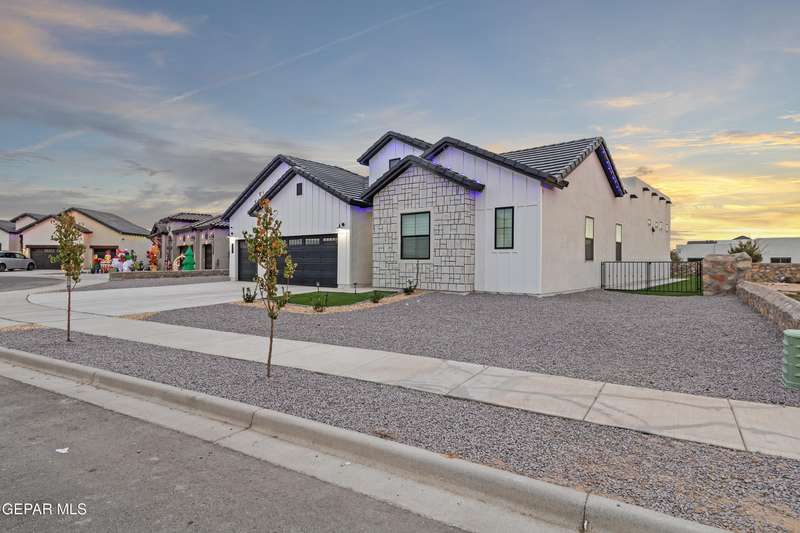 A like-new LEH Farmhouse on a spacious lot in Horizon City, this 4BR/4BA home blends modern luxury with timeless style. Less than a year old, it features 12-ft ceilings, a bright open floor plan, and premium upgrades including a fully landscaped front and backyard and water softener system. The gourmet kitchen shines with a farmhouse sink, sleek cabinetry, large island, and designer finishes. A 4-panel sliding glass door floods the living area with natural light and opens to the extended patio, perfect for entertaining. North-facing for ideal daylight balance, this move-in-ready home offers upscale finishes, elegant architecture, and a true luxury lifestyle from day one. Move-in ready and priced to move-this is a home you don't want to miss.