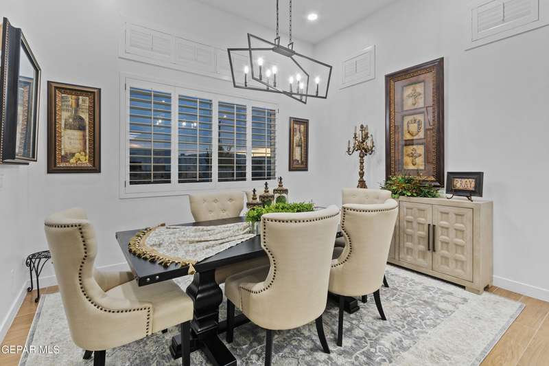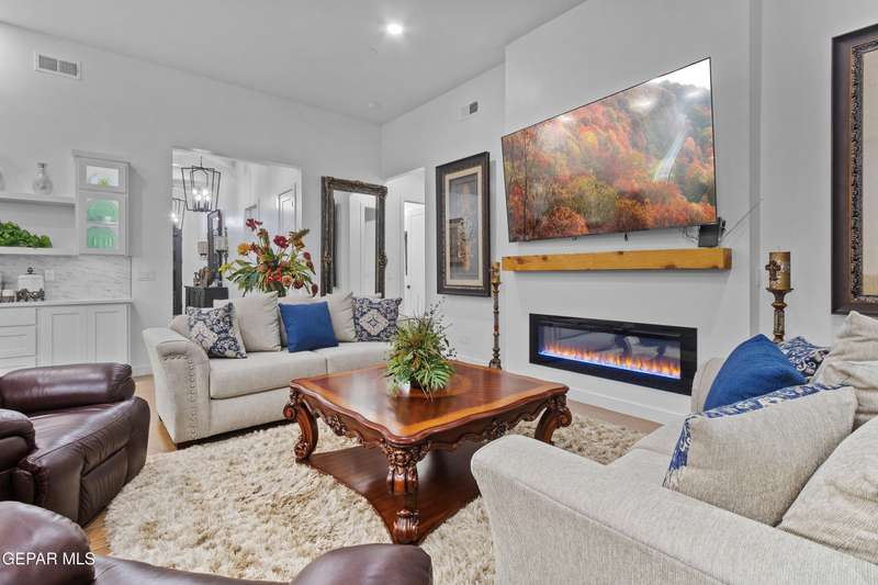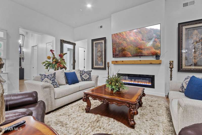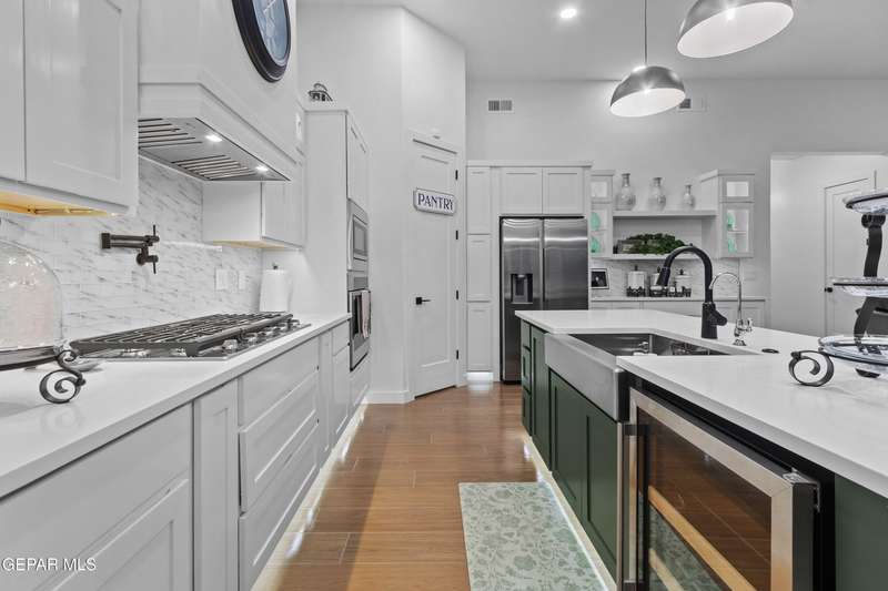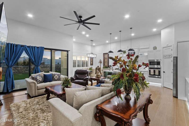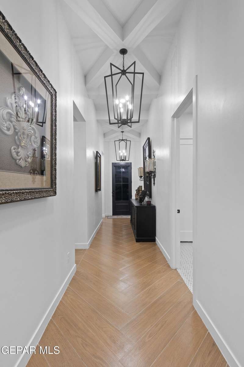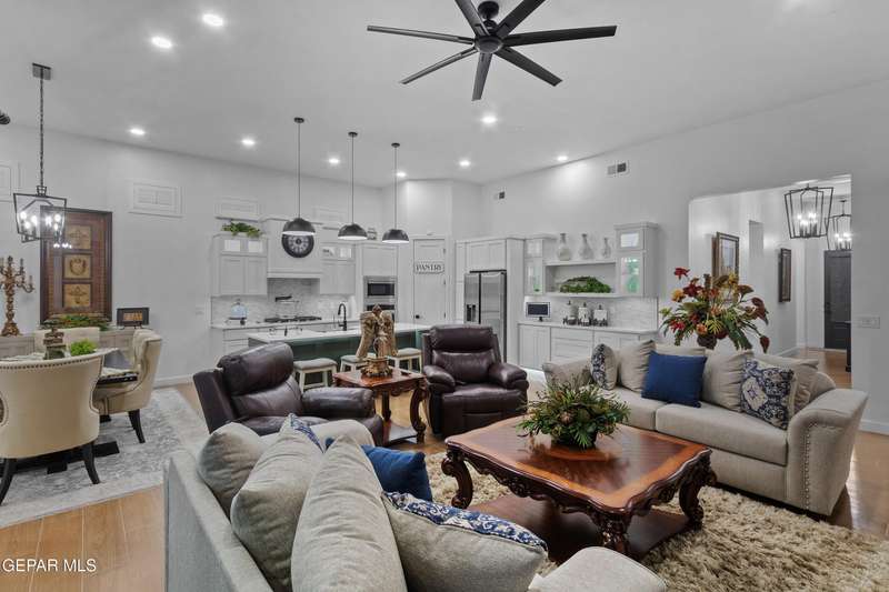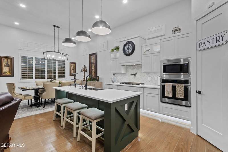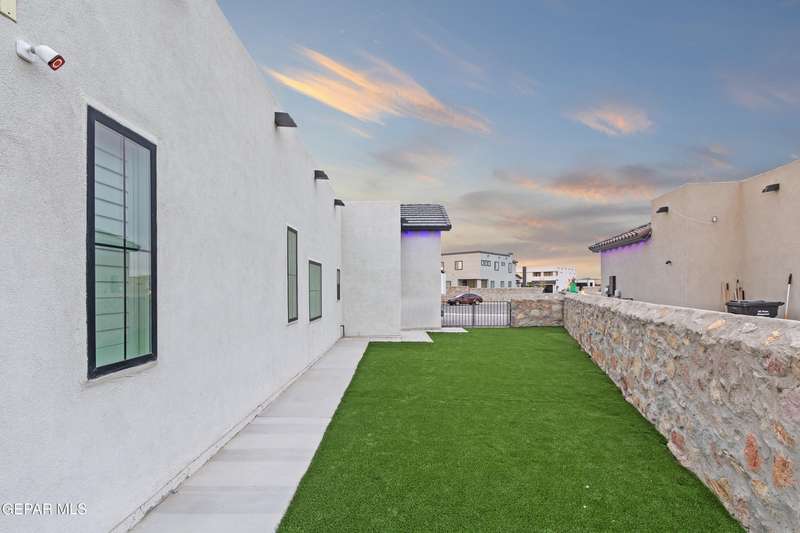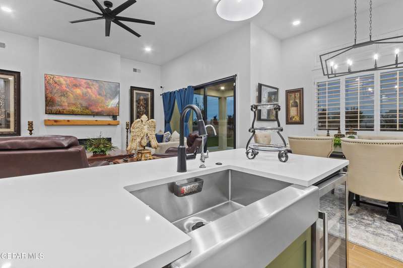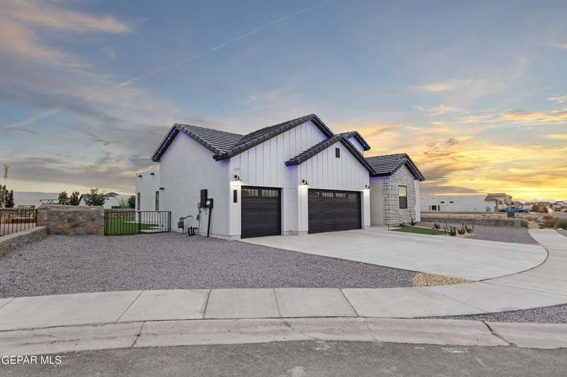 A like-new LEH Farmhouse on a spacious lot in Horizon City, this 4BR/4BA home blends modern luxury with timeless style. Less than a year old, it features 12-ft ceilings, a bright open floor plan, and premium upgrades including a fully landscaped front and backyard and water softener system. The gourmet kitchen shines with a farmhouse sink, sleek cabinetry, large island, and designer finishes. A 4-panel sliding glass door floods the living area with natural light and opens to the extended patio, perfect for entertaining. North-facing for ideal daylight balance, this move-in-ready home offers upscale finishes, elegant architecture, and a true luxury lifestyle from day one. Move-in ready and priced to move-this is a home you don't want to miss.