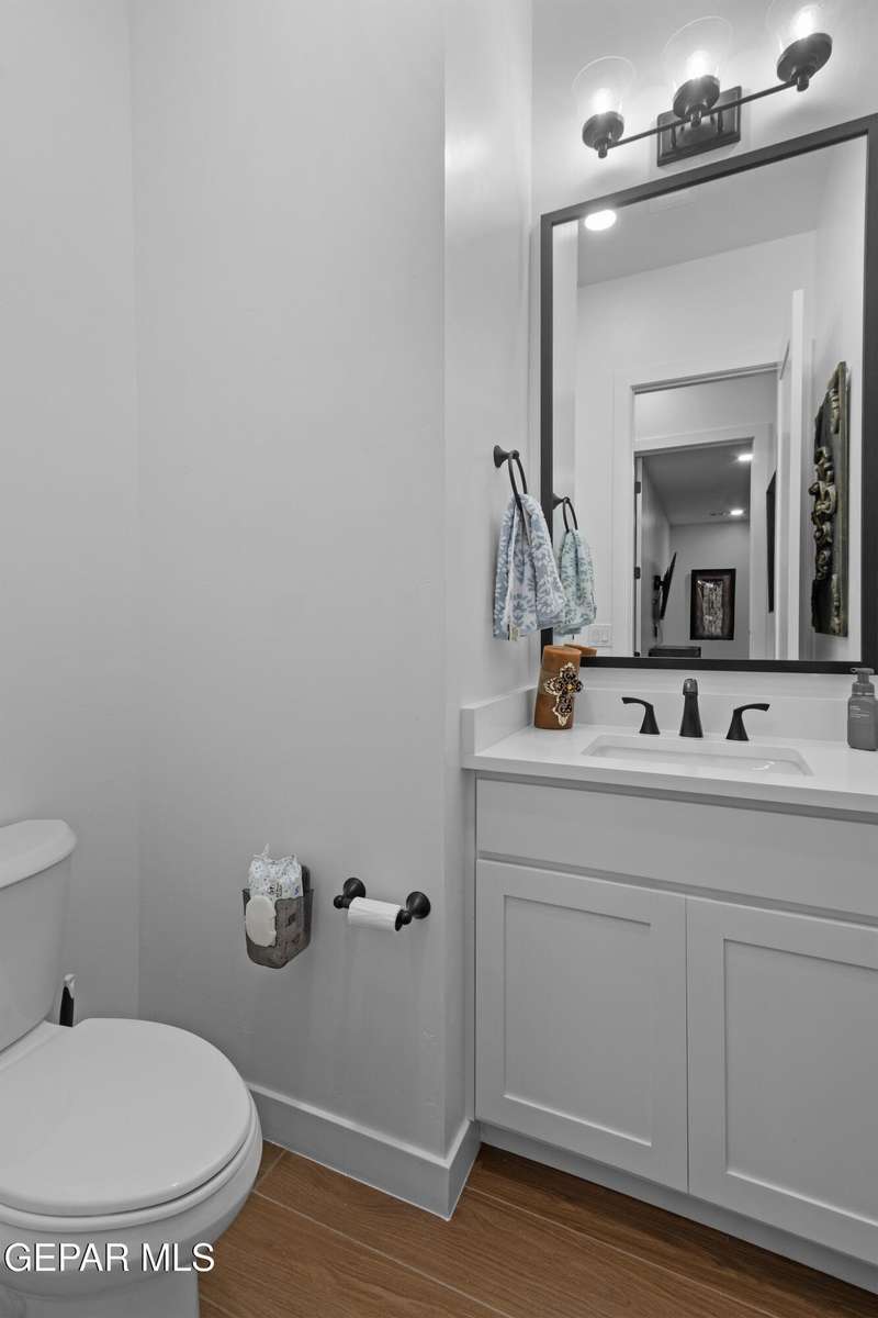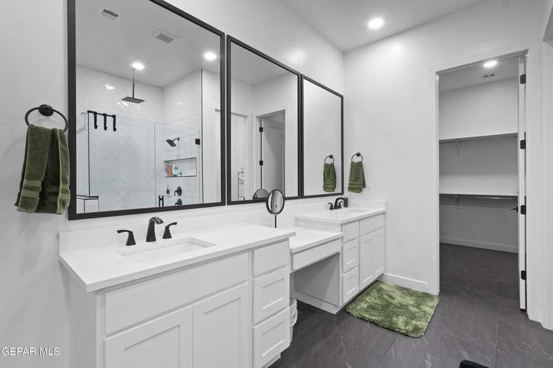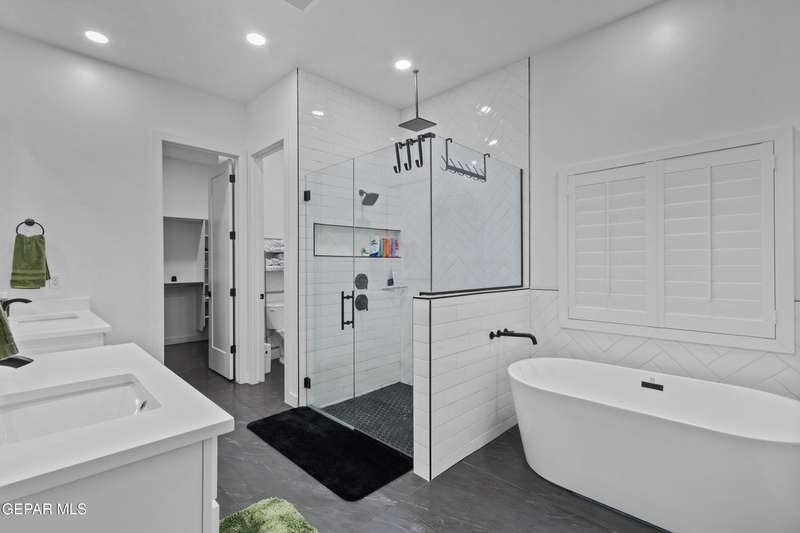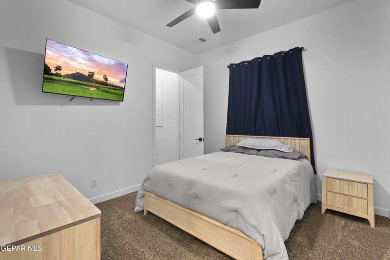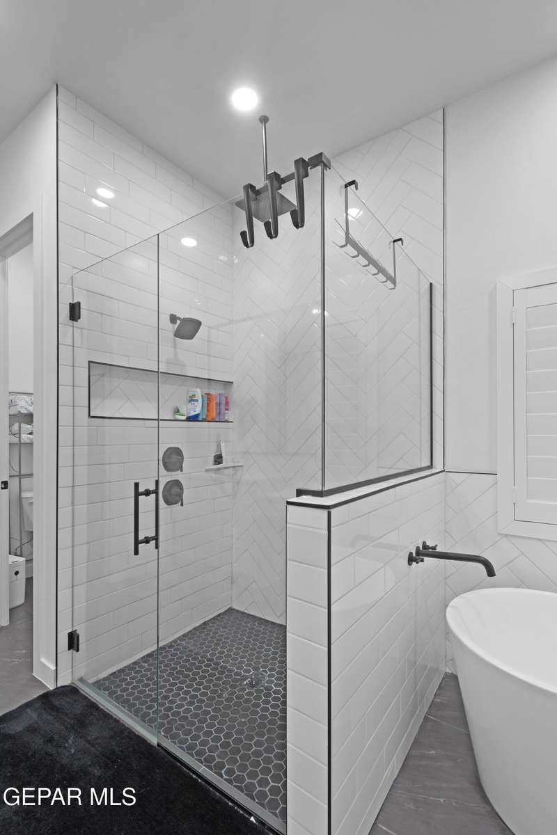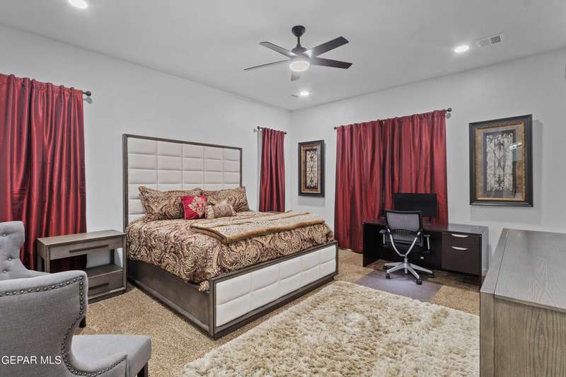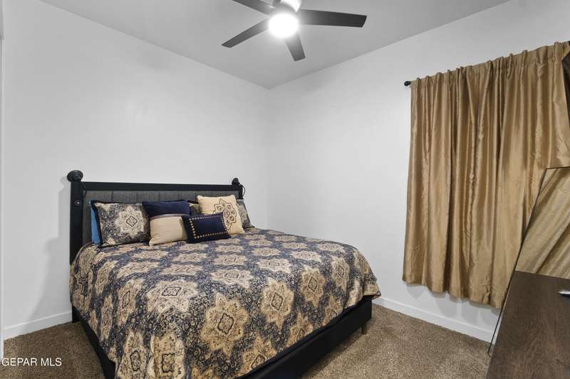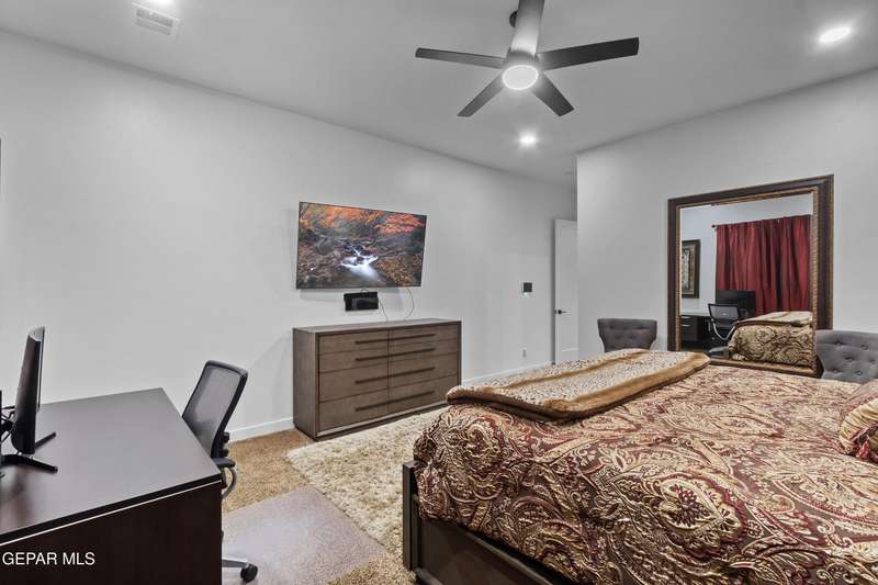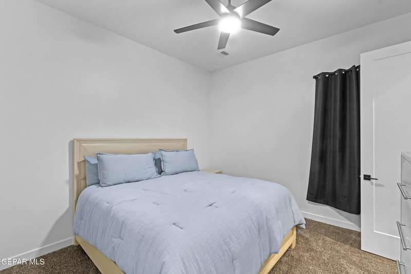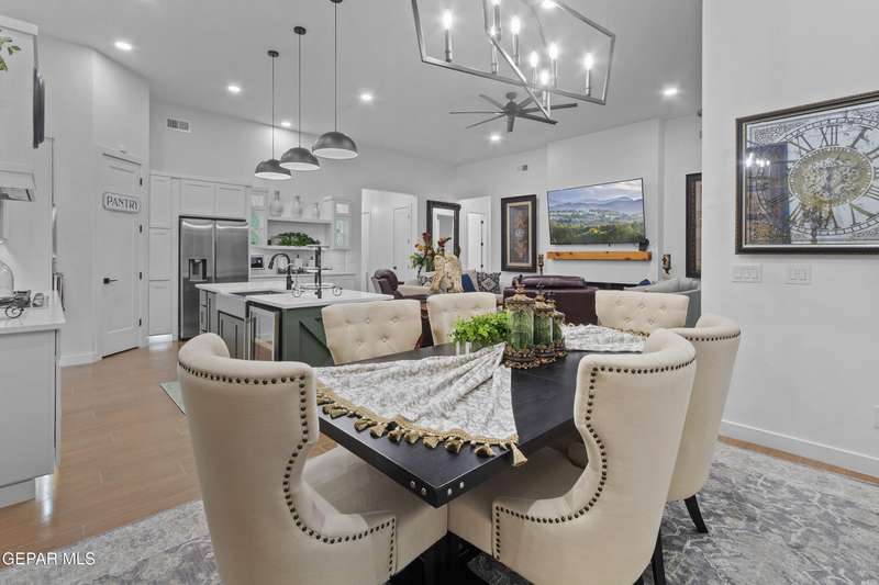 A like-new LEH Farmhouse on a spacious lot in Horizon City, this 4BR/4BA home blends modern luxury with timeless style. Less than a year old, it features 12-ft ceilings, a bright open floor plan, and premium upgrades including a fully landscaped front and backyard and water softener system. The gourmet kitchen shines with a farmhouse sink, sleek cabinetry, large island, and designer finishes. A 4-panel sliding glass door floods the living area with natural light and opens to the extended patio, perfect for entertaining. North-facing for ideal daylight balance, this move-in-ready home offers upscale finishes, elegant architecture, and a true luxury lifestyle from day one. Move-in ready and priced to move-this is a home you don't want to miss.