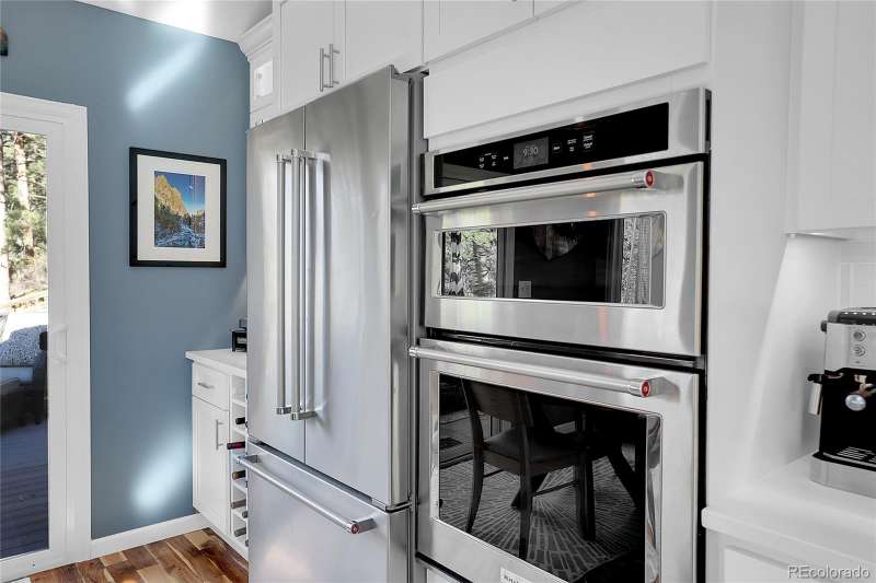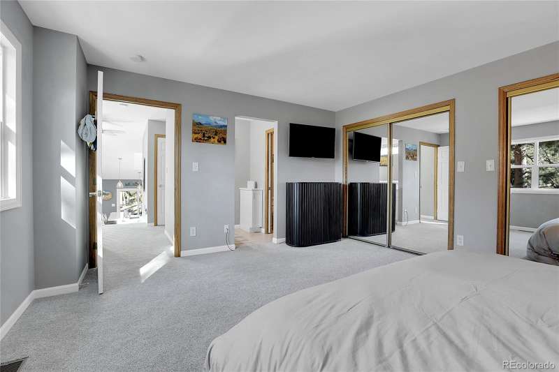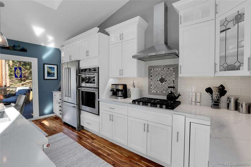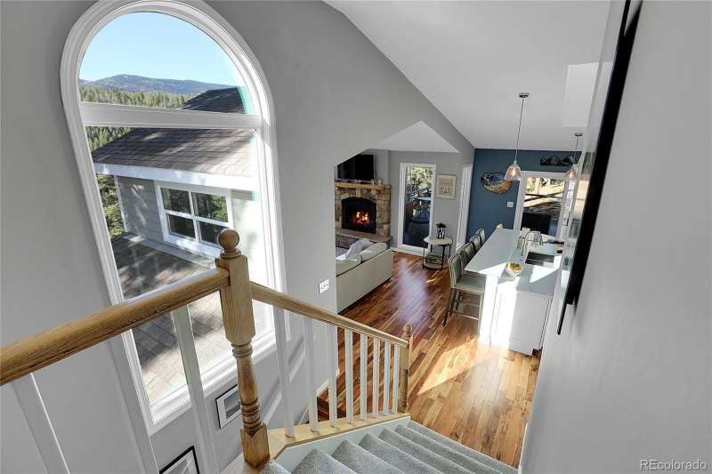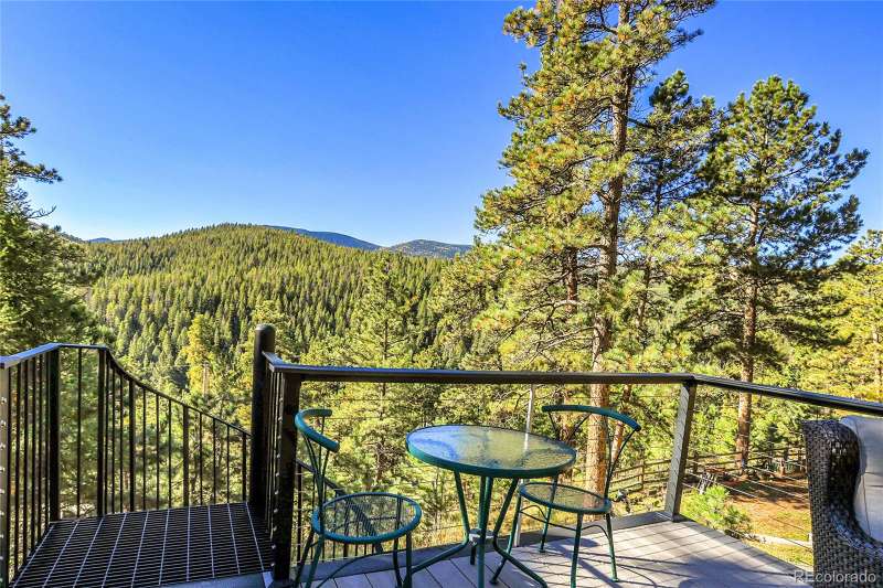 Sun-lit and sparkling - that's how to describe this delightful remodeled home. From the stunning remodeled kitchen to the new decks surrounded by aspens and mountain views, this home will meet your your every need and fill your spirit. Modern upgrades completed with quality and thoughtfulness abound here. Step inside the new custom glass front door to wide-plank acacia hardwood flooring and a light, airy feel to the house. The kitchen is truly a stunner, just completed in 2022 with high-end cabinetry, quartz counters, bar seating, gas stovetop and even new skylights. It's open to the vaulted living room with gas fireplace and plentiful windows - it's the ideal set-up for today's living. You will find amazing views from almost every room via the new windows throughout the house. Step outside to the new deck-a private, spacious haven built with top-grade materials-perfect for morning coffee, evening dinners, or simply soaking in the gorgeous views and tranquil setting. You will love the outdoor living here! The primary suite offers more views, an updated bathroom with dual sinks, and dual closets. An additional bedroom here with high-grade carpet makes the perfect office (high speed internet). Downstairs, you'll find a charming family with new patio doors, a full bath, an additional bedroom, laundry room, and convenient access from the oversized garage. Every detail has been thoughtfully updated, including brand new windows, exterior doors and a brand new roof! Paved driveway, natural gas, and public water too. Located just moments from Maxwell Falls, national forest trails, and endless outdoor adventures, this home invites you to embrace the true Colorado lifestyle-while being just 12 minutes from Evergreen's vibrant downtown, with its lakeside charm, shops, and restaurants. Lovingly cared for and filled with joy, this sunlit mountain home is ready to welcome you into its next chapter. Video, 3D and more at www.32857LittleCubRoad.com