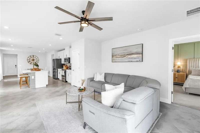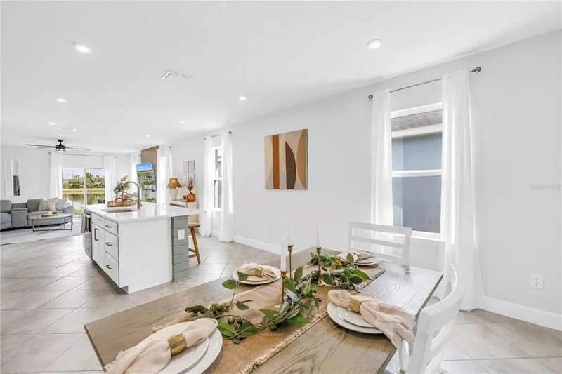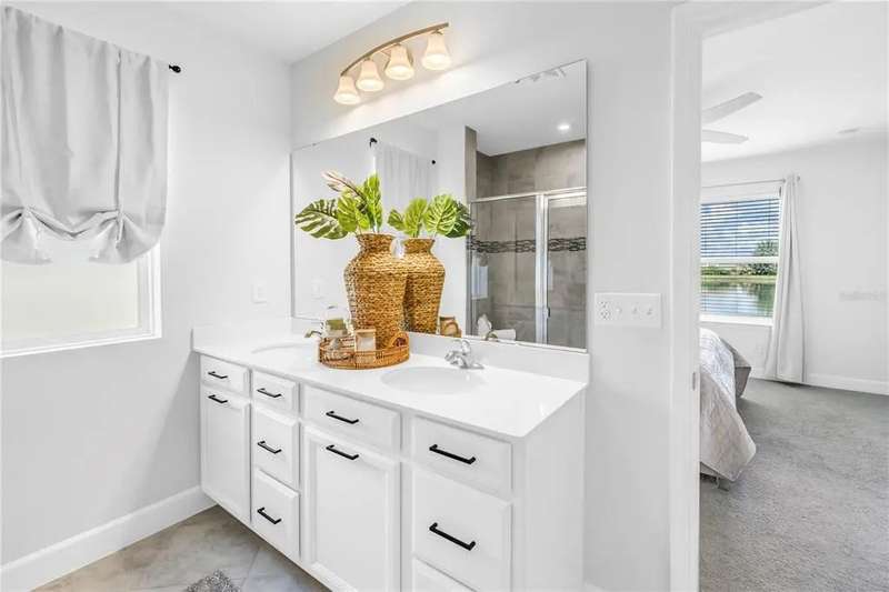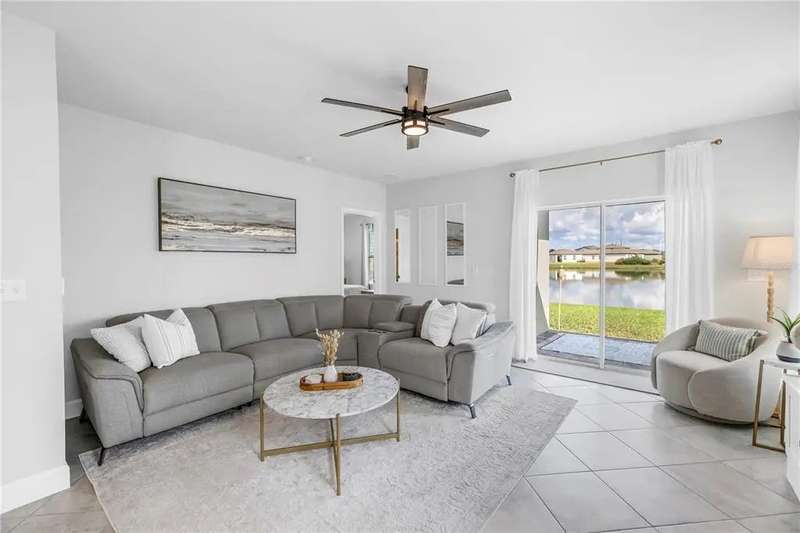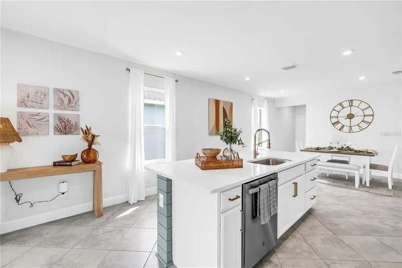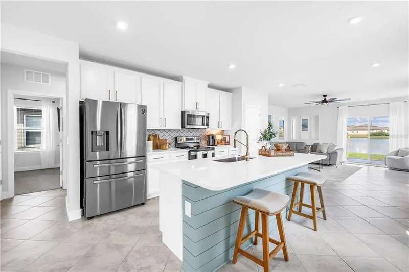 Welcome to one of Summerwoods’ most stunning homes — a rarely available Ryan Homes “Century” floor plan where design, comfort, and craftsmanship converge. This thoughtfully curated 3-bedroom, 2-bathroom residence spans nearly 1,500 square feet of refined living space and showcases meticulous attention to detail at every turn. Step inside and experience an effortless, open flow that connects the heart of the home — the kitchen, dining, and living areas — creating the perfect backdrop for both entertaining and everyday living. The kitchen exudes charm and function with a shiplap island, upgraded hardware and faucet, stylish backsplash, vented microwave, and all included stainless steel appliances. The adjoining living room features a designer accent wall with built-in cabinetry, offering both warmth and sophistication. The split floor plan enhances privacy, with the primary suite tucked away as a true retreat. This serene space offers calming water views, a spacious walk-in closet, and an en-suite oasis featuring upgraded fixtures, a modern showerhead, and elegant finishes that make every day feel like a spa day. The secondary bedrooms are equally inviting, with one featuring an accent wall, sconce lighting on dimmers, and a newly upgraded double-door bifold closet. Outside, unwind on the backyard paver patio overlooking a tranquil water view — the ideal setting for morning coffee or evening sunsets. The home’s thoughtful upgrades continue throughout: epoxy garage flooring with overhead shelving, gutters on the entire house, enhanced landscaping, upgraded hardware and lighting throughout, a new AC coil, curtain rods, blinds, and smart home features including Ring cameras and an upgraded keypad lock. Located in the highly sought-after Summerwoods community, residents enjoy resort-style amenities including a pool, splash pad, dog park, playground, and scenic walking trails. This home stands apart as a move-in-ready masterpiece that blends style, function, and Florida living at its finest.