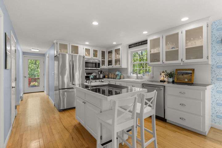 Welcome to 239 Clay Hill Road, where beach days, hiking trails, and boutique shopping define your days, and evening cookouts on a private lot define your nights. Set high on a scenic hill, this sprawling Cape is surrounded by mature trees and natural stone landscaping, offering a peaceful retreat just 2 miles from Ogunquit's beaches, restaurants, and the scenic Marginal Way. A charming farmer's porch invites you into a spacious, sunlit foyer and open-concept kitchen and living area that is perfect for daily living and entertaining. Coastal blue accents, warm wood floors, and oversized windows bring in natural light and a sense of ease throughout the home. Step out onto one of two decks to take in the fresh air and serene wooded views. With 3 bedrooms and 3 full bathrooms, the layout offers both functionality and privacy. The primary suite is thoughtfully separated from the other bedrooms and features a walk-in closet and full bath, creating a tranquil space to unwind. The finished lower level basement provides flexible space for a home office, movie nights, guests, or hobbies, plus ample storage. Located just down the road from the beloved Clay Hill Farm restaurant, this property sits in the desirable York School District with low taxes and easy access to golf, boating, Mount Agamenticus trails, and local amenities. Whether you're seeking a primary residence, vacation home, or investment property, 239 Clay Hill Road offers an ideal blend of coastal charm and comfort.