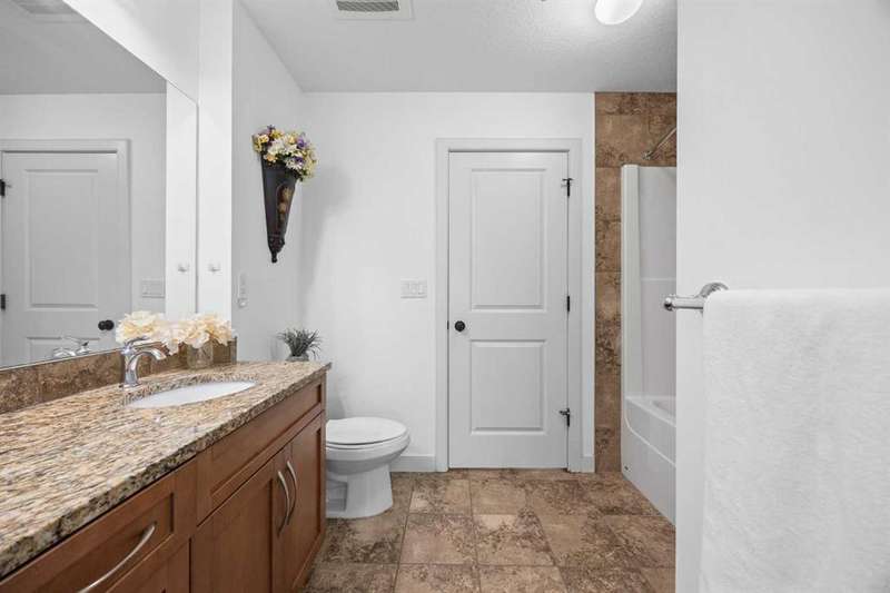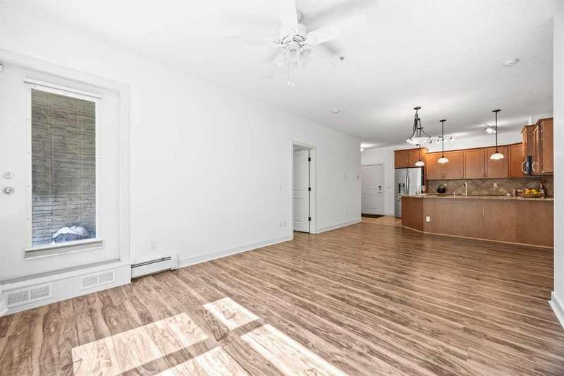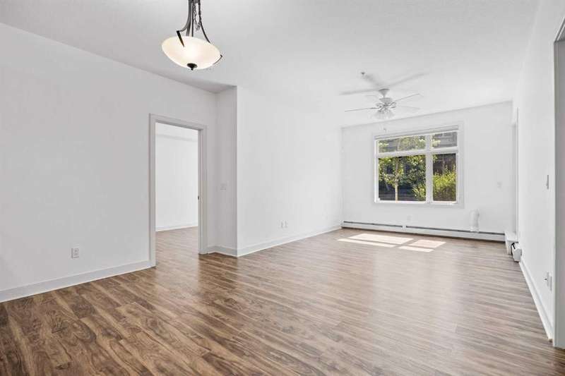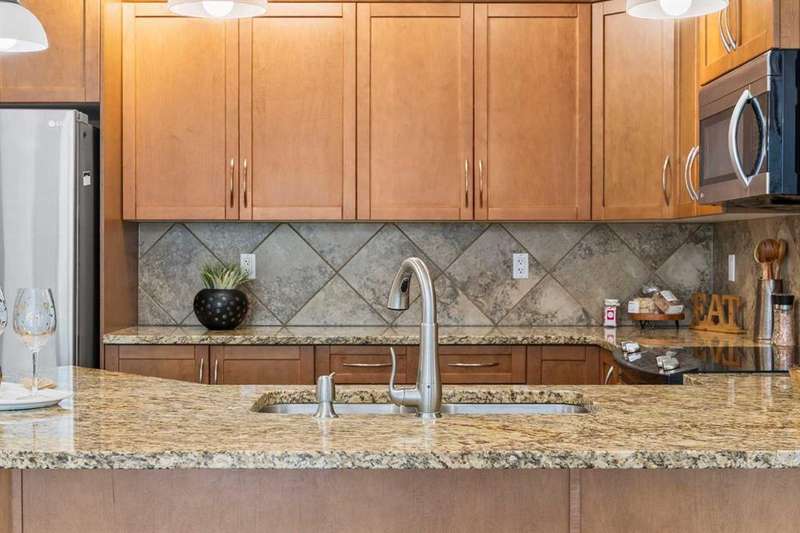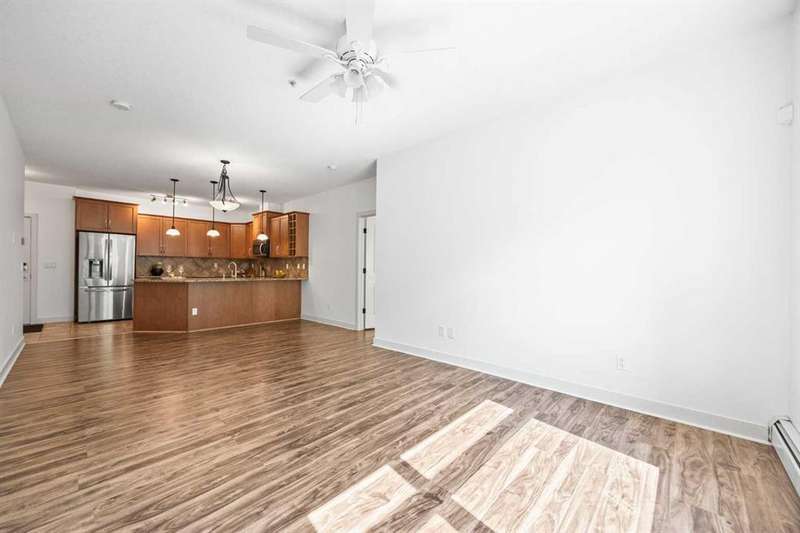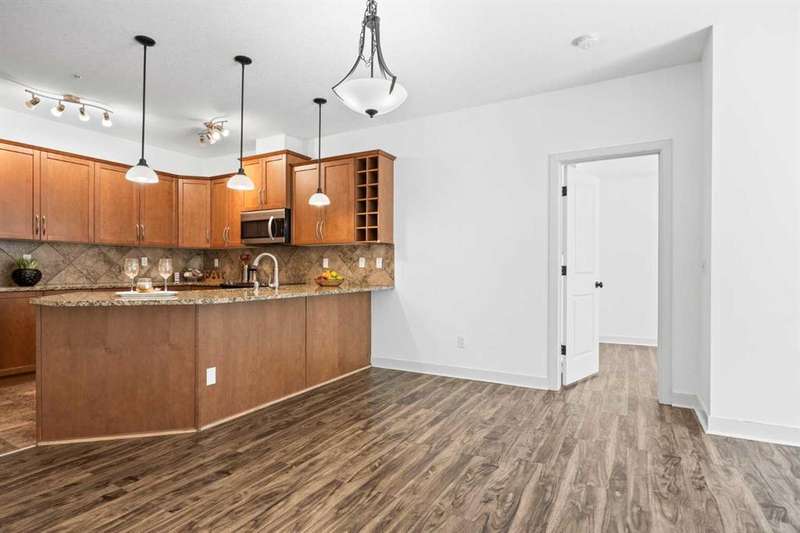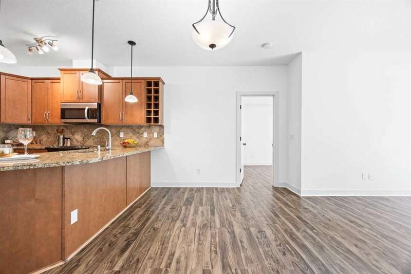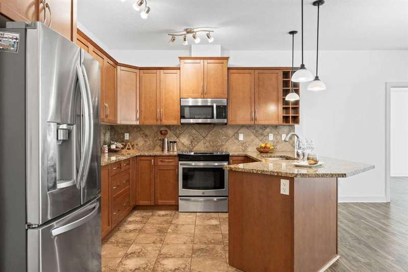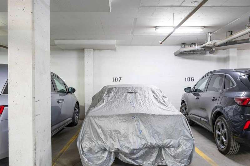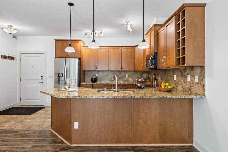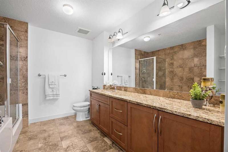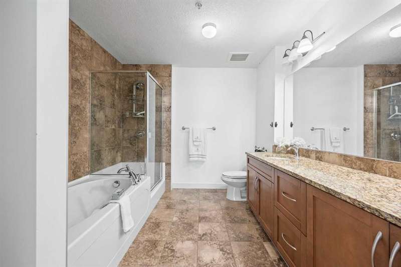 Opportunities like this don’t come around often — and when they do, they don’t last long! Welcome to this beautifully upgraded, open-concept 2-bedroom, 2-bathroom condo located in the sought-after community of Aspen Woods. This immaculate unit includes 1 titled underground parking stall and TWO STORAGE LOCKERS, one of which is extra-large and semi-private — a rare find! Step inside and you’re immediately greeted by a stylish kitchen featuring newer stainless steel appliances, granite countertops, a chic tiled backsplash, built-in wine rack, and a spacious peninsula with breakfast bar seating. The kitchen flows effortlessly into the dining area and bright living room, which opens onto a peaceful south-facing balcony — the perfect spot for morning coffee, evening reads, or summer BBQs thanks to the convenient gas hookup. The thoughtful layout offers privacy with bedrooms on opposite sides of the unit. The primary bedroom is generously sized and features a walk-through closet leading into a luxurious 4-piece ensuite complete with a soaker tub and tiled glass shower. The second bedroom has its own direct access to the second full bathroom, making it ideal as a guest room, home office, or reading retreat — whatever suits your lifestyle. This home has been lovingly maintained and offers a long list of upgrades including, TWO A/C units, Luxury vinyl plank and tile flooring throughout, In-suite laundry with additional storage, Knock-down ceilings, Abundant natural light from large south-facing windows. The complex itself features two on-site fitness centres, guest suites, and is perfectly located within walking distance to Aspen Landing Shopping Centre with its array of shops, cafes, and restaurants. Families will appreciate proximity to Guardian Angel School, as well as prestigious private schools like Webber Academy just a short drive away. Quick access to 17th Avenue and 85th Street ensures you're always connected. Whether you're a first-time buyer, downsizer, or looking for a well-appointed home with incredible lifestyle potential, this unit offers functionality, comfort, and timeless value. Bonus Opportunity: The seller also owns an additional titled underground parking stall that can be purchased separately if extra parking is desired.