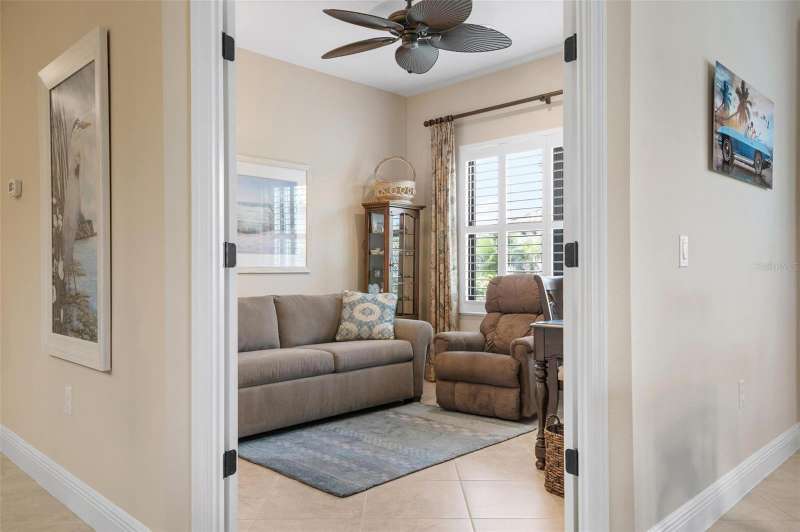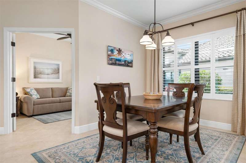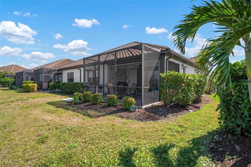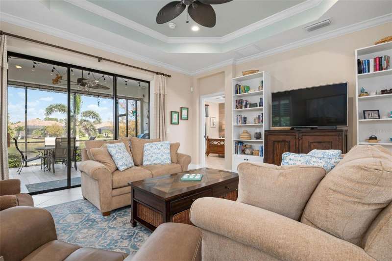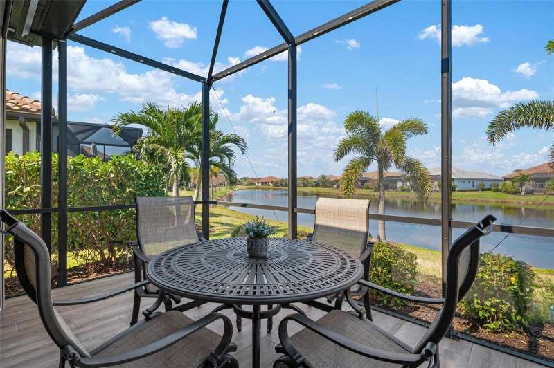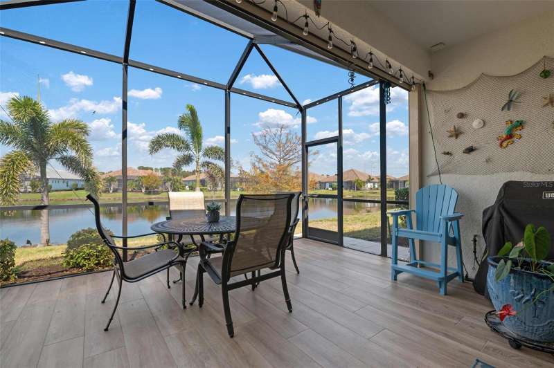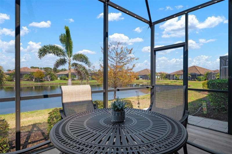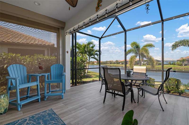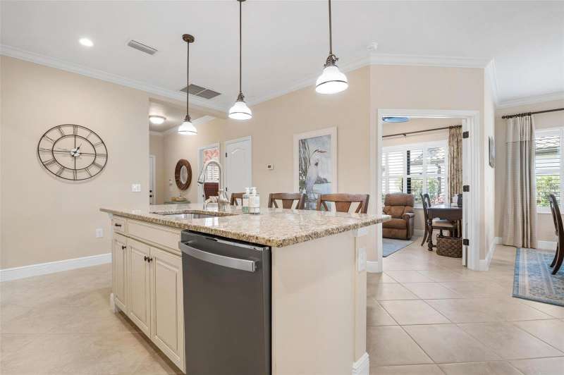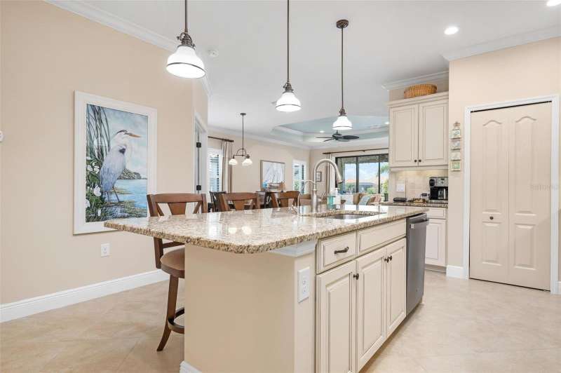 This amazing Villa truly has it all...3 bed/2 bath plus den, showcasing attention to every detail. Inside, the home is adorned with plantation shutters and closet systems to offer organized storage. The elegance continues with crown molding and coffered ceilings. While the kitchen boasts roll out drawers, under cabinet lighting, pantry and granite countertops. Tiled floors span the entire house, providing an elegant look. This look is complemented by the outside tiled, extended lanai that looks out to the beautiful full view of pond. The hurricane shades provide extra protection against harsh weather. Additional amenities include water softener, reverse osmosis and a hot water recirculation system. Ceiling fans throughout for optimal cooling. The laundry is equipped with cupboards, stationary tub and drying rack. This home features a whole house generator, and a whole house surge protector to ensure uninterrupted power. The garage is a standout with epoxy floors, insulated ceiling and doors, ample storage racks and cabinets and best of all...It has an AC unit to keep your treasures intact from the heat. The home has been freshly painted inside and out, and a new dishwasher was added in 2023.