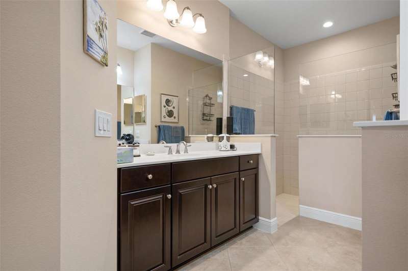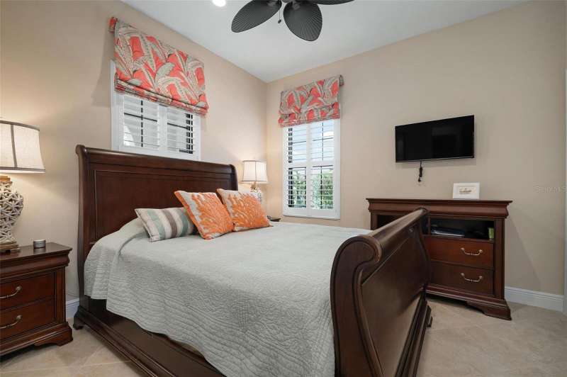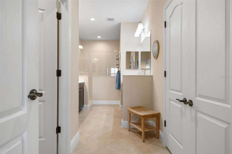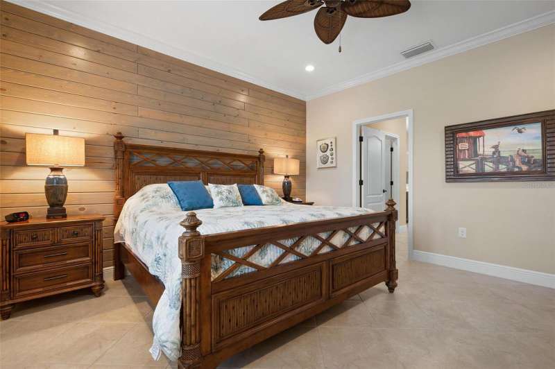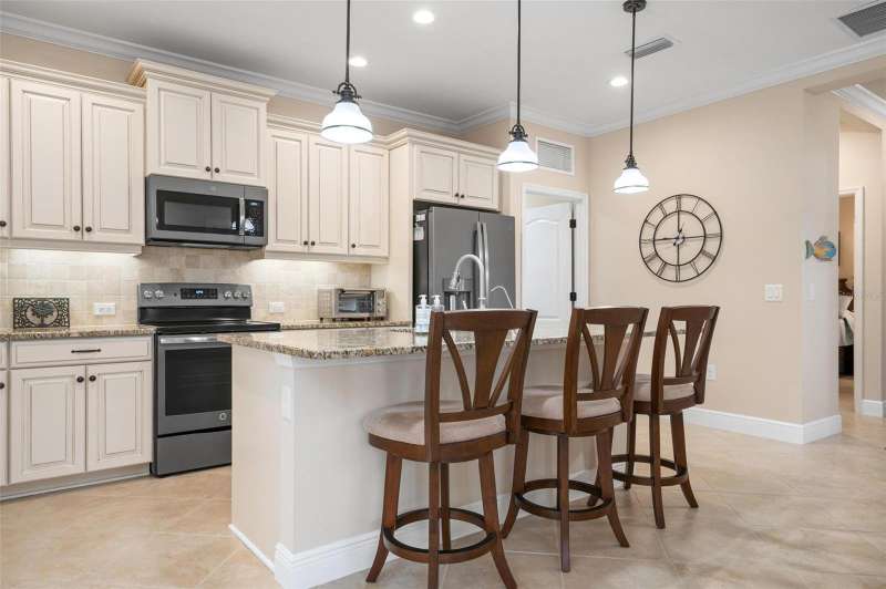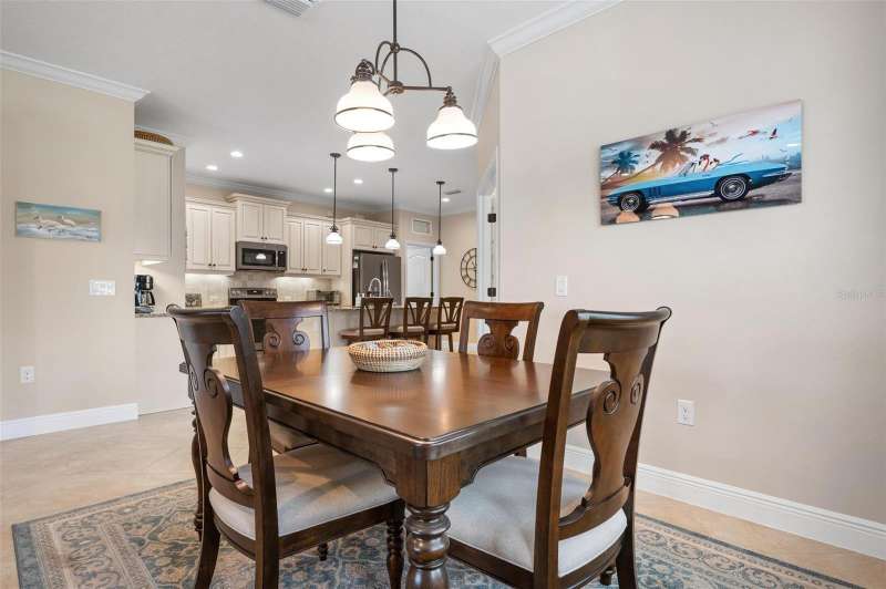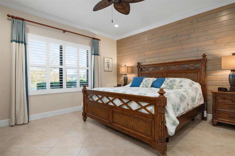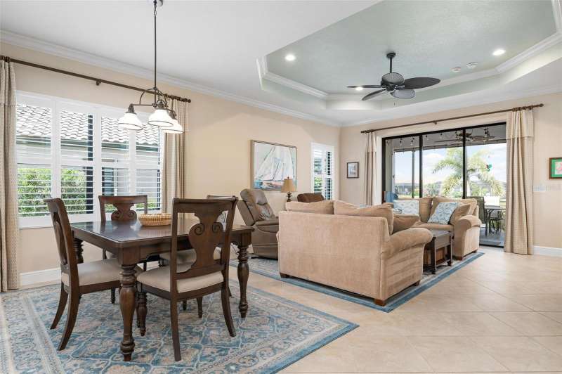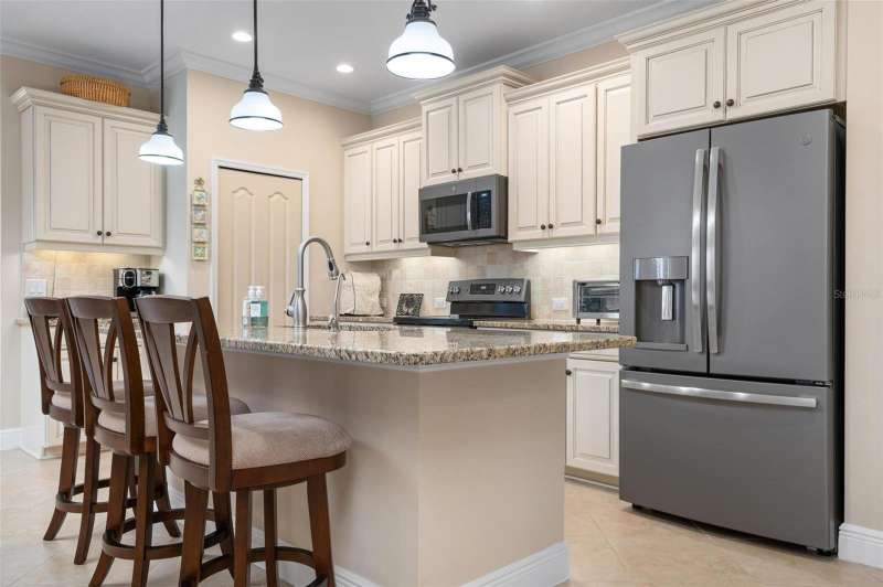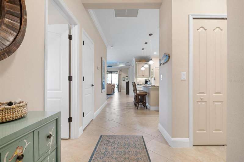 This amazing Villa truly has it all...3 bed/2 bath plus den, showcasing attention to every detail. Inside, the home is adorned with plantation shutters and closet systems to offer organized storage. The elegance continues with crown molding and coffered ceilings. While the kitchen boasts roll out drawers, under cabinet lighting, pantry and granite countertops. Tiled floors span the entire house, providing an elegant look. This look is complemented by the outside tiled, extended lanai that looks out to the beautiful full view of pond. The hurricane shades provide extra protection against harsh weather. Additional amenities include water softener, reverse osmosis and a hot water recirculation system. Ceiling fans throughout for optimal cooling. The laundry is equipped with cupboards, stationary tub and drying rack. This home features a whole house generator, and a whole house surge protector to ensure uninterrupted power. The garage is a standout with epoxy floors, insulated ceiling and doors, ample storage racks and cabinets and best of all...It has an AC unit to keep your treasures intact from the heat. The home has been freshly painted inside and out, and a new dishwasher was added in 2023.