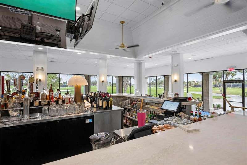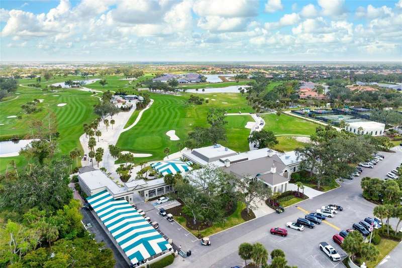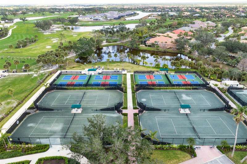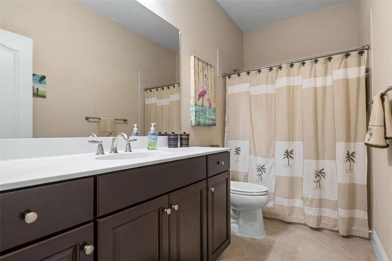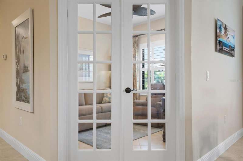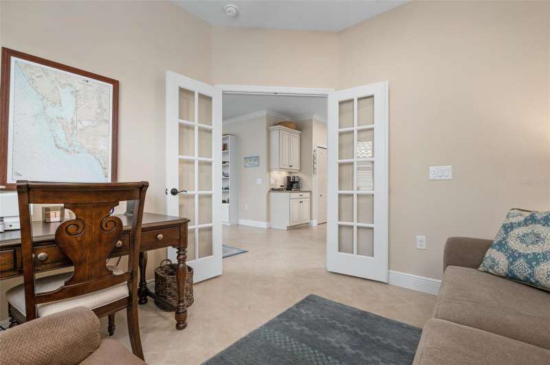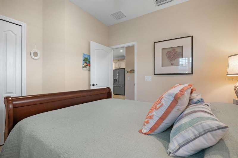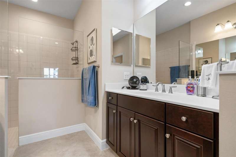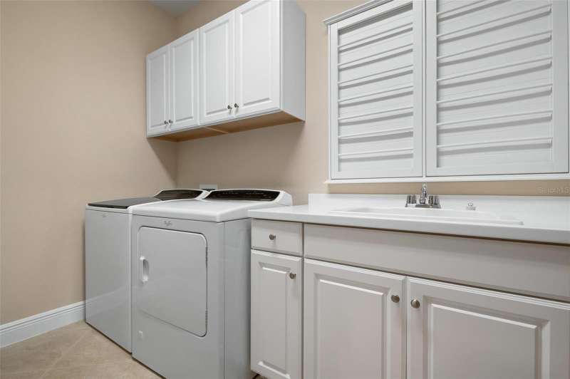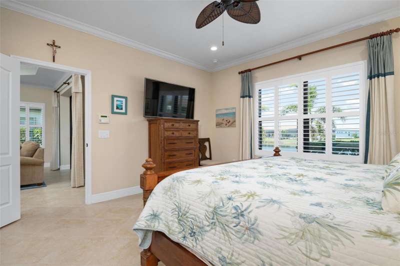 This amazing Villa truly has it all...3 bed/2 bath plus den, showcasing attention to every detail. Inside, the home is adorned with plantation shutters and closet systems to offer organized storage. The elegance continues with crown molding and coffered ceilings. While the kitchen boasts roll out drawers, under cabinet lighting, pantry and granite countertops. Tiled floors span the entire house, providing an elegant look. This look is complemented by the outside tiled, extended lanai that looks out to the beautiful full view of pond. The hurricane shades provide extra protection against harsh weather. Additional amenities include water softener, reverse osmosis and a hot water recirculation system. Ceiling fans throughout for optimal cooling. The laundry is equipped with cupboards, stationary tub and drying rack. This home features a whole house generator, and a whole house surge protector to ensure uninterrupted power. The garage is a standout with epoxy floors, insulated ceiling and doors, ample storage racks and cabinets and best of all...It has an AC unit to keep your treasures intact from the heat. The home has been freshly painted inside and out, and a new dishwasher was added in 2023.