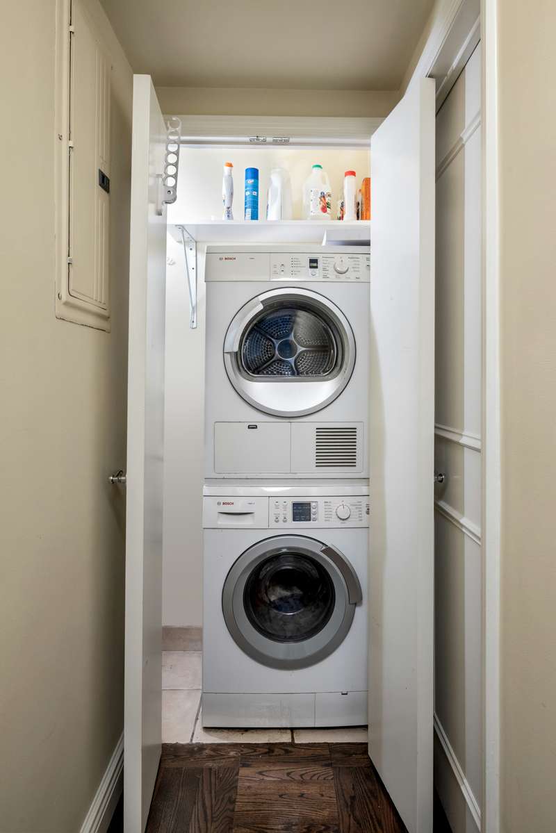 Flanked by two oversized closets, the entrance gallery leads to a beautifully proportioned 14' wide living room with generous seating that sets the tone of this warm and welcoming home. ; The windowed kitchen has been opened to accommodate additional shelving and glass fronted cabinetry; the dining area is big enough to devote one wall to a built-in cabinet that is both service and bar area. ; Overall, this is a loft-like space making it ideal for entertaining, as formal or informal as you like. ; ; Part of what makes this gracious home so appealing, in addition to its many closets, is its generous split-bedroom layout. ; ;The primary bedroom has two walk-in closets, a wall of built-ins and bathroom ensuite. ; The second bedroom, nearly as large, has a walk-in closet as well. ; ;
