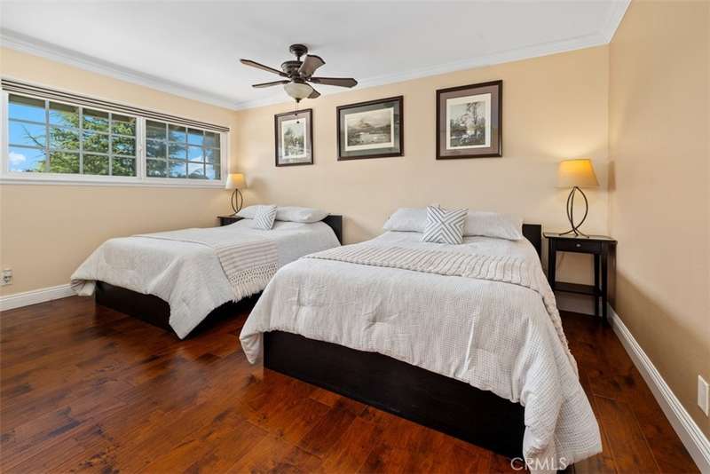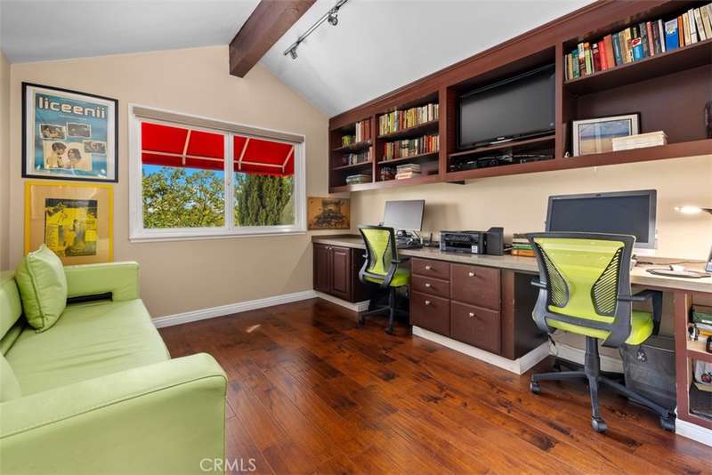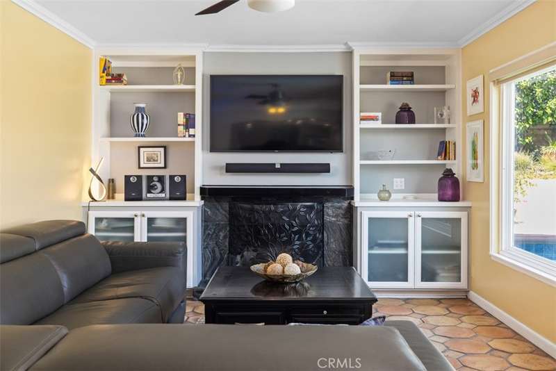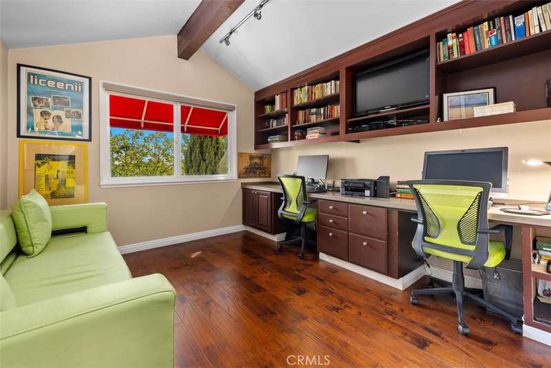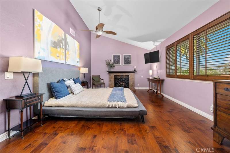 The primary suite is a luxurious retreat, highlighted by a fireplace, wood flooring, plantation shutters, mirrored closets, and a beautifully remodeled spa-inspired bath. Three additional rooms provide flexibility--two generously sized rooms that share a remodeled bathroom, plus a fourth room thoughtfully designed as a home office with built-in cabinetry.