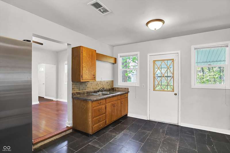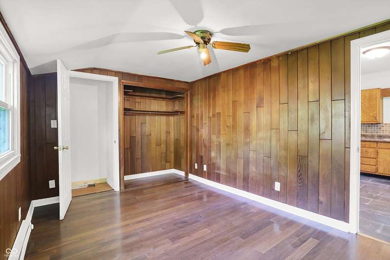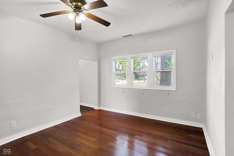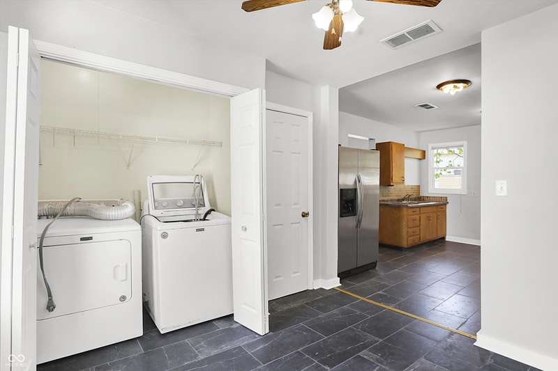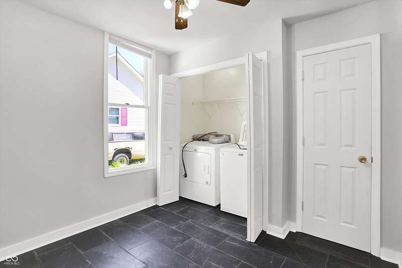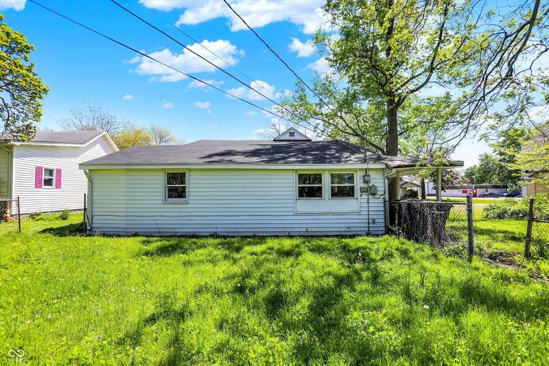 Easy Living with this 1-Level renovated home in thriving Elwood. The majority of the home features Brazilian Cherry Hardwood Floors! The fully updated interior includes a stylish bathroom featuring tiled flooring, a tiled tub/shower surround, a new vanity, mirror, and contemporary lighting. The kitchen comes complete with all major appliances, and the included washer and dryer make moving in effortless. Most of the windows have been upgraded to energy-efficient vinyl, helping keep utility costs down while letting in abundant natural light. Enjoy the outdoors with a spacious, partially fenced backyard-perfect for relaxing, entertaining, or pets-and a charming front porch that adds great curb appeal. Its peaceful and quiet living in Elwood! With acceptable offer seller will have front portion of home's roof replaced (back portion is newer) including any fascia work and gutters. Roof does not leak.