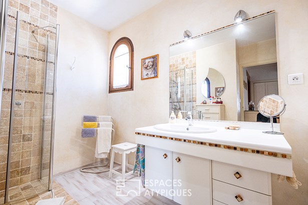 The upper floor features a cathedral-style living room of over 60 m2, bathed in light thanks to large openings, with a separate kitchen as a backdrop. On the night side, two beautiful bedrooms, a shower room, a separate toilet, and a dressing room complete the ensemble. A 55 m2 open-air terrace, equipped with a barbecue, completes this level and offers an exceptional outdoor living space, sheltered from view.
