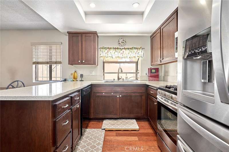 This is a rare opportunity to own a spacious 2 bedroom, 2.5 bathroom condo in a cozy community with a prime location. Upon entering, the living room greets you with hardwood floors, a brick gas-burning fireplace, modern wet bar, and recessed lighting. The kitchen boasts plenty of cabinet and counter space, a bay window, and a spacious pantry. Just around the corner is a well-situated half bathroom, and large sliding doors off the living room provide natural light and access to the enclosed patio for outdoor relaxation. Upstairs, the dual primary bedrooms afford privacy and comfort, each with its own ensuite full bathroom and double closet. The laundry room is conveniently situated upstairs between the bedrooms. Downstairs is an attached oversized 2-car garage with additional storage space. This 20-unit community has secured gated entry along with a community pool and spa. Enjoy convenient living located just steps from a park, freeway access, and major retail shopping centers.