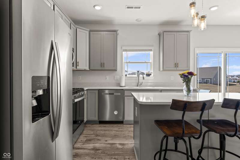 The last Campton model available in Danville's sought-after Miles Farm neighborhood. Sitting on a premium pond-view lot, this one's got all the space you've been craving and then some. Nearly 3,000 total square feet, 5 bedrooms, 3 full baths, and a layout that actually works for real life. The main level features an open-concept kitchen with a big island, walk-in pantry, sleek finishes, and updated hardware throughout-flowing right into the dining and living spaces for easy hosting or everyday life. You've also got a main-level bedroom and full bath, perfect for guests or multi-gen living, plus a private office tucked away for remote work. Upstairs, the massive loft gives you a second living space with unbeatable pond views. The primary suite is oversized and features double walk-in closets and a spa-like en suite with a large walk-in shower and double vanity. Three more generous bedrooms and a full bath round it all out upstairs. Updated fans and lighting, LVP flooring with plush carpet in the right spots, an oversized 3-car garage, and access to one of the best community setups in Danville-pool, pickleball and basketball courts, cornhole, multiple parks, and a full amenity/event center. Plus, you're just a short walk to Danville's historic downtown square with local shops, restaurants, and small-town charm. If you're looking for new construction with room to grow, water views, and one of the best floorplans in the neighborhood-this is the one.