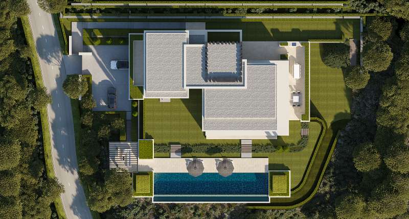 Nestled within this tranquil setting is a private collection of four contemporary villas — three of which are currently available. Each villa occupies a generous plot of approximately 3,000 m², surrounded by pine trees and designed to foster a seamless connection with nature. The exteriors showcase sleek lines and sculptural forms, complemented by private swimming pools, landscaped gardens, and panoramic terraces that capture sweeping views of the sea, Gibraltar, and even the African coastline on clear days.