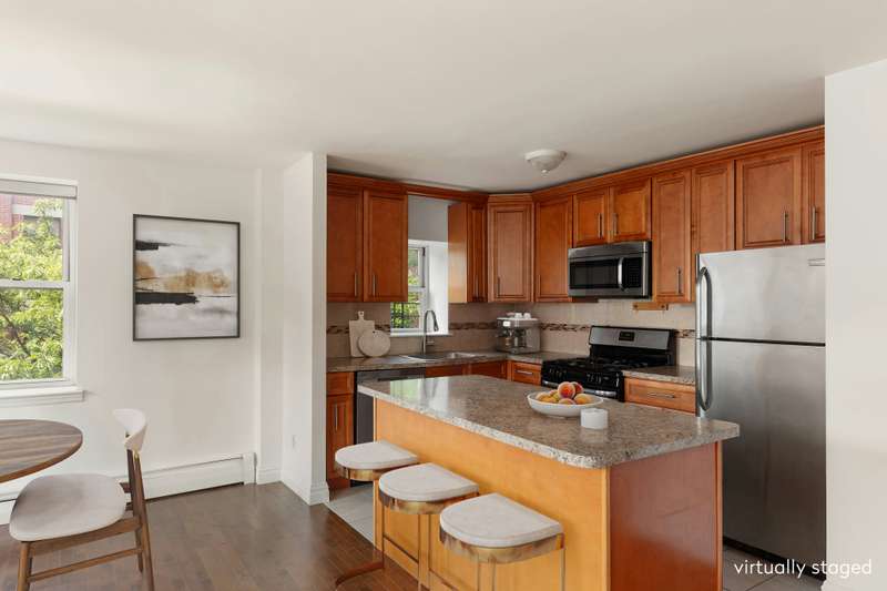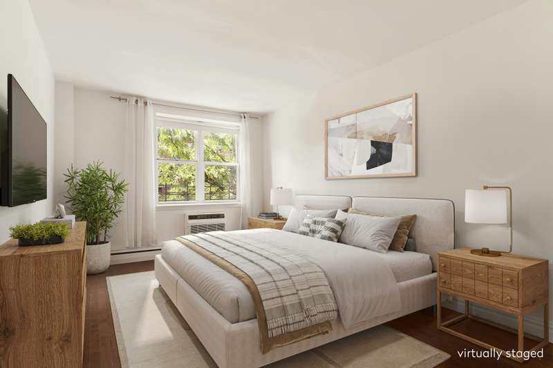 Welcome to this sun-filled 2-bedroom, 1.5-bathroom corner co-op, ideally positioned with open south and east exposures that bathe the home in natural light throughout the day. A gracious foyer leads into the large open kitchen and expansive living area, perfect for entertaining or relaxing at home. The smart split-bedroom layout offers privacy and flexibility, while the convenience of a vented in-unit washer/dryer adds modern ease.