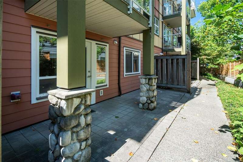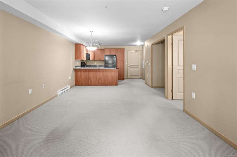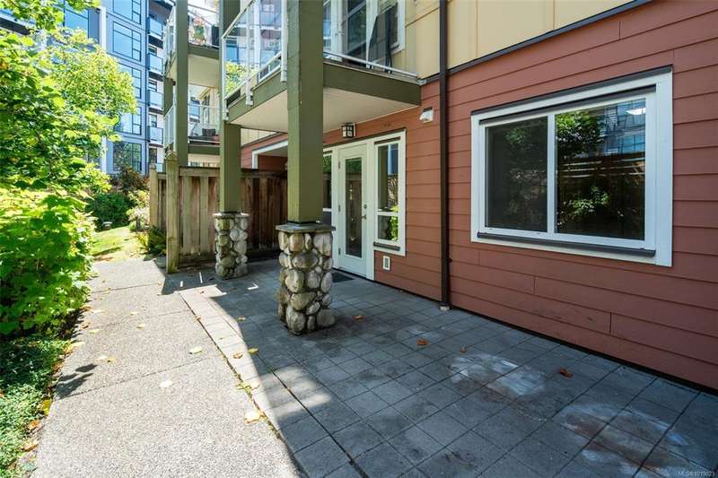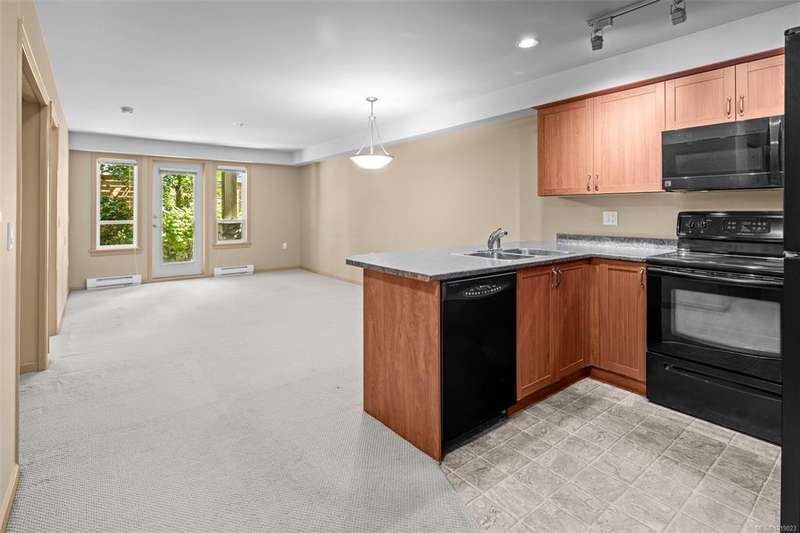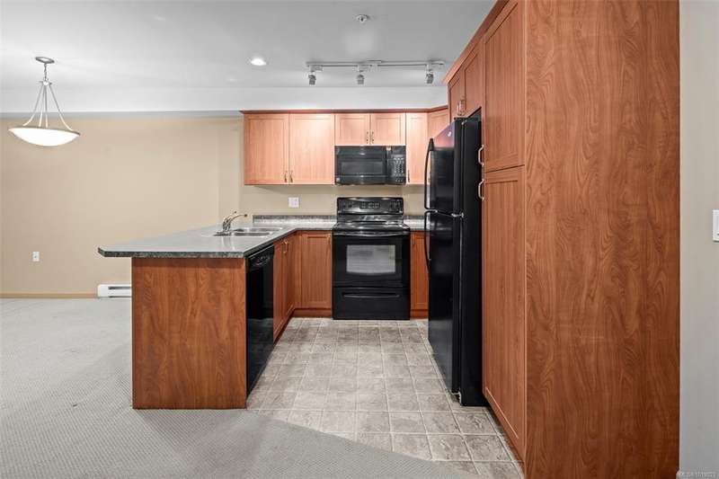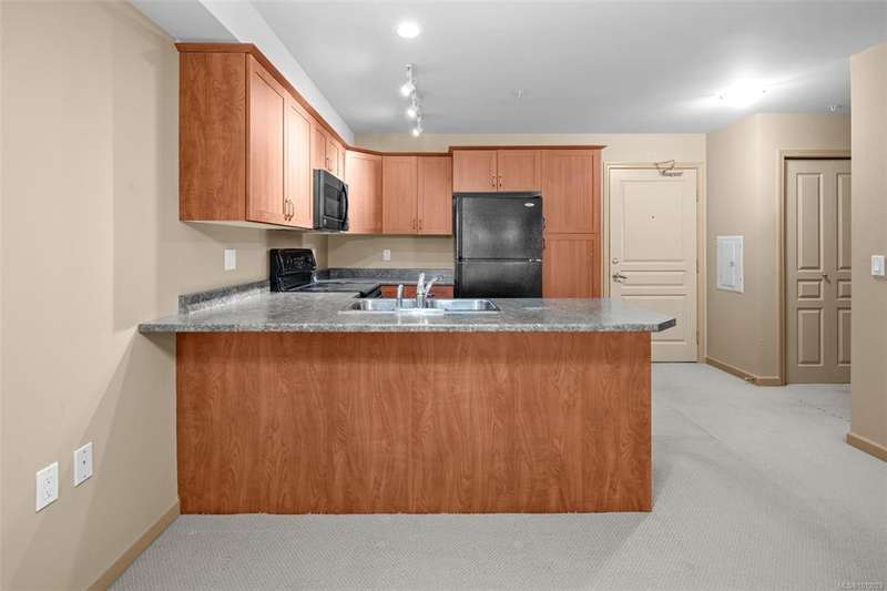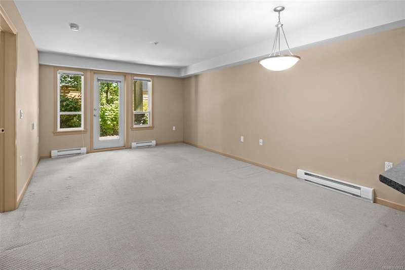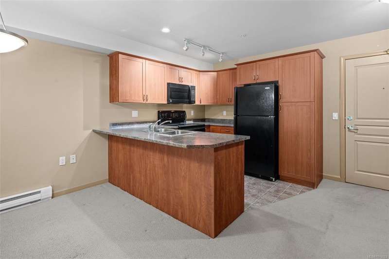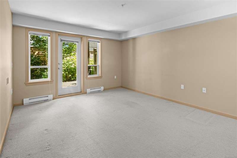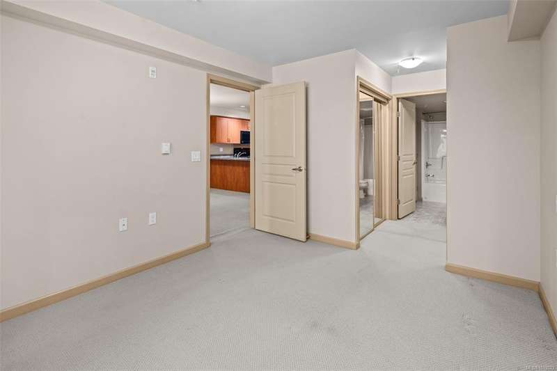 Welcome to McConnell Place, a perfect fit for first-time buyers or those looking to downsize with ease. This accessible ground floor 1 bed, 1 bath home offers over 650 sq ft of well designed living space, featuring an open concept kitchen, in-dining, and living area, plus a spacious primary bedroom with walk-through closet and cheater 4pc ensuite. Step out to your large private patio - ideal for morning coffee or evening BBQs. The well managed building includes secure underground parking, guest parking, bike storage, private locker, Japanese garden, rooftop style patio and fitness room. Pet friendly (2 dogs/cats, no size limit) and perfectly located near transit, parks, Colwood Golf Course, Westshore Mall and all amenities. This unit is priced remarkably well and won't last long!