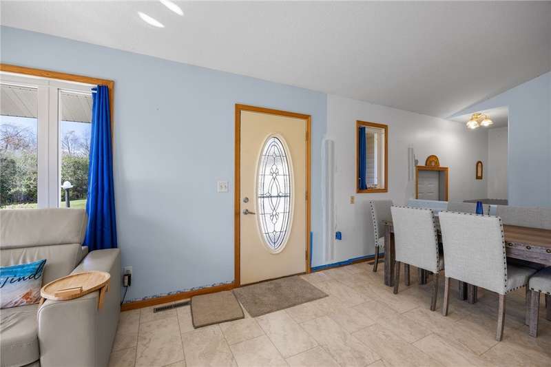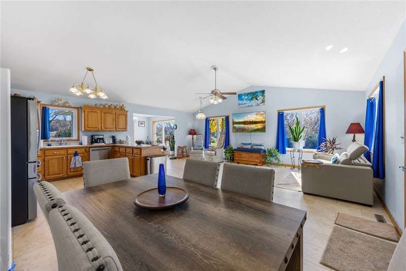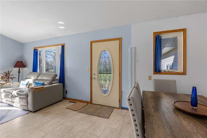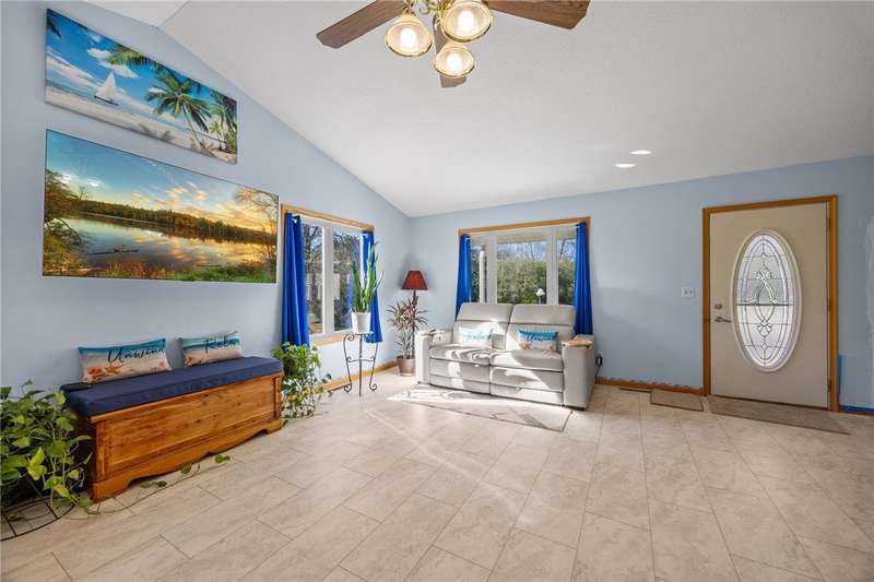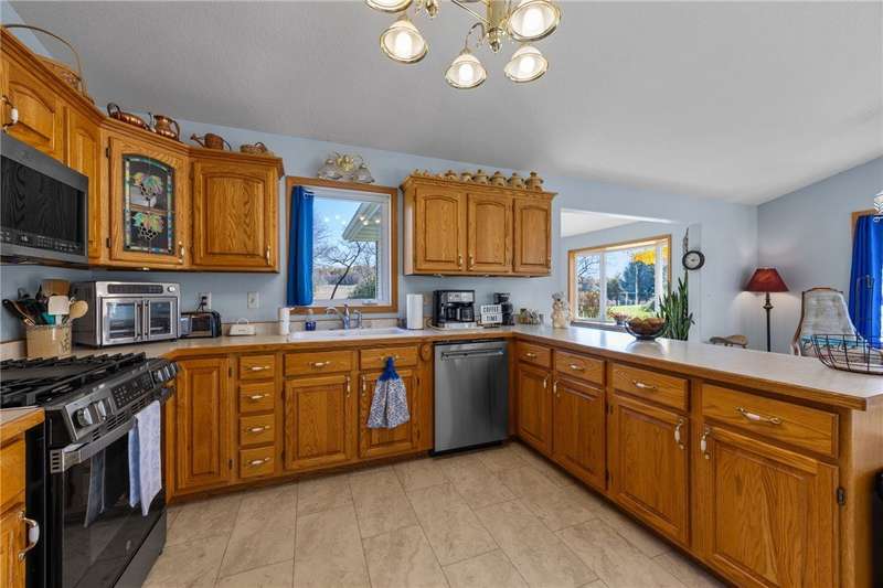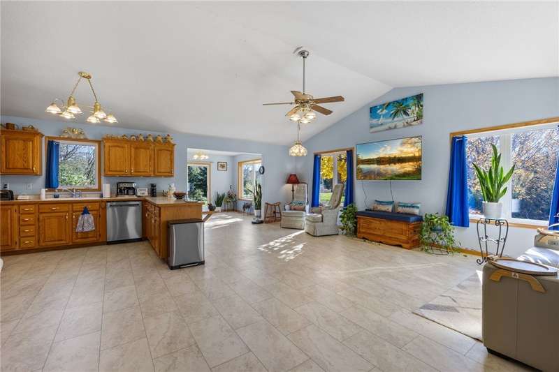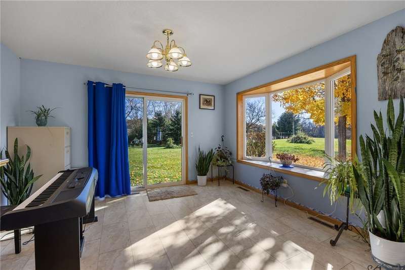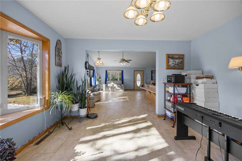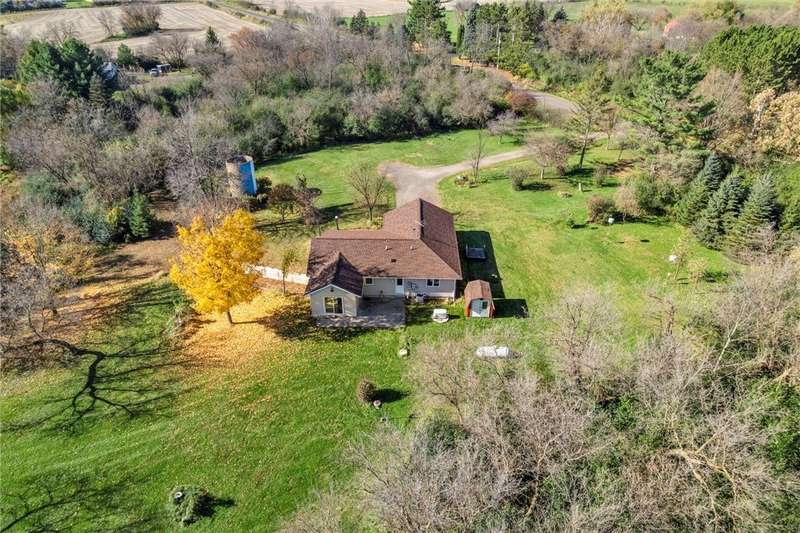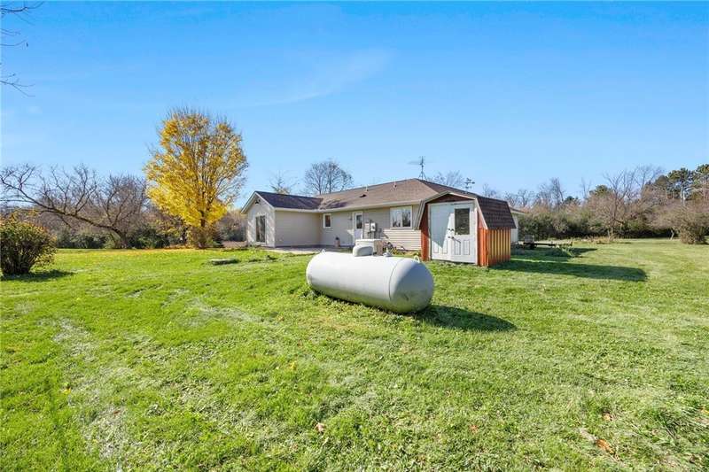 Beautifully maintained custom-built home with an open floor plan and thoughtful updates throughout, located on 5 acres! The vaulted kitchen and dining area flow into a bright south-facing sunroom, perfect for enjoying natural light. Relax on the front porch or back patio while taking in the peaceful, landscaped yard with country views and visiting wildlife. The main level features a private owner's suite with a walk-in closet and new carpet, main floor laundry, and an insulated, heated garage. The lower level offers in-floor heat, a spacious family room, a second bedroom, a full bath, and a bonus room ideal for office or guest space. There's also potential to add a walk-out patio, with some excavation already started. MANY NEW UPDATES include stainless steel kitchen appliances, luxury vinyl tile flooring in the kitchen, dining & sunroom, washer and dryer, tankless water heater, water softener, forced air furnace, heat pump, roof shingles, a 22,000-Watt whole house generator, garage furnace, and MORE! Heat pump provides heat to 25 degrees and air conditioning, a huge savings on propane gas and electricity. Move-in ready and set in a private, country setting, this home truly has so much to offer!