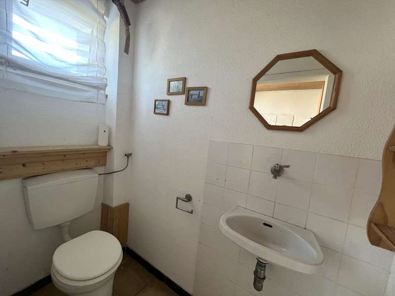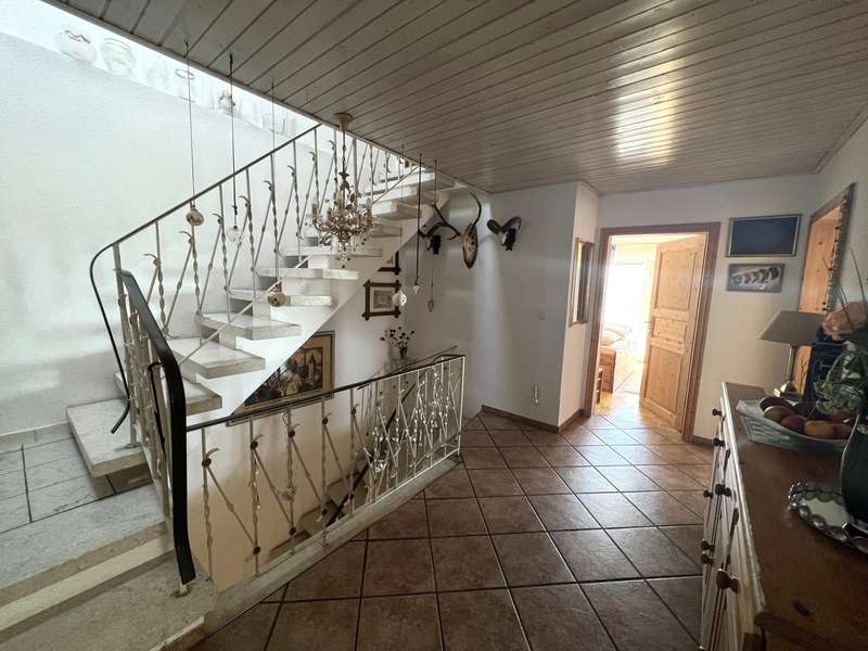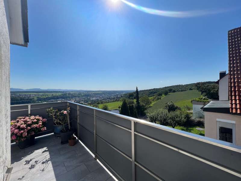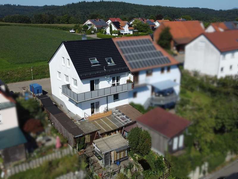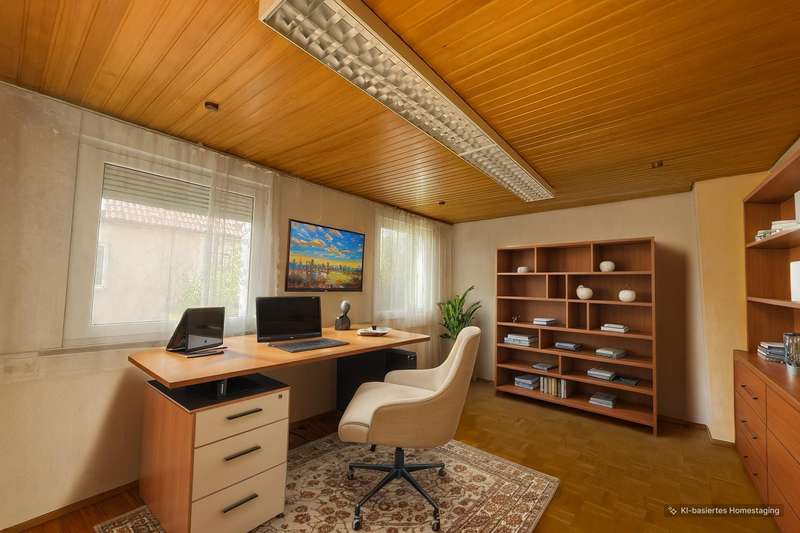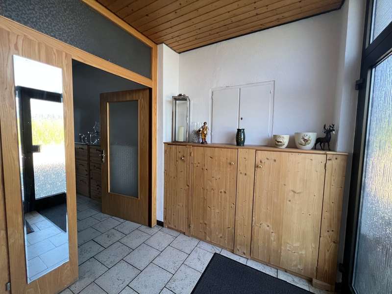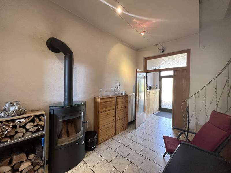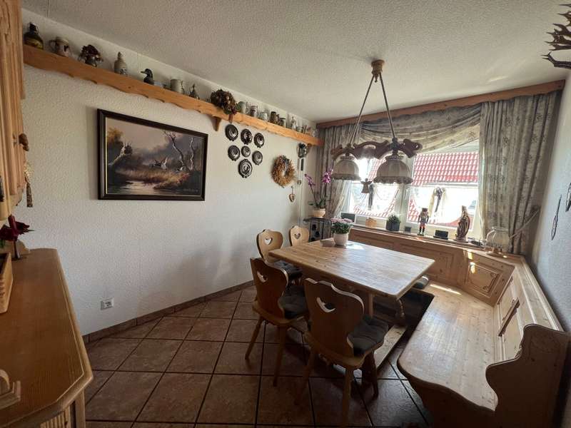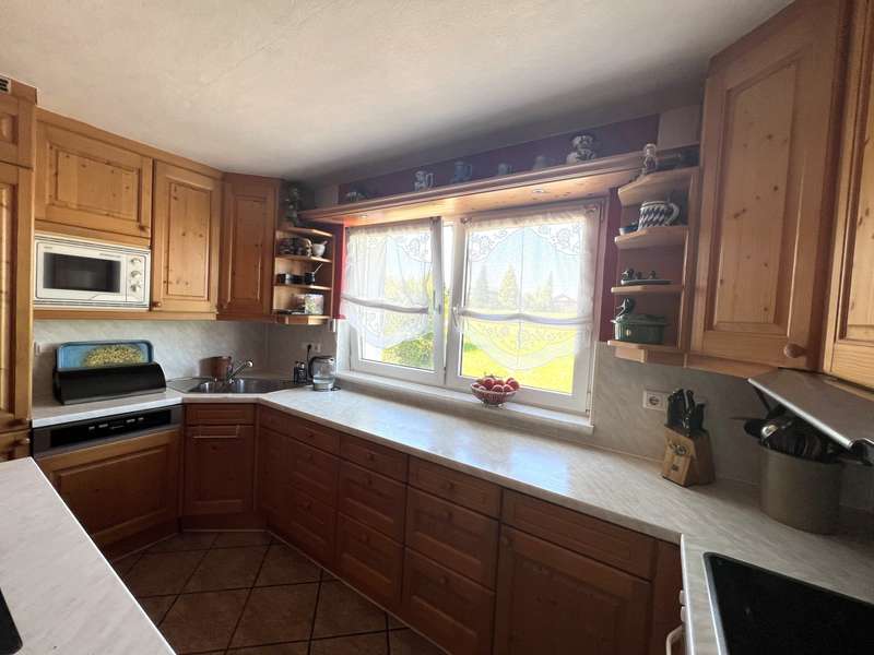 Those who live here enjoy the view over the picturesque landscape every day - whether from the large balcony or from the living room. This spacious semi-detached house, built in 1968, offers approx. 175 m² of living space spread over three floors and stands on a 339 m² plot. On the first floor, you are welcomed by a spacious entrance area with a cozy Swedish stove. A guest WC and two bright, spacious offices offer ideal conditions for a home office, hobbies or as a storage room. These can also be used as bedrooms. One of the rooms has access to one of the two balconies. The cosy, rustic style with natural materials, which runs through the entire house, also characterizes the upper floor: here you will find a dining room with a cosy country house character, an adjoining kitchen and a light-flooded living room with a cosy wood-burning stove. Through this you can reach the lovingly designed balcony, which offers a wonderful panoramic view. On this floor, the doors have been replaced with real pine wood doors. A bedroom, a daylight bathroom with shower and bath and a separate WC complete this living level. On the top floor there is another hallway with a small kitchenette, a utility room with connections for the washing machine, two bedrooms and a bathroom with a bathtub. This floor is mostly in its original condition and offers great potential for modernization according to your ideas. The garden with its small pond surrounded by plants and the existing ancillary uses offers a wide range of design options. Part of the area is currently used for storage purposes - including storing wood for the Swedish stove. The cellar with workshop and the boiler room are accessible from the outside. A large garage is available for vehicles, supplemented by outdoor parking spaces for up to four cars. A number of modernizations have already been carried out in recent years: The façade has been insulated, as has the roof, which has also been re-roofed. The balcony was renewed and the windows replaced. The house can be heated via the oil-fired central heating system; the owners currently use the wood-burning stove almost exclusively. This property combines wonderful views and space for your individual living dreams. Let yourself be inspired by the possibilities during a personal viewing.
