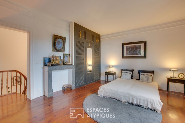 The interior spaces benefit from beautiful light thanks to numerous openings onto the garden. The ground floor is organized around a vast living room with a fireplace and a dining room adjoining a semi-open kitchen.