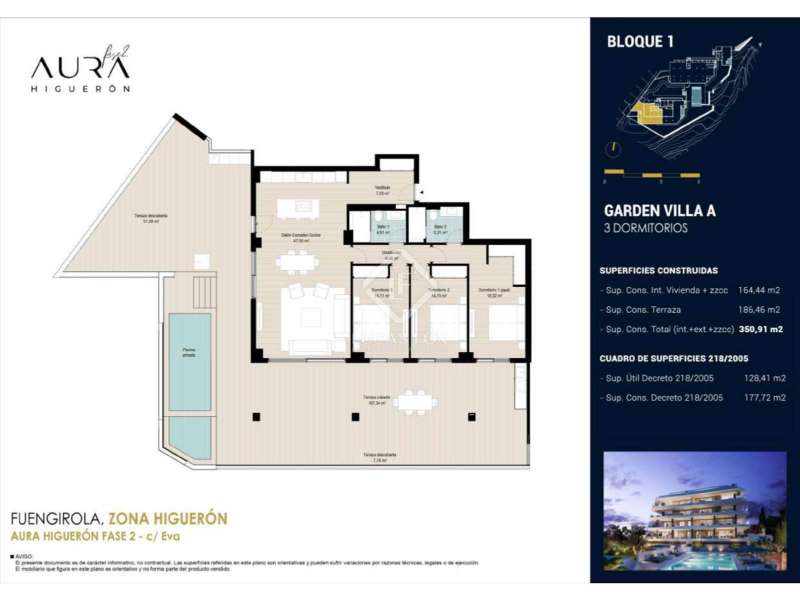 Lucas Fox presents Aura Higuerón, a private new build development with luxurious features, exceptional qualities and panoramic views of the Mediterranean Sea, high in the Higuerón area, a distinguished community in Benalmádena, Costa del Sol. The exquisite residential complex of Aura Higuerón stands as a low-density jewel, composed only of 33 exclusive residences, meticulously distributed in three majestic blocks. This ground floor apartment has clearly differentiated day and night areas . Upon entering, the day area is arranged on one side, with the living-dining room and the open-plan kitchen, with access to a huge terrace, equipped with an outdoor kitchen and shower and a chill-out area. The terrace also leads to an exclusive garden with an infinity pool. Back inside, on the other side, there are two double bedrooms with access to the terrace, a bathroom and the magnificent main bedroom with its private bathroom, dressing room and access to the large terrace. The property has spacious and bright rooms, thanks to the open-plan kitchen and large floor-to-ceiling windows, while offering unmatched comfort. In addition, each property includes underground parking and storage room. Aura Higuerón presents exclusive details and spaces that adapt to your preferences, with countless options available (see quality report). In addition, you will enjoy exclusive features of the development that include splendid swimming pools with sea views, as well as heated indoor pools, each located in its respective block, accompanied by its exclusive gym and spa areas . All of this is protected by a rigorous access system using security codes, which guarantees the privacy and tranquility of the development. Aura, presented under a visionary concept of integration, is located in a unique natural environment, with special attention to the conservation of native species. In addition, the Aura area offers a wide range of included amenities and amenities, such as organic gardens, extensive sustainable gardens of more than 100,000 m², picnic and rest areas , bicycle and pedestrian paths, paths for walking and jogging, parks for pet friendly and plenty of entertainment options. The outstanding location of Aura, at the top of the El Higuerón region, gives its privileged inhabitants panoramic views of the coast and the Mediterranean Sea, which consolidates Aura as an exclusive development. In the area near Aura Higuerón, you can enjoy a wide range of activities, amenities and amenities, in an enclave strategically located between different urban centers, without giving up privacy. You will be just 15 minutes away from Malaga international airport and just 20 minutes from both the centre of Malaga and the centre of Marbella. If you are looking for privacy, luxurious features, exceptional qualities and panoramic views of the Mediterranean Sea, do not hesitate to contact us for more information.