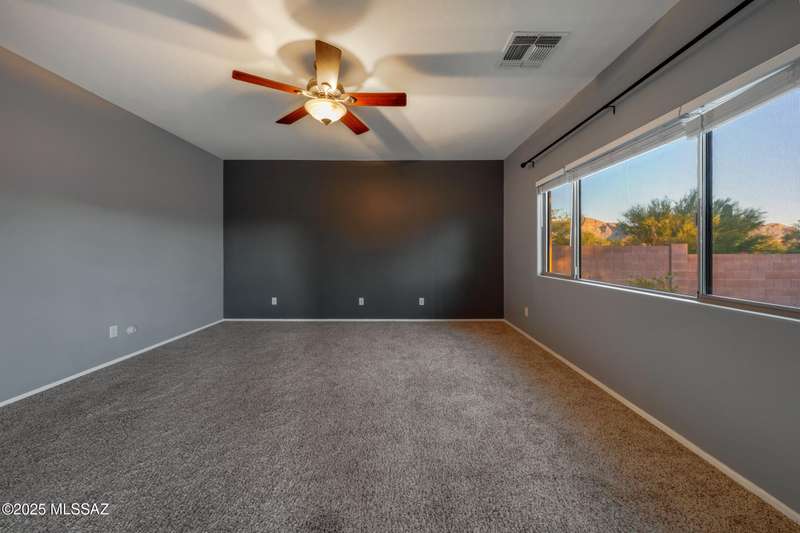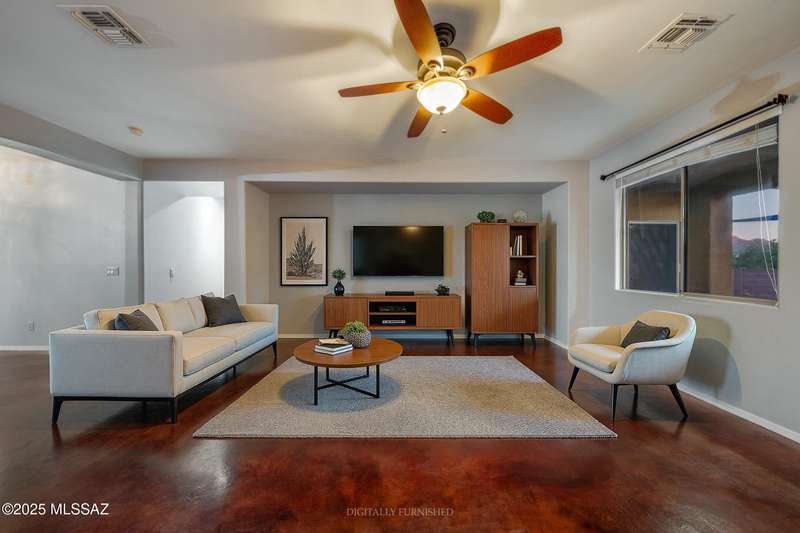 Elegant home with 3-car tandem garage in the Verde Ranch community of Oro Valley! This home features an inviting open layout with soaring ceilings and a versatile great room design that seamlessly connects the kitchen and dining area.The chef-inspired kitchen showcases extended-height cabinetry with crown molding, Corian countertops, custom tile backsplash, stainless steel appliances, and a large island with breakfast bar seating--all enhanced by picturesque Catalina Mountain views from both the kitchen and great room.