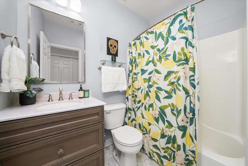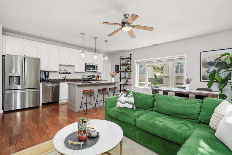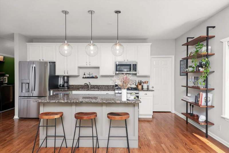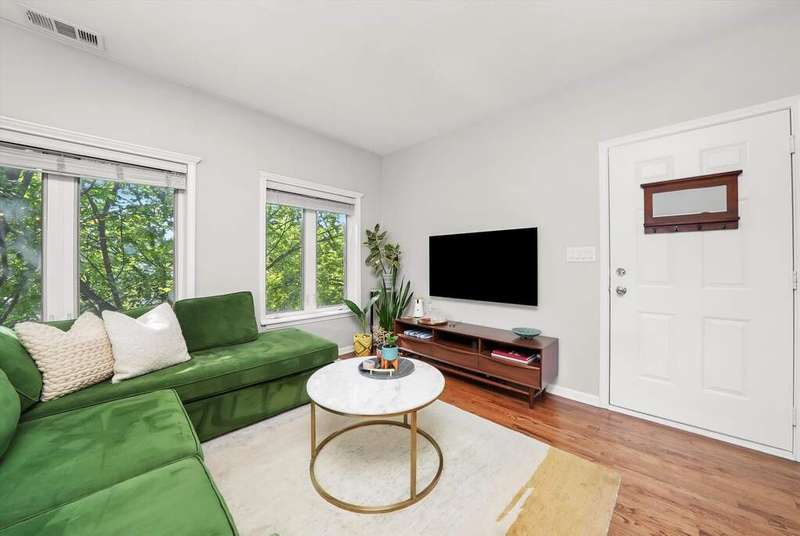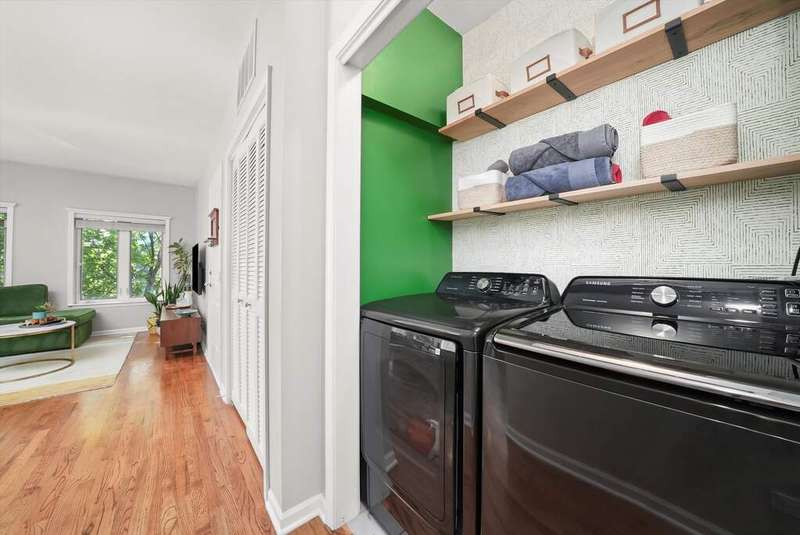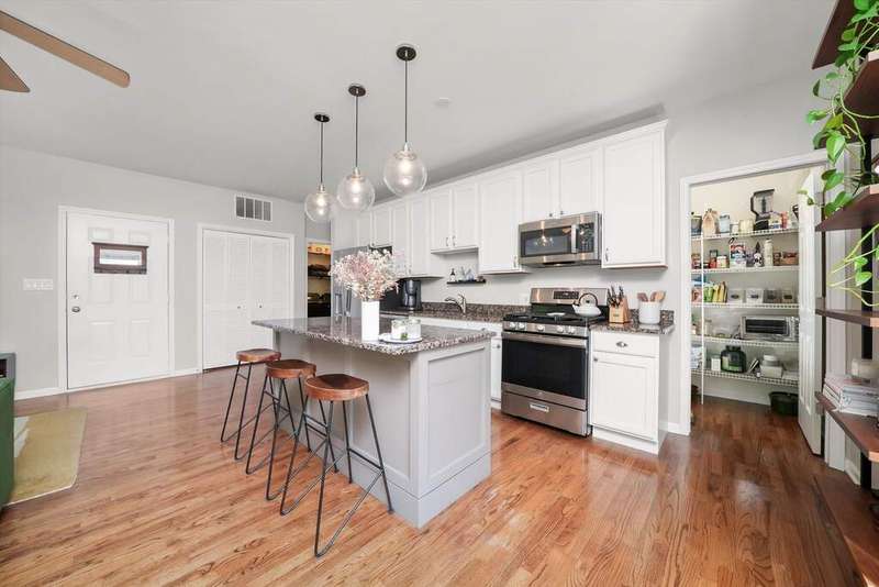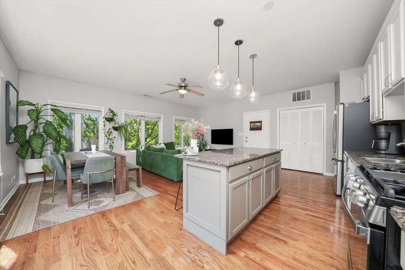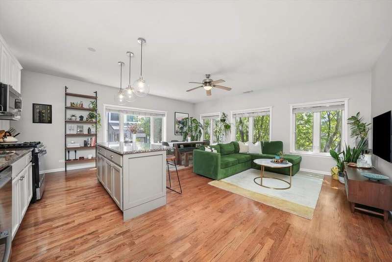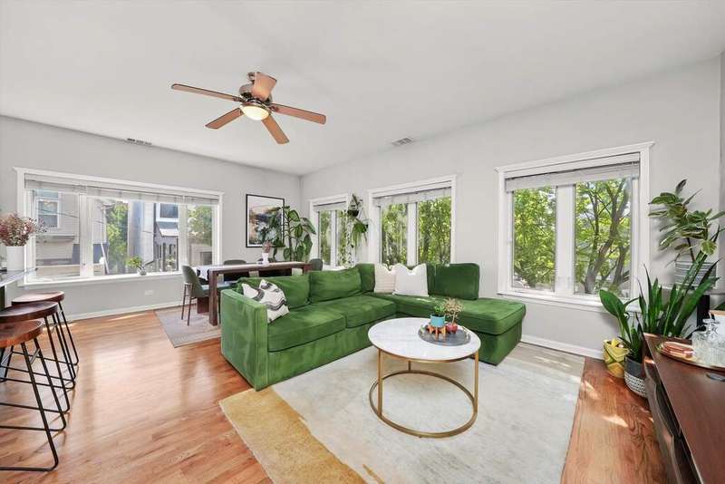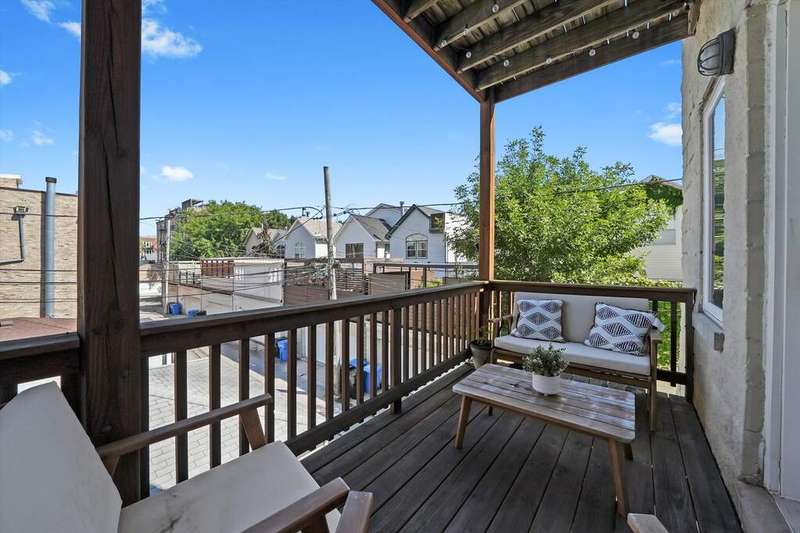 Beautiful 2 bed/ 2 bath condo that offers an extra wide layout with 9' ceilings and an abundance of storage, a long back deck, and on a beautiful tree lined street in Bucktown/ Wicker Park. It is filled with ample amounts of sunlight from East & North corner windows. Entertain in this white modern kitchen with shaker cabinet and a large gray island with beautiful modern glass pendant lighting, granite counter tops and newer stainless steel appliances(2023). Living, kitchen and dining room open concept layout, newer refinished stained hardwood floors, and enjoy your walk-in pantry closet. The large primary bedroom offers a beautiful accent square panel wall, Elfa organized walk-in closet, newer gray carpet, recently updated en-suite bathroom with slate gray tiling for the floor, white subway tile walk in shower, new vanity lights and mirror. Second bedroom has recently laid new hardwood floors, and organized closets. Second bathroom has modern vanity, honeycomb marble tiles, and white tiled shower with tub. Massive coat closet, and laundry closet with newer side by side washer and dryer(2022), newer furnace (2023)! Garage parking and an additional very large walk-in storage room included. Ideal Bucktown/ Wicker Park location on a quiet tree-lined side street, close to parks/playlots, 606 Trail, dining, shopping and nightlife, short walk to two blue line trains, Metra train, easy access to the highway and more!