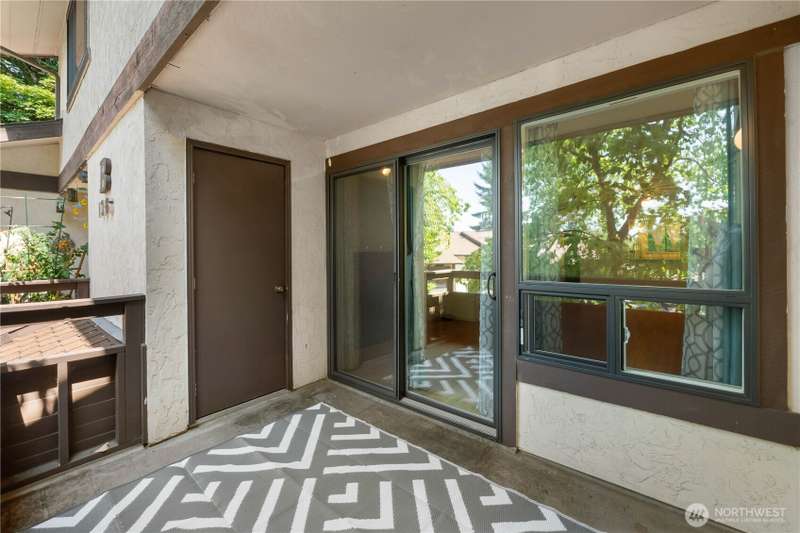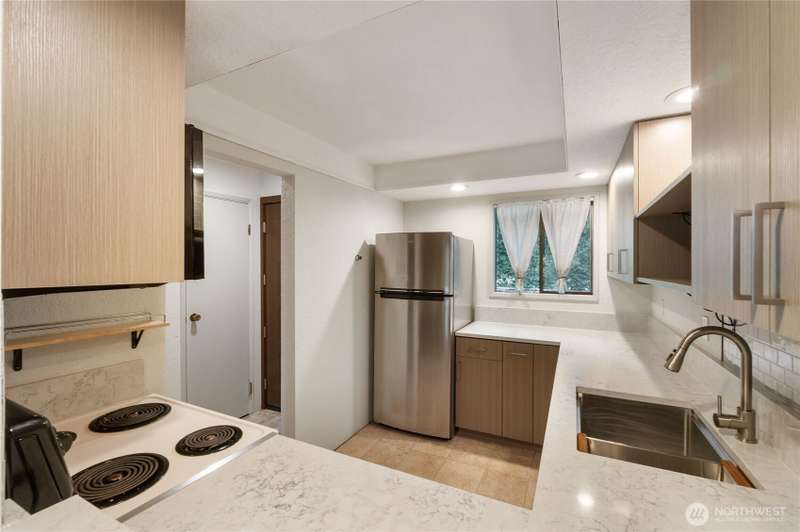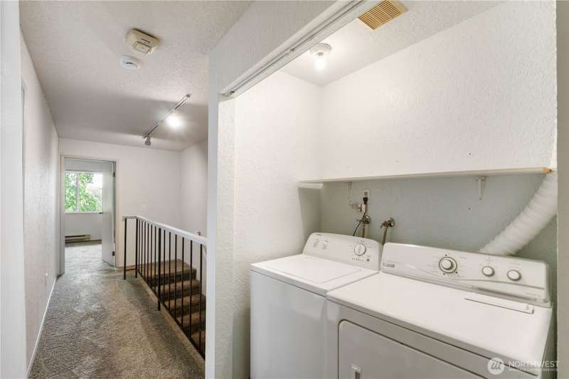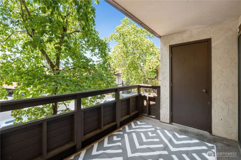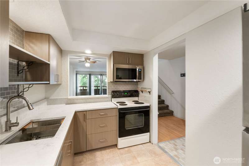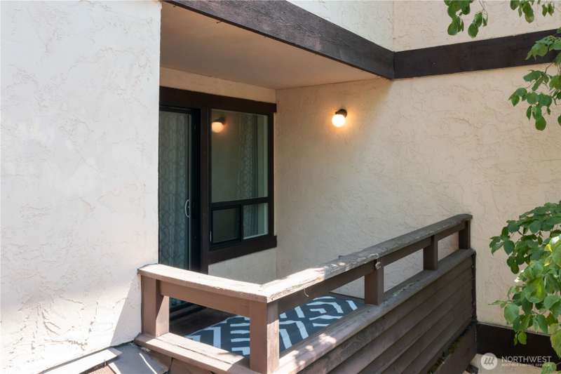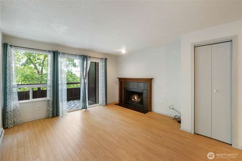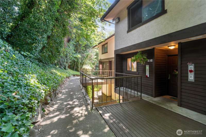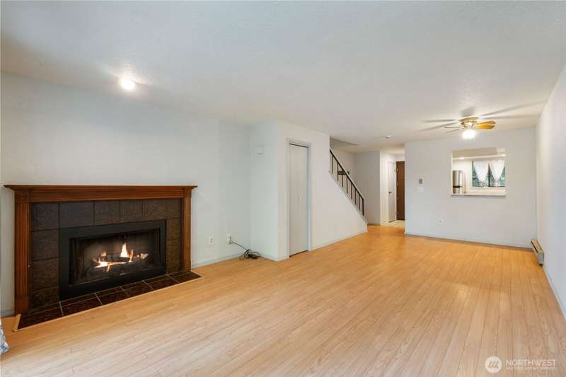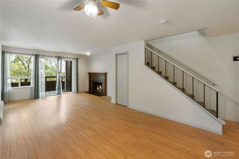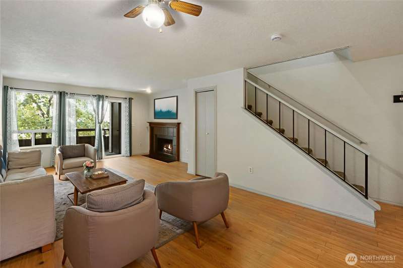 Welcome to this beautifully updated two-story condo offering light-filled, open-concept living. The main level features new double-pane windows and slider, a cozy fireplace, and access to a private deck—perfect for morning coffee. The upgraded kitchen includes stainless steel appliances, quartz countertops, and modern cabinetry. Upstairs are two spacious bedrooms, a primary suite with walk-in closet, dual-sink vanity, and in-unit laundry. Enjoy two reserved parking spaces (one covered), a second patio, and community BBQ area. Enjoy the best of both worlds—tranquil wooded living with easy access to shopping and dining.