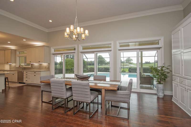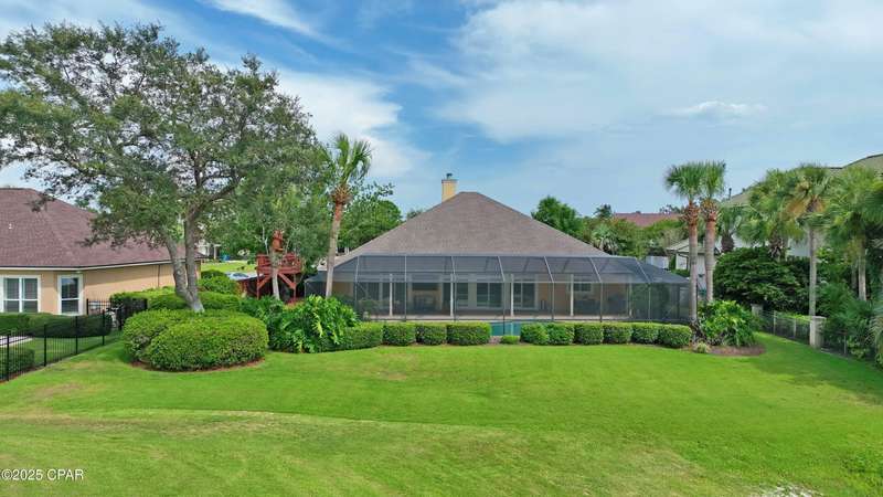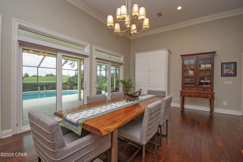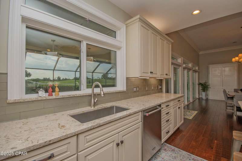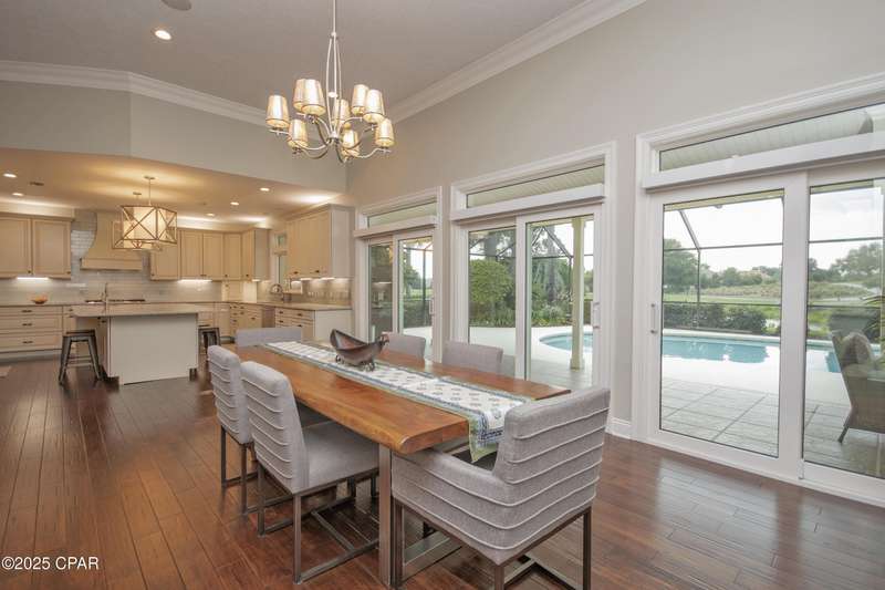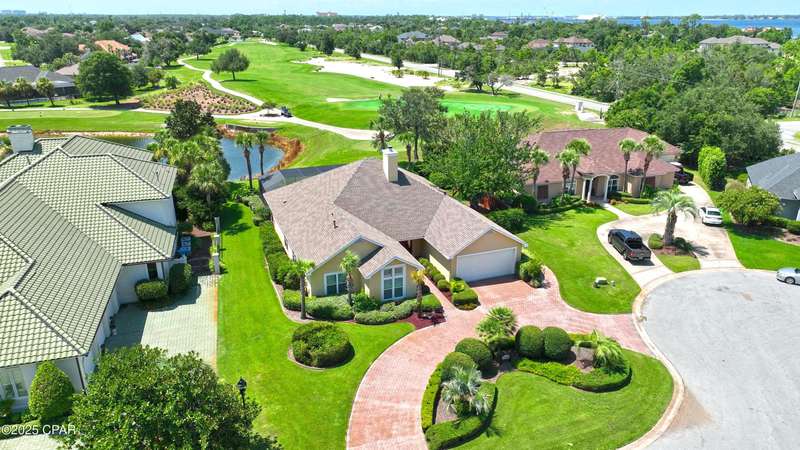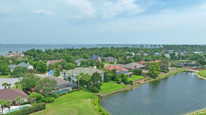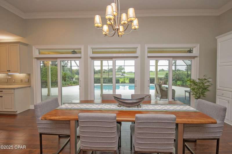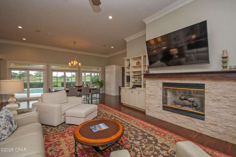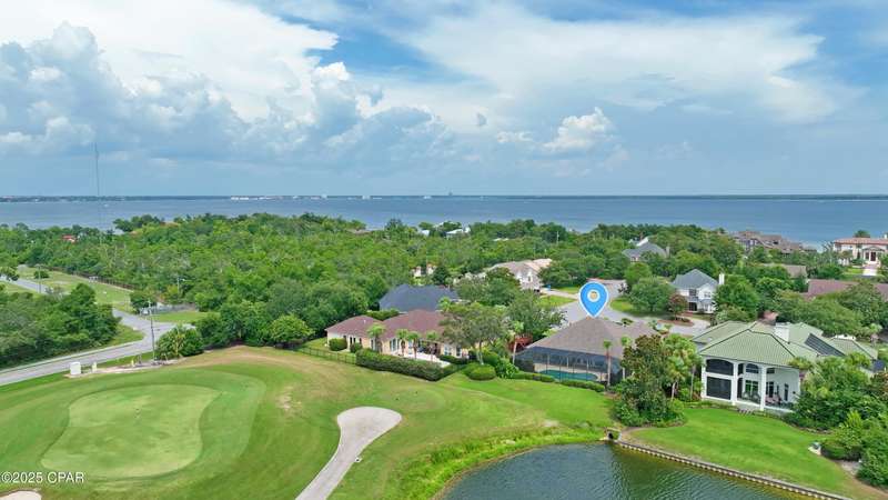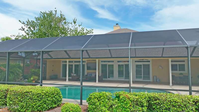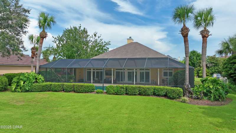 Welcome to Legend Hills in Bay Point! A private gated golf course community. The home is located between the 9th green and the tee box of the 10th hole par 3 over the water, and on the cul de sac of Dragons Ridge Road. This 4 bedroom, 3 bath home includes a beautiful open floor plan with incredible sunset views over the screened pool patio and the golf course. Soaring 12' ceilings with crown moldings, built-in cabinets, and the gas fireplace create an open welcoming home. The oversized 2-car garage includes a separate garage door for your golf cart, two large closets, built-in storage cabinets, and polyurea floor coating with a lifetime warranty. Renovated in 2018 after Hurricane Michael, the home features a new 3-dimensional shingle roof, spray-foam insulation, new HVAC systems, all new hurricane-rated windows and doors, engineered acacia hardwood flooring, completely renovated kitchen (new cabinets, quartz countertops, KitchenAid stainless steel appliances, etc.), Waypoint cabinets in the kitchen, great room, and master bathroom, a new pool screen enclosure, refinished gunite pool, new pool pump & filter, and more. The master bathroom includes a huge walk-in closet and the frameless glass shower includes a steam generator with bluetooth speakers, lighting, and aroma therapy. Bay Point residents have 24-hour security, gated entry, the Nicklaus Golf Course, the Point South Marina that hosts the annual Bay Point Invitational Billfish Tournament, and a golf cart friendly community. Often called the best neighborhood in Bay County. The home is vacant and easy to show. Call today to schedule your private tour and submit your offer.