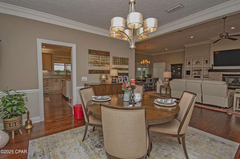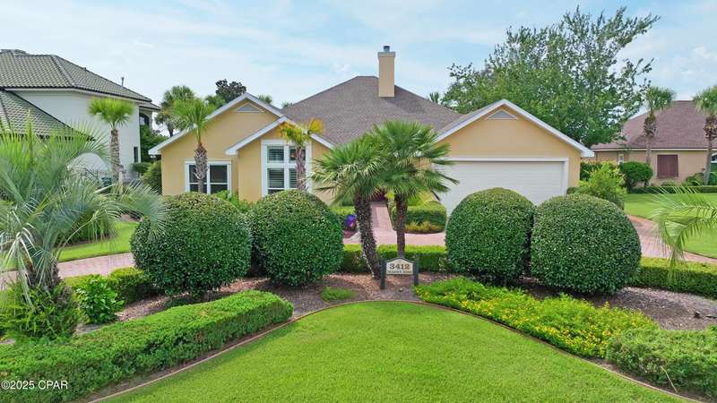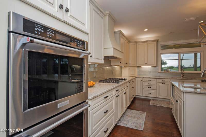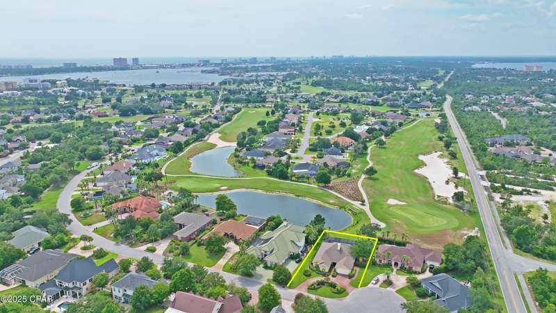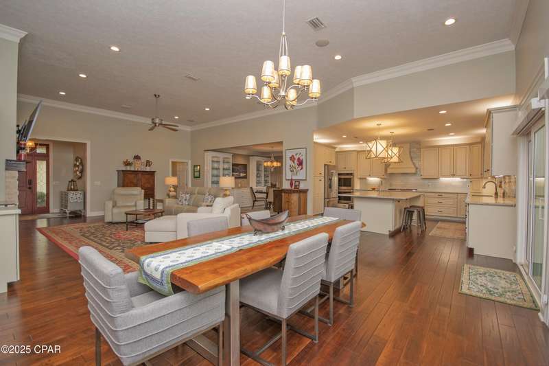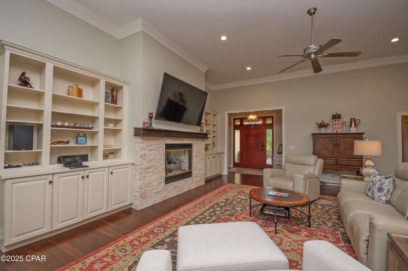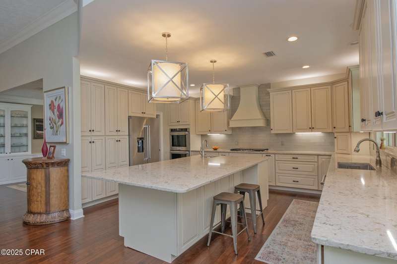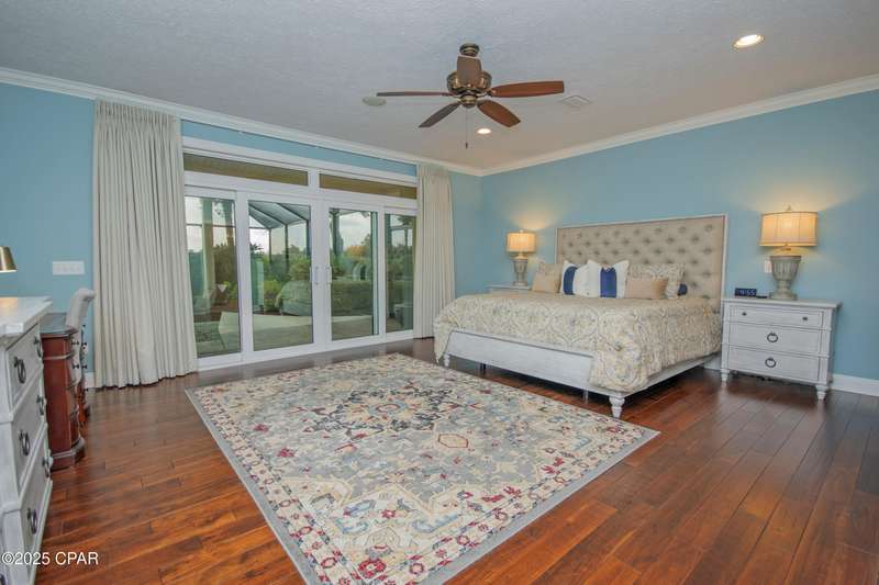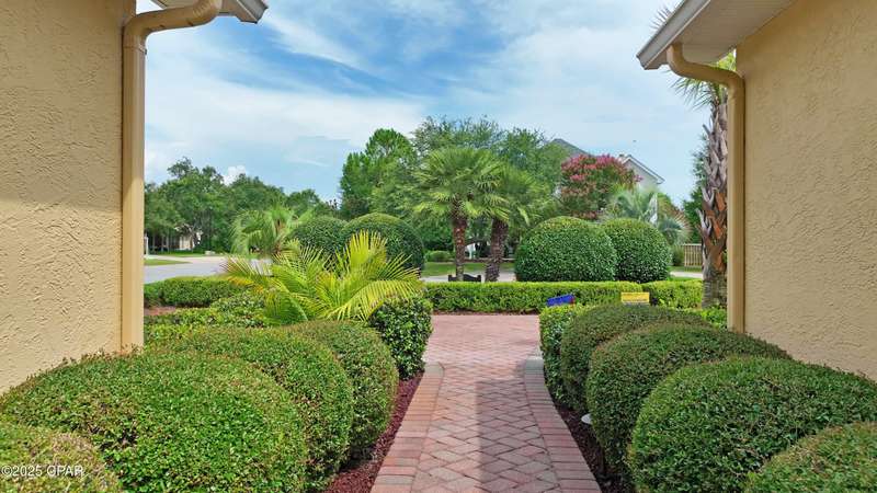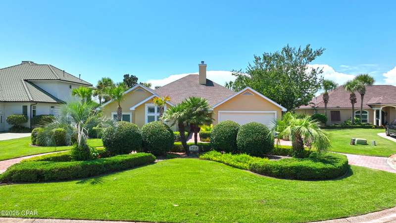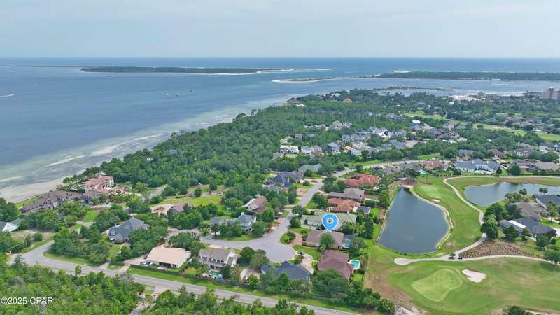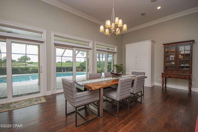 Welcome to Legend Hills in Bay Point! A private gated golf course community. The home is located between the 9th green and the tee box of the 10th hole par 3 over the water, and on the cul de sac of Dragons Ridge Road. This 4 bedroom, 3 bath home includes a beautiful open floor plan with incredible sunset views over the screened pool patio and the golf course. Soaring 12' ceilings with crown moldings, built-in cabinets, and the gas fireplace create an open welcoming home. The oversized 2-car garage includes a separate garage door for your golf cart, two large closets, built-in storage cabinets, and polyurea floor coating with a lifetime warranty. Renovated in 2018 after Hurricane Michael, the home features a new 3-dimensional shingle roof, spray-foam insulation, new HVAC systems, all new hurricane-rated windows and doors, engineered acacia hardwood flooring, completely renovated kitchen (new cabinets, quartz countertops, KitchenAid stainless steel appliances, etc.), Waypoint cabinets in the kitchen, great room, and master bathroom, a new pool screen enclosure, refinished gunite pool, new pool pump & filter, and more. The master bathroom includes a huge walk-in closet and the frameless glass shower includes a steam generator with bluetooth speakers, lighting, and aroma therapy. Bay Point residents have 24-hour security, gated entry, the Nicklaus Golf Course, the Point South Marina that hosts the annual Bay Point Invitational Billfish Tournament, and a golf cart friendly community. Often called the best neighborhood in Bay County. The home is vacant and easy to show. Call today to schedule your private tour and submit your offer.