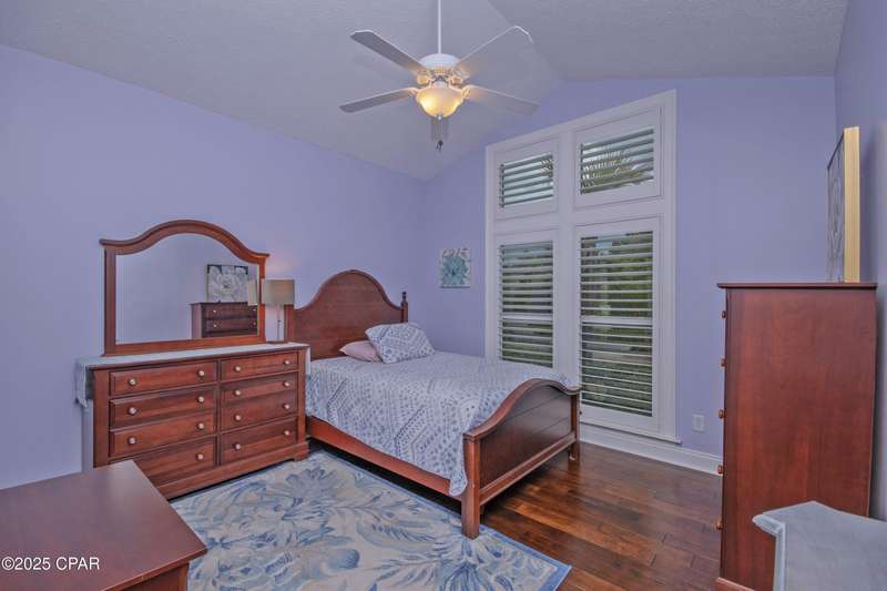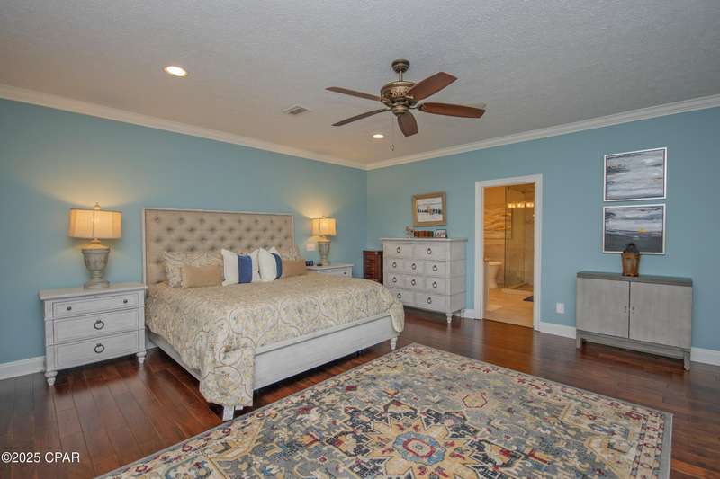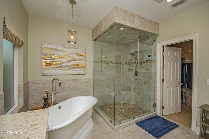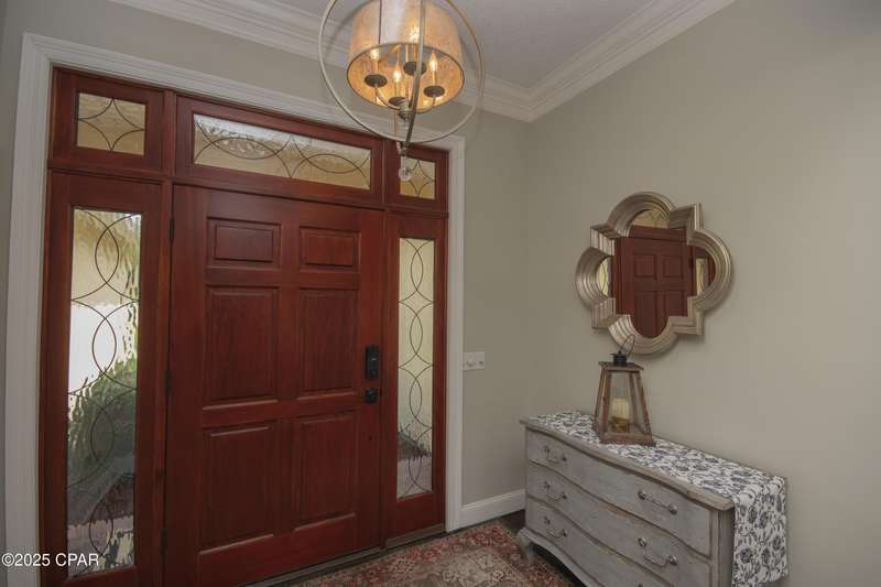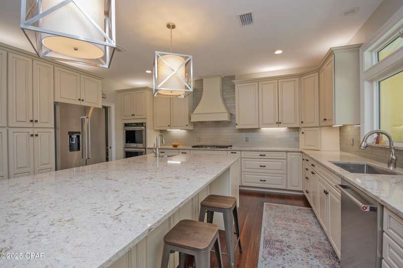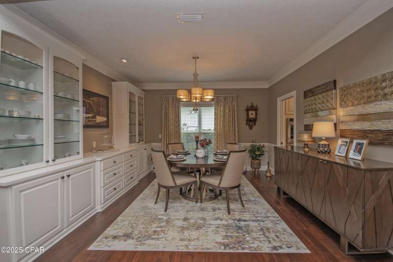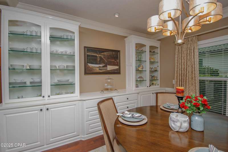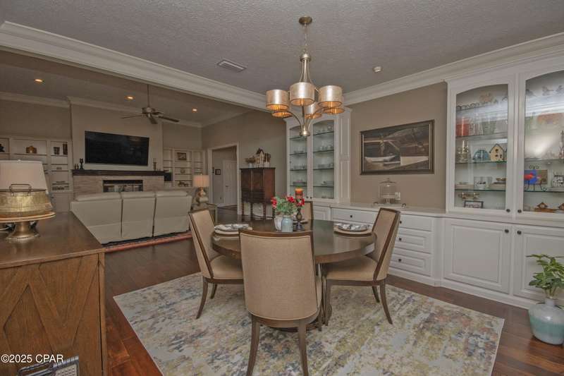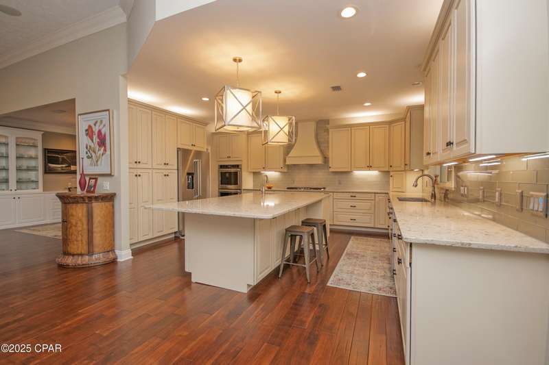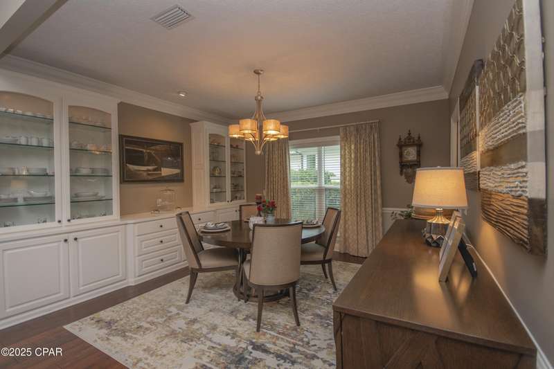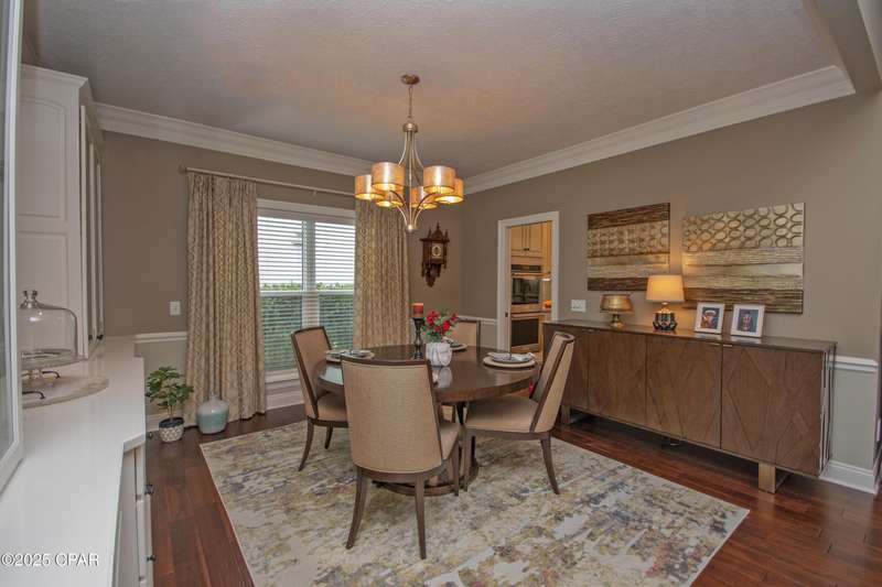 Welcome to Legend Hills in Bay Point! A private gated golf course community. The home is located between the 9th green and the tee box of the 10th hole par 3 over the water, and on the cul de sac of Dragons Ridge Road. This 4 bedroom, 3 bath home includes a beautiful open floor plan with incredible sunset views over the screened pool patio and the golf course. Soaring 12' ceilings with crown moldings, built-in cabinets, and the gas fireplace create an open welcoming home. The oversized 2-car garage includes a separate garage door for your golf cart, two large closets, built-in storage cabinets, and polyurea floor coating with a lifetime warranty. Renovated in 2018 after Hurricane Michael, the home features a new 3-dimensional shingle roof, spray-foam insulation, new HVAC systems, all new hurricane-rated windows and doors, engineered acacia hardwood flooring, completely renovated kitchen (new cabinets, quartz countertops, KitchenAid stainless steel appliances, etc.), Waypoint cabinets in the kitchen, great room, and master bathroom, a new pool screen enclosure, refinished gunite pool, new pool pump & filter, and more. The master bathroom includes a huge walk-in closet and the frameless glass shower includes a steam generator with bluetooth speakers, lighting, and aroma therapy. Bay Point residents have 24-hour security, gated entry, the Nicklaus Golf Course, the Point South Marina that hosts the annual Bay Point Invitational Billfish Tournament, and a golf cart friendly community. Often called the best neighborhood in Bay County. The home is vacant and easy to show. Call today to schedule your private tour and submit your offer.