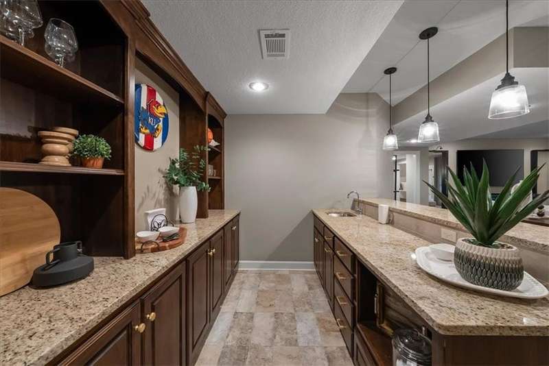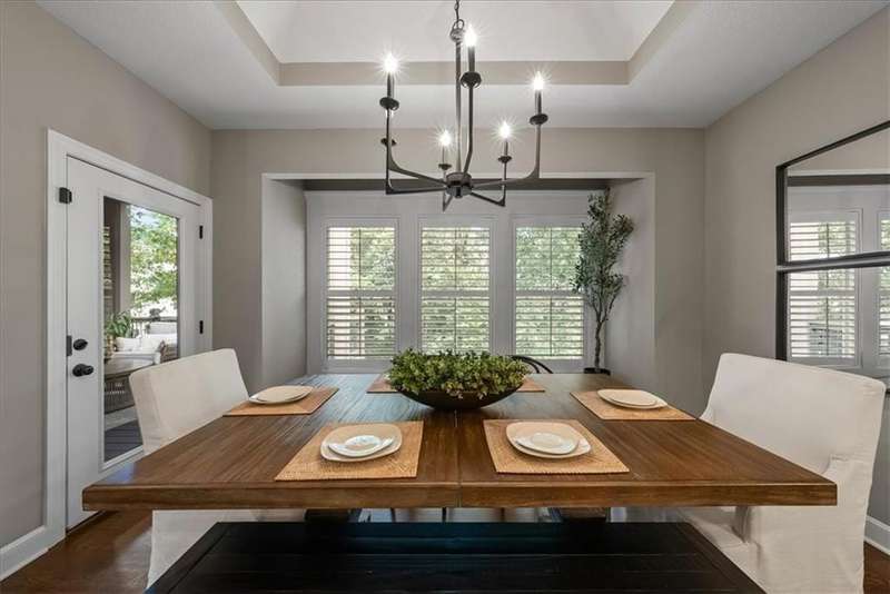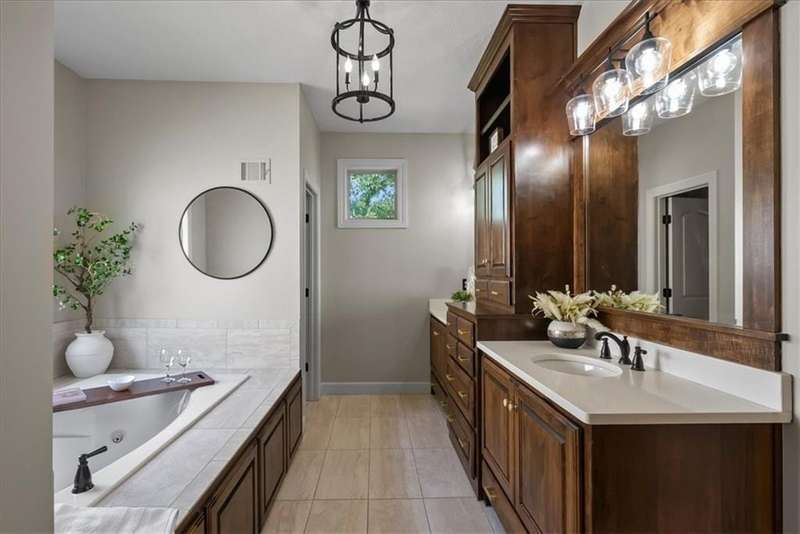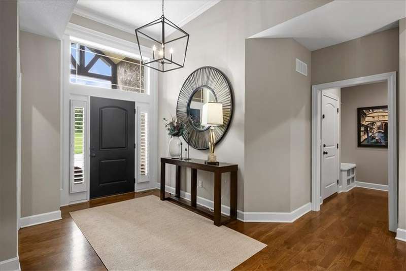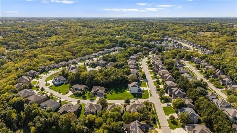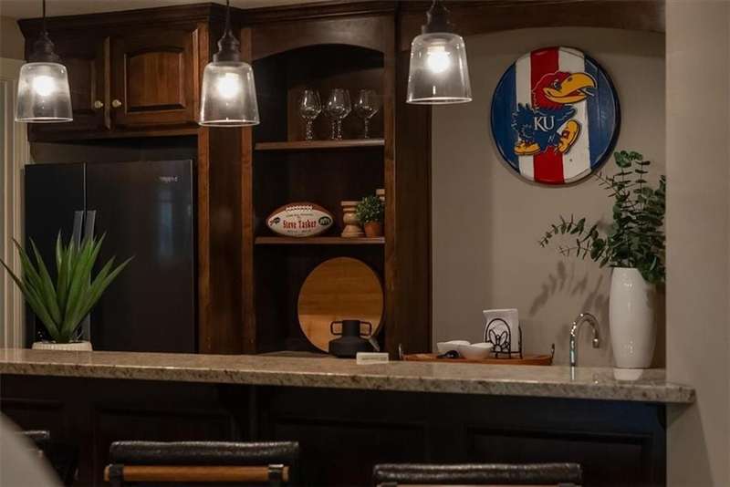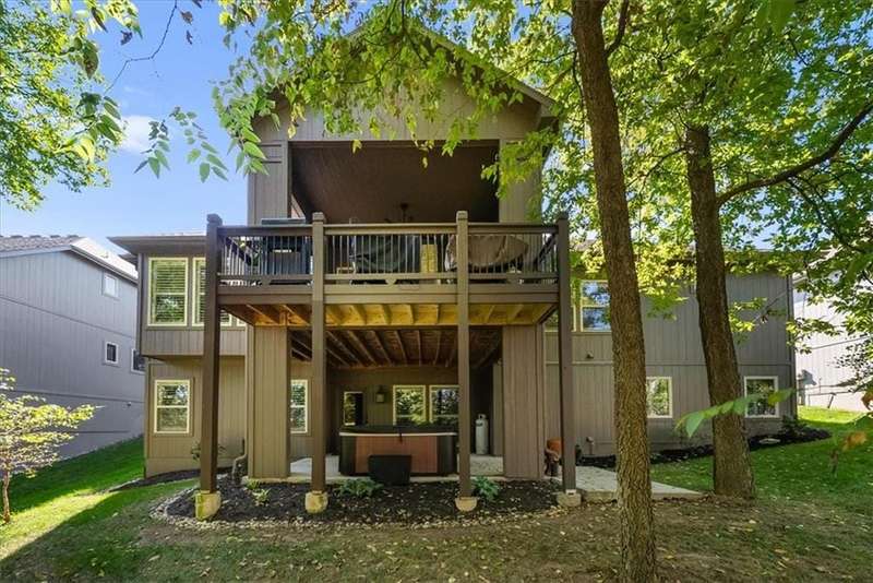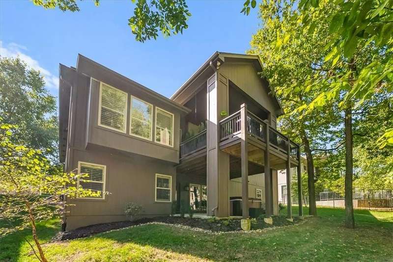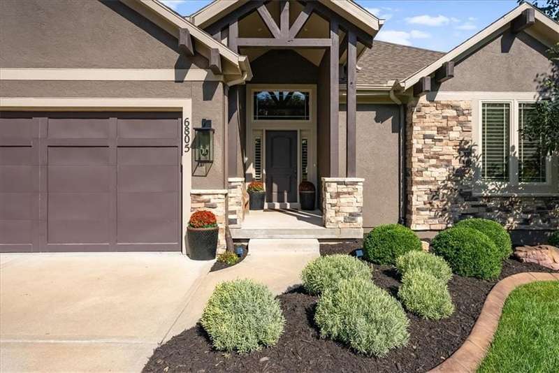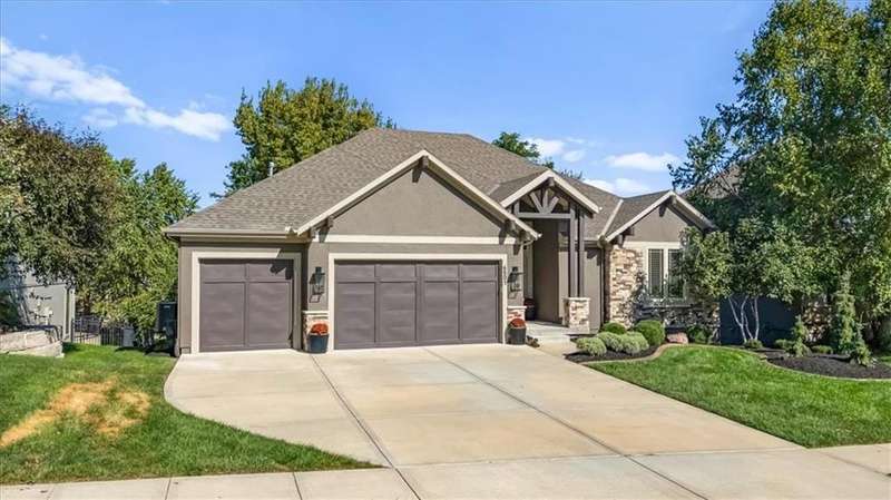 Welcome to comfortable living in this lightly lived-in former model home (Rodrock - Dillon reverse), perfectly positioned on a private wooded walk-out lot. The open floor plan draws you in with gleaming hardwoods, a beamed great room ceiling, and a cozy two-sided fireplace for gatherings. A chefs kitchen awaits with quartz countertops, stained cabinetry, stainless steel appliances, and an oversized walk-in pantry. The main level bedroom doubles beautifully as a guest suite or home office. Retreat to the primary suite with tranquil backyard views, spa-like bath with whirlpool tub, separate shower, dual vanities, and a walk-in closet connected to the laundry room. Entertain with ease in the expansive lower level boasting a wet bar, family room, and two private ensuite bedrooms. Outdoor living shines with a covered deck and see-through fireplace plus a covered patio overlooking serene trees and wildlife. Recent updates include fresh interior and exterior paint, plantation shutters throughout, new quartz kitchen counters, kitchen backsplash, lighting, deck extension, landscaping, and more. Nestled in a secluded hilltop neighborhood with no neighbors behind, this home combines privacy with convenience. All just minutes from Shawnee Mission Parkway shopping and eateries in the award-winning DeSoto School District and Mill Valley High School attendance areathis one is ready to impress and ready for you!