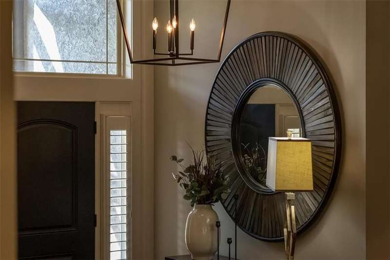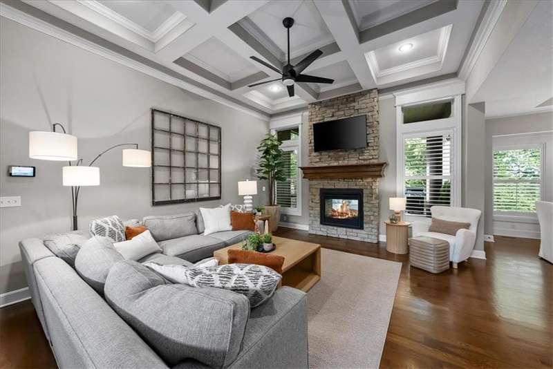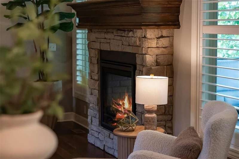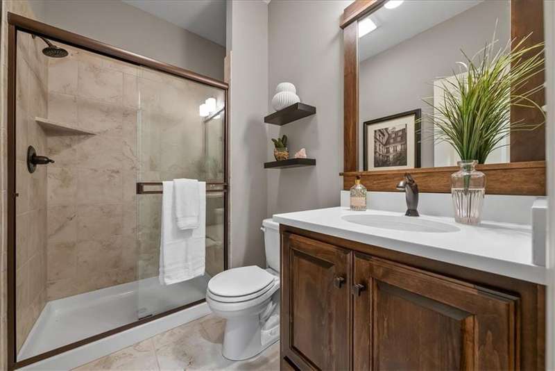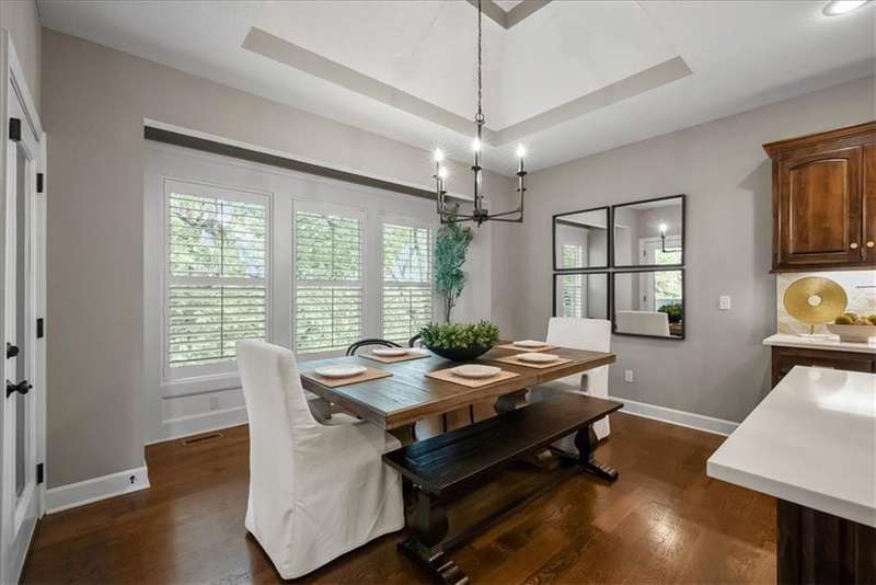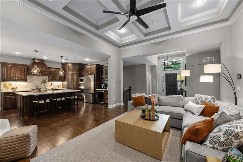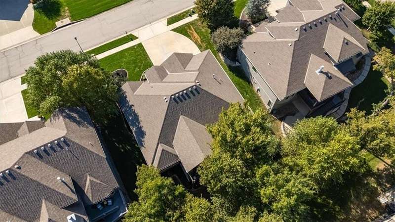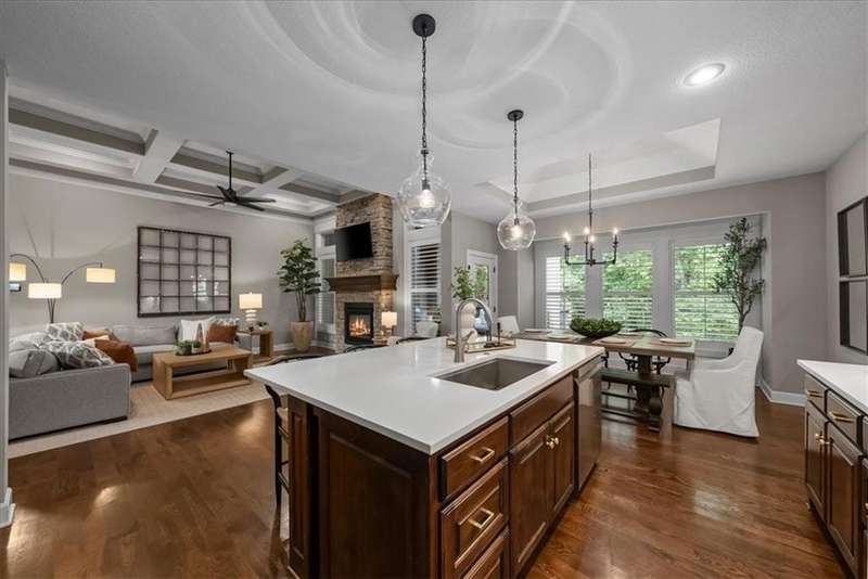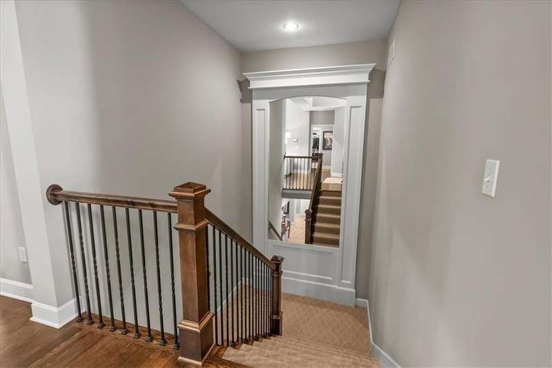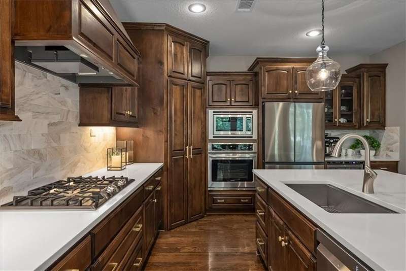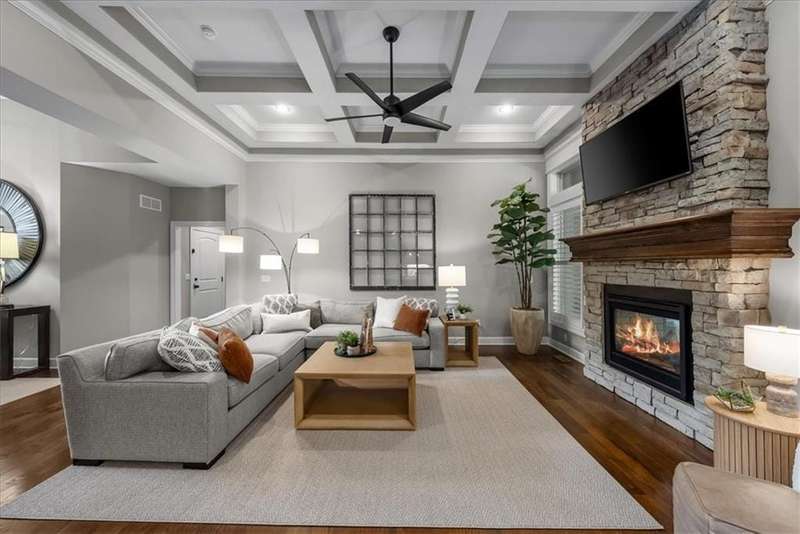 Welcome to comfortable living in this lightly lived-in former model home (Rodrock - Dillon reverse), perfectly positioned on a private wooded walk-out lot. The open floor plan draws you in with gleaming hardwoods, a beamed great room ceiling, and a cozy two-sided fireplace for gatherings. A chefs kitchen awaits with quartz countertops, stained cabinetry, stainless steel appliances, and an oversized walk-in pantry. The main level bedroom doubles beautifully as a guest suite or home office. Retreat to the primary suite with tranquil backyard views, spa-like bath with whirlpool tub, separate shower, dual vanities, and a walk-in closet connected to the laundry room. Entertain with ease in the expansive lower level boasting a wet bar, family room, and two private ensuite bedrooms. Outdoor living shines with a covered deck and see-through fireplace plus a covered patio overlooking serene trees and wildlife. Recent updates include fresh interior and exterior paint, plantation shutters throughout, new quartz kitchen counters, kitchen backsplash, lighting, deck extension, landscaping, and more. Nestled in a secluded hilltop neighborhood with no neighbors behind, this home combines privacy with convenience. All just minutes from Shawnee Mission Parkway shopping and eateries in the award-winning DeSoto School District and Mill Valley High School attendance areathis one is ready to impress and ready for you!