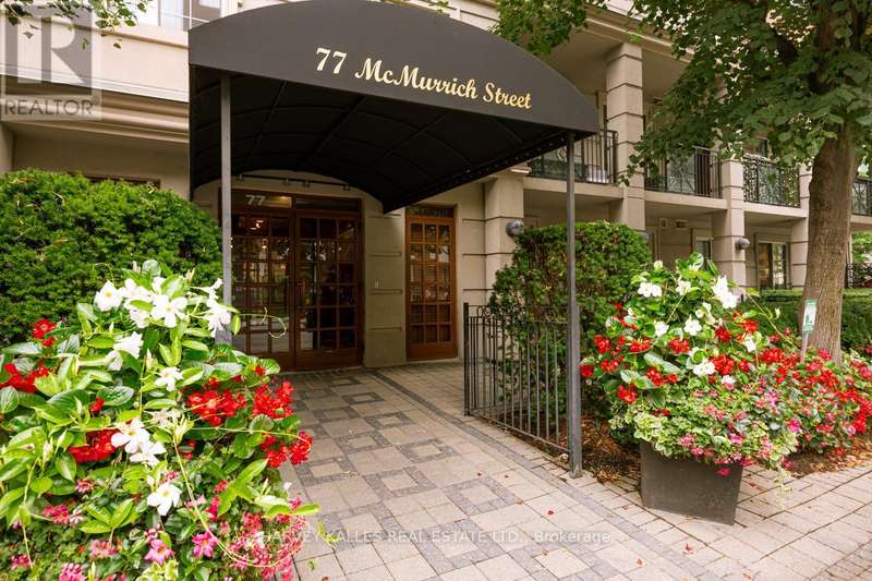 Welcome to 77 McMurrich Street - where Yorkville meets Rosedale in one of Toronto's most coveted enclaves. This 1,180 sq ft northwest corner suite is filled with natural light and offers a thoughtfully designed two-bedroom, two-bathroom split plan with spacious, open-concept principal rooms. The galley-style kitchen includes space for a breakfast table, a large picture window, with honey toned cabinetry and granite counter tops, while the generous foyer houses tucked-away laundry facilities and a 3-piece bath for added convenience. The primary suite features a spa like 6-piece ensuite creating a perfect retreat with marble and stone and a walk-in closet. Nine-foot ceilings and hardwood floors enhance the airy, elegant feel throughout. Walk out to your oversized balcony and enjoy the quiet tree lined street. Located in a refined New York-style brownstone 7 storey boutique building, this suite includes an owned parking spot and exclusive use locker. With a 24 hour concierge, visitor parking, guest suite, fitness centre, meeting room and a party room. Just steps to Yorkville's finest restaurants, shops, Ramsden Park and Rosedale TTC station, this is sophisticated city living at its best. A rare opportunity to own in a truly exceptional building and location. (id:6370)