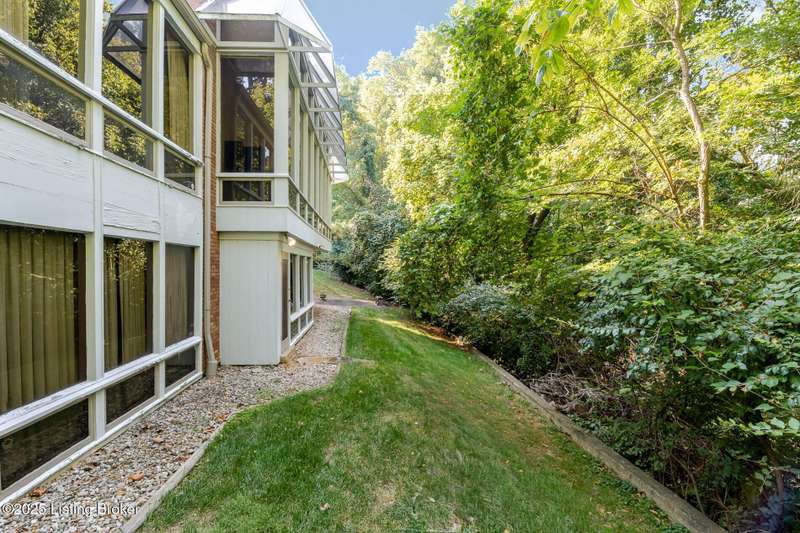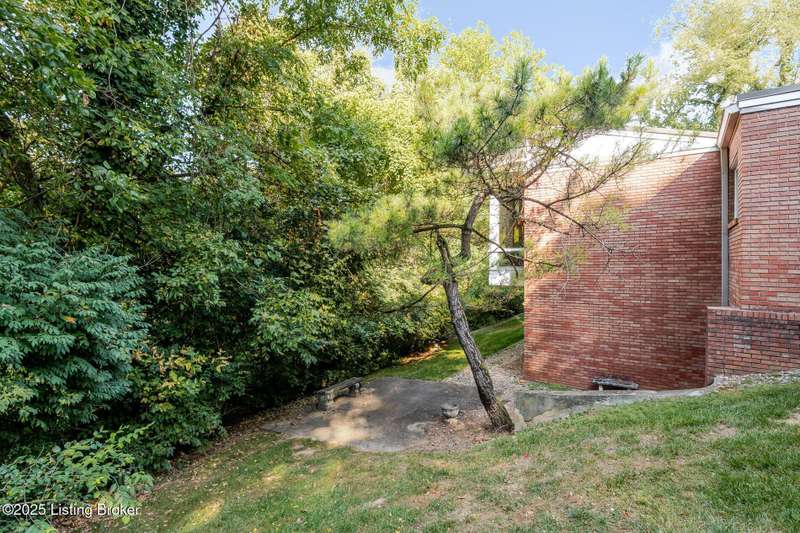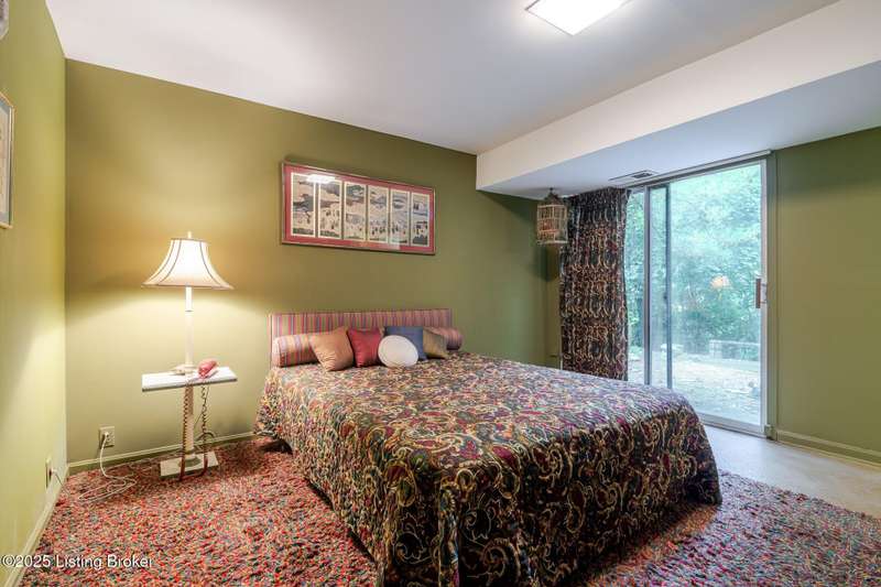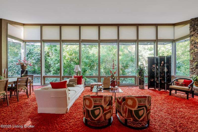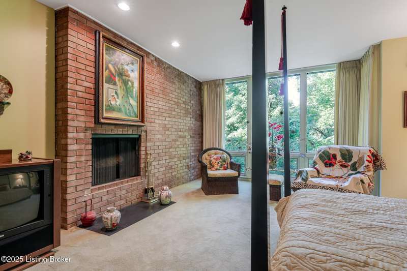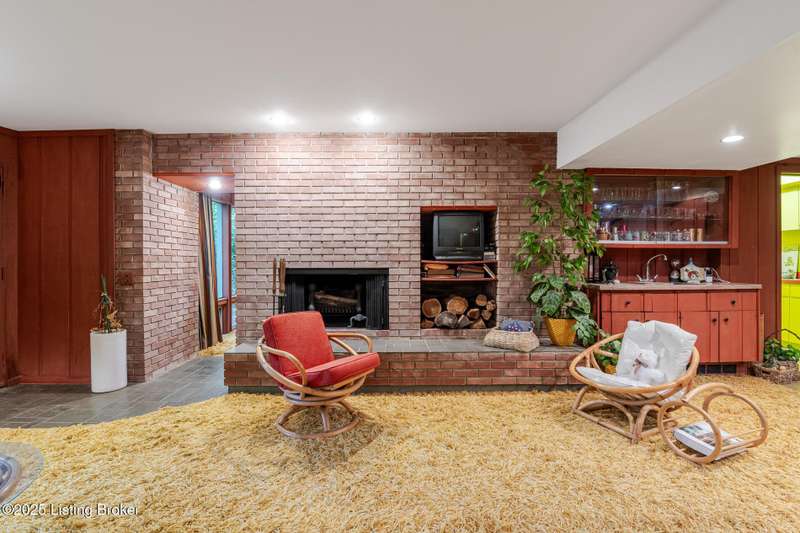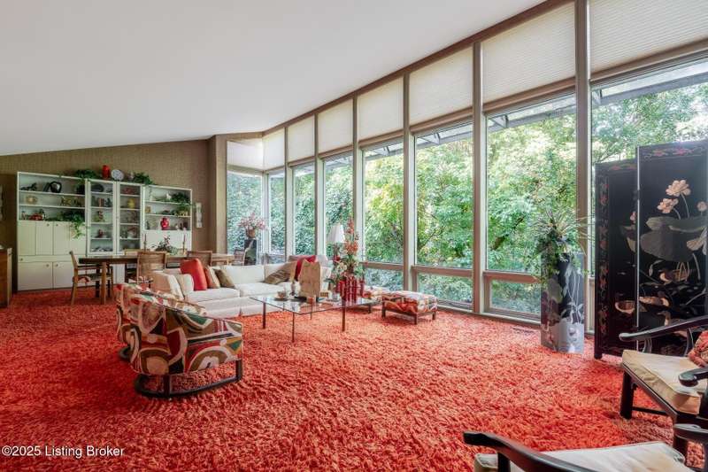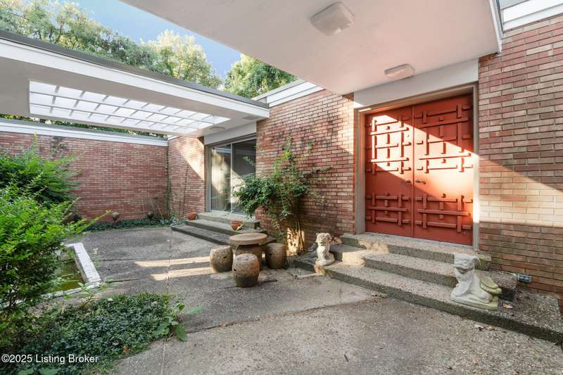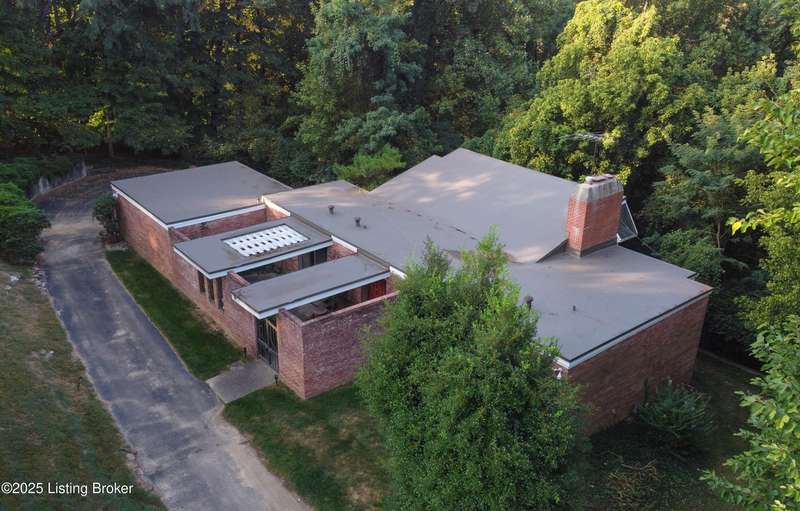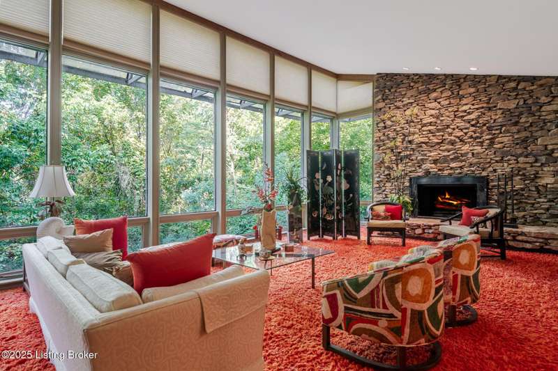 Discover this truly unique one-owner, custom-built ranch in the desirable Greenleaves neighborhood, offering the perfect blend of privacy and convenience. Built in 1970 and meticulously maintained, including a new roof in 2025, this home is situated on 1.3 wooded acres in the city, just minutes from I-71 and Brownsboro Road. As you approach, a large gated courtyard welcomes you to the double-door entry. Inside, the spacious foyer opens to a vaulted living room featuring a dramatic floor-to-ceiling fireplace and expansive windows overlooking the wooded lot, bringing the outdoors in. The eat-in kitchen offers generous space, a large pantry, built-in desk, and ample cabinetry. The primary suite is a true retreat with floor-to-ceiling windows, a cozy fireplace, oversized layout, and spa-style bath complete with double vanity, sunken tub, and a huge custom walk-in closet with built-in drawers and cabinetry. A stylish powder room completes the first floor. The lower level provides outstanding space for living and entertaining. The family room features a fireplace, wet bar, backyard walkout, and custom built-ins. Additional rooms include an office/bedroom with large walk-in closet, two more bedrooms with ample storage, and a full bath with tub/shower combo. The laundry room doubles as a kitchenette with refrigerator, stove, dishwasher, utility sink, and plenty of cabinet space. Other highlights include an attached two-car garage, full home vacuum system and extensive storage throughout. With its retro charm, custom features, and spacious layout, this home is ready for a new owner to make it their own.