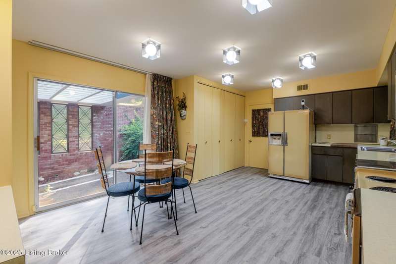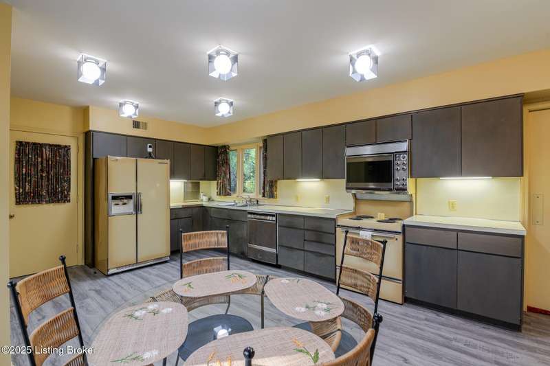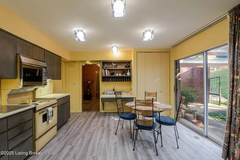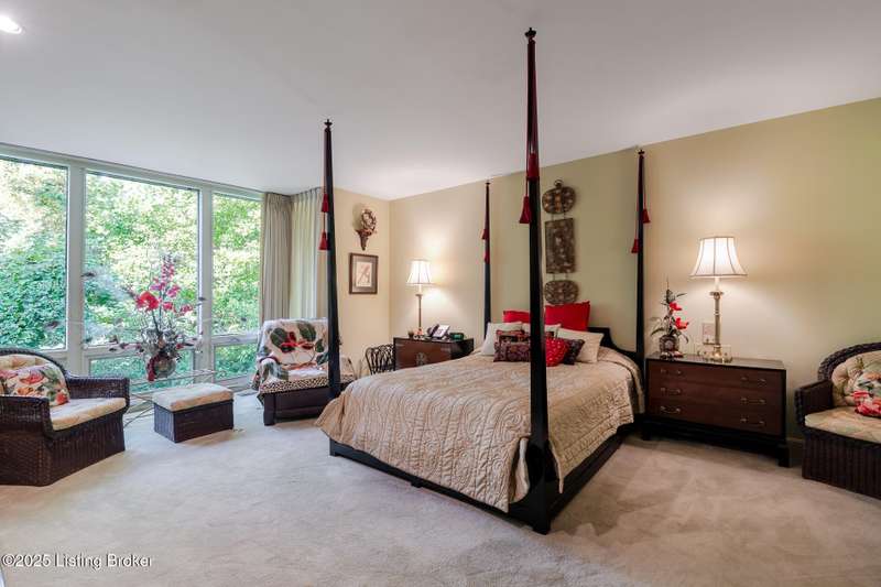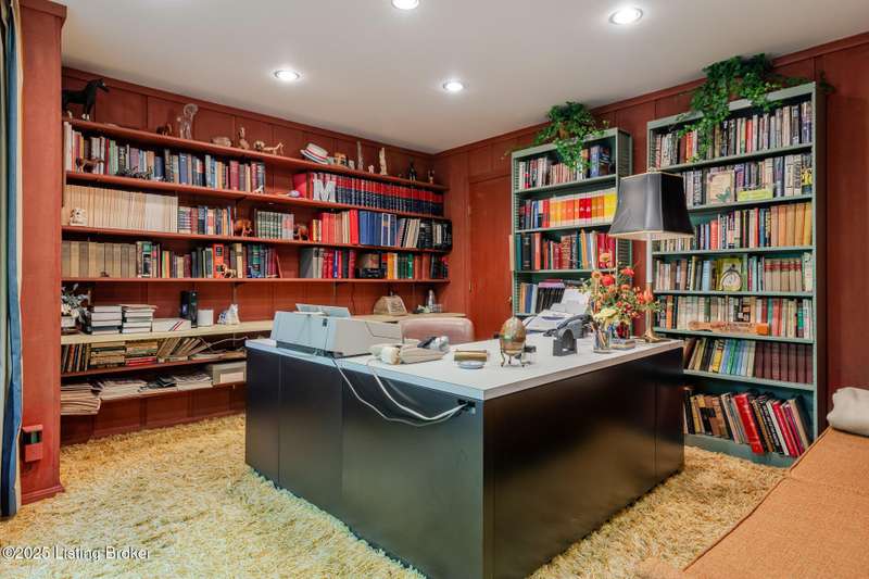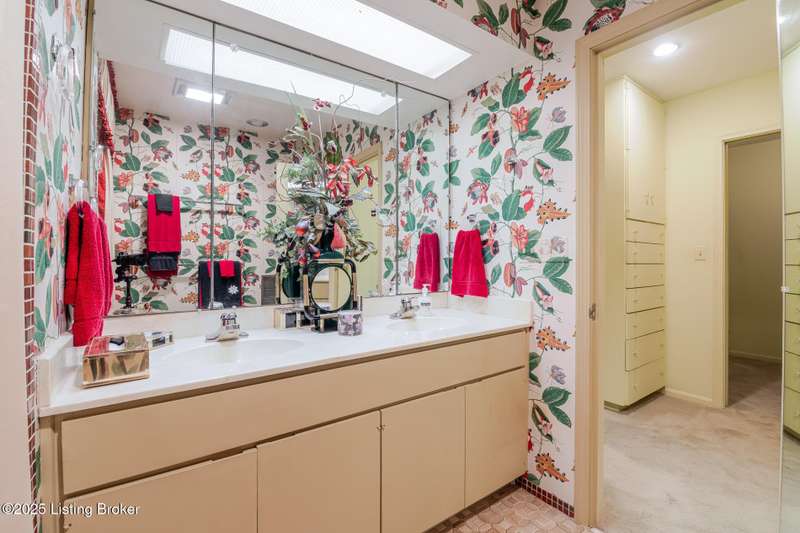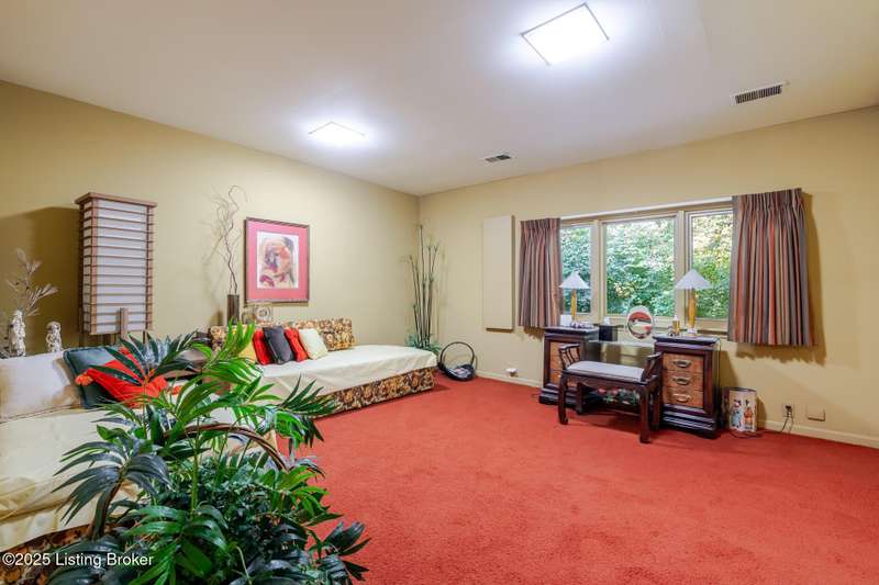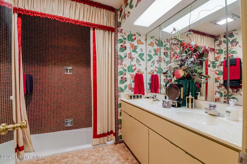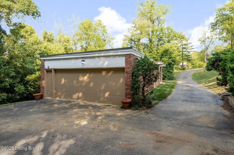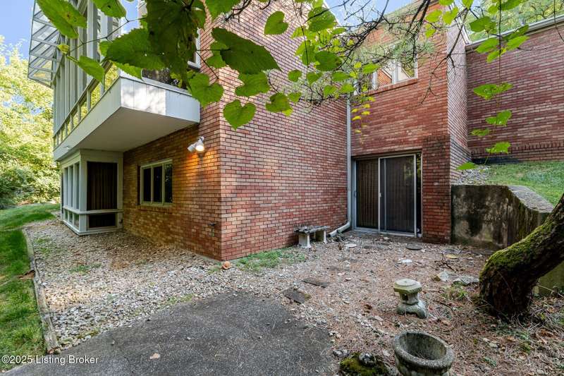 Discover this truly unique one-owner, custom-built ranch in the desirable Greenleaves neighborhood, offering the perfect blend of privacy and convenience. Built in 1970 and meticulously maintained, including a new roof in 2025, this home is situated on 1.3 wooded acres in the city, just minutes from I-71 and Brownsboro Road. As you approach, a large gated courtyard welcomes you to the double-door entry. Inside, the spacious foyer opens to a vaulted living room featuring a dramatic floor-to-ceiling fireplace and expansive windows overlooking the wooded lot, bringing the outdoors in. The eat-in kitchen offers generous space, a large pantry, built-in desk, and ample cabinetry. The primary suite is a true retreat with floor-to-ceiling windows, a cozy fireplace, oversized layout, and spa-style bath complete with double vanity, sunken tub, and a huge custom walk-in closet with built-in drawers and cabinetry. A stylish powder room completes the first floor. The lower level provides outstanding space for living and entertaining. The family room features a fireplace, wet bar, backyard walkout, and custom built-ins. Additional rooms include an office/bedroom with large walk-in closet, two more bedrooms with ample storage, and a full bath with tub/shower combo. The laundry room doubles as a kitchenette with refrigerator, stove, dishwasher, utility sink, and plenty of cabinet space. Other highlights include an attached two-car garage, full home vacuum system and extensive storage throughout. With its retro charm, custom features, and spacious layout, this home is ready for a new owner to make it their own.