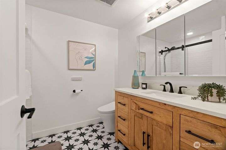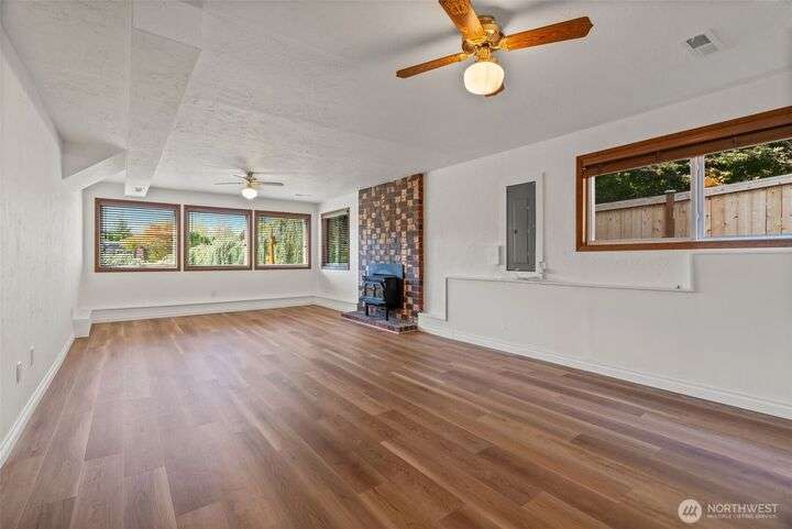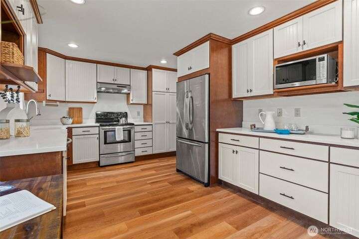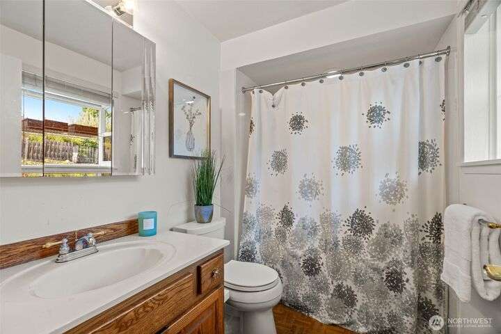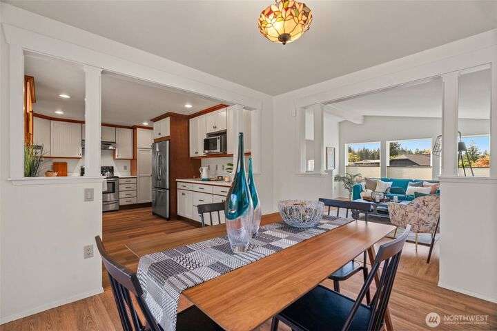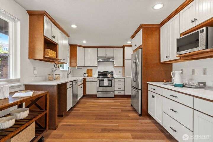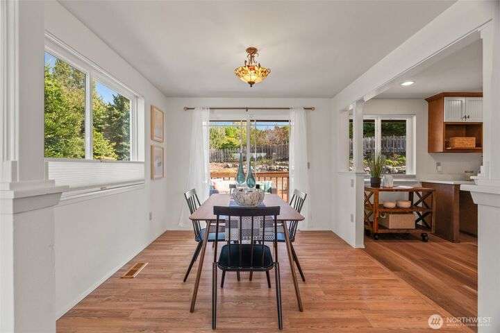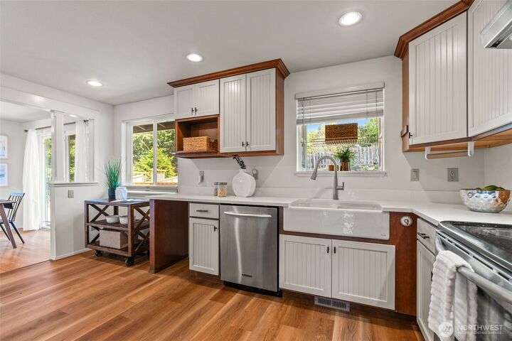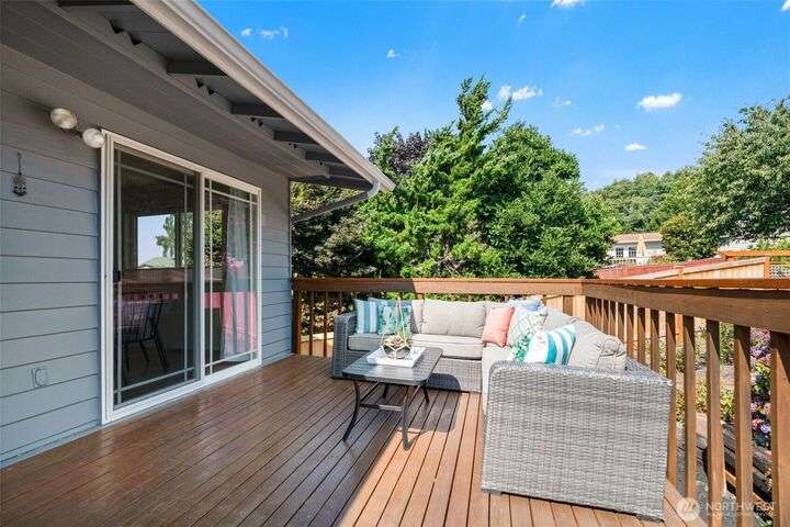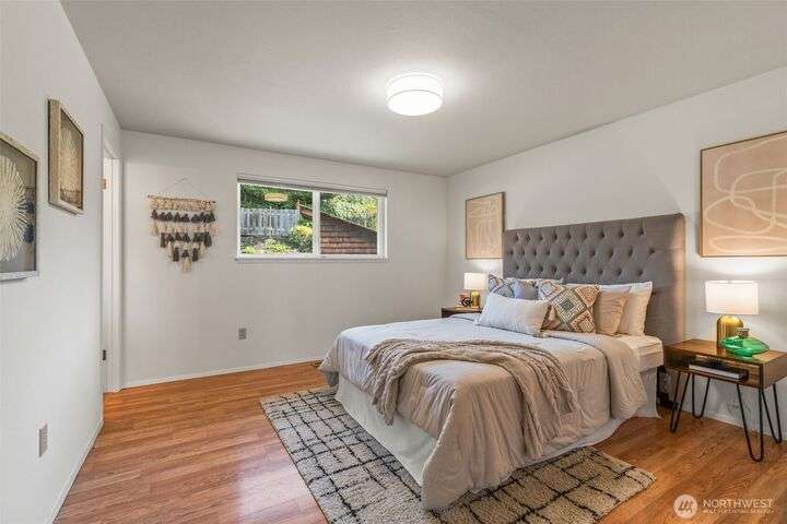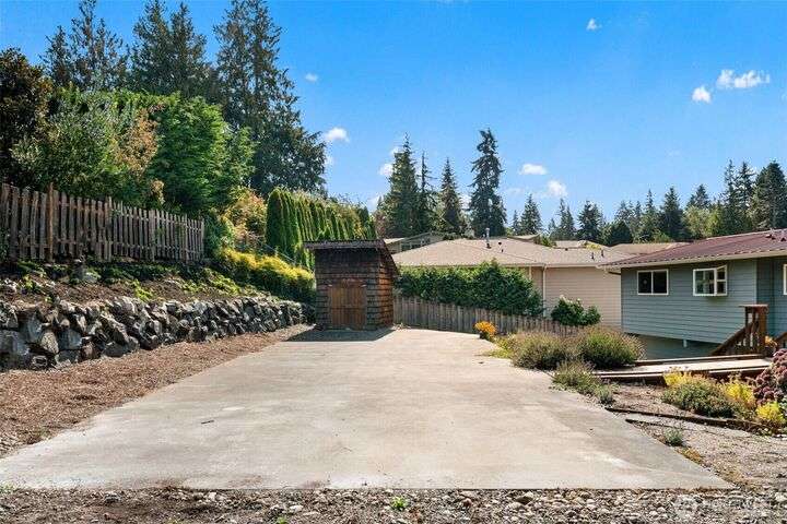 Nestled in a cul-de-sac in the Edmonds Bowl, this updated home blends classic charm with thoughtful modern improvements. Just a short stroll brings you to downtown shops, restaurants, and the scenic waterfront. Recent upgrades include an updated bathroom, new flooring in the basement, kitchen, and breezeway, renovated basement walls, remodeled closets, a refreshed backyard, new garage door motors, and an upgraded electric panel. The yard showcases colorful native plantings and a sport court for basketball or pickleball. Enjoy morning coffee on the east-facing deck and sunsets on the spacious west deck. The updated lower-level family room is perfect for movie nights, hobbies, or guests. 2 car garage plus additional parking for RV/boat.