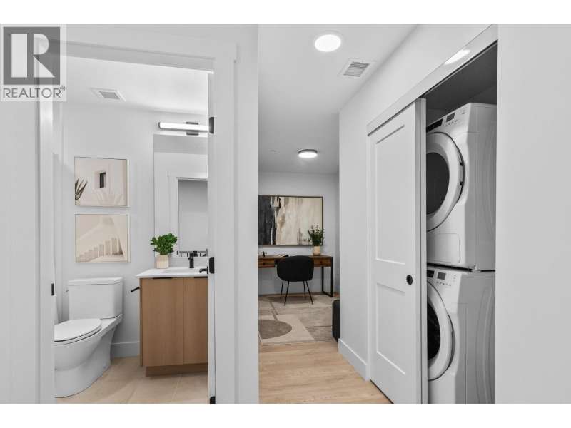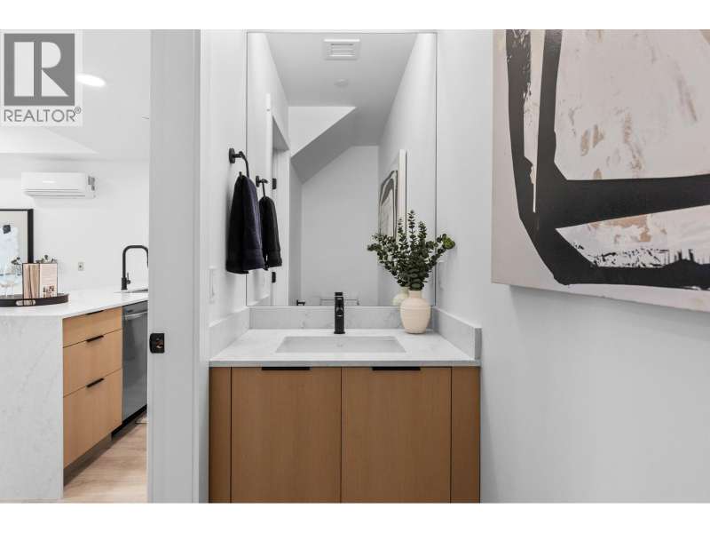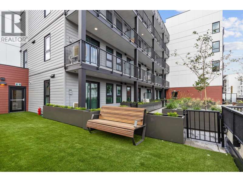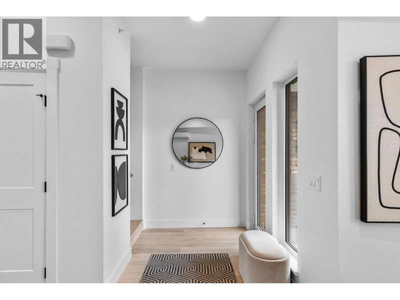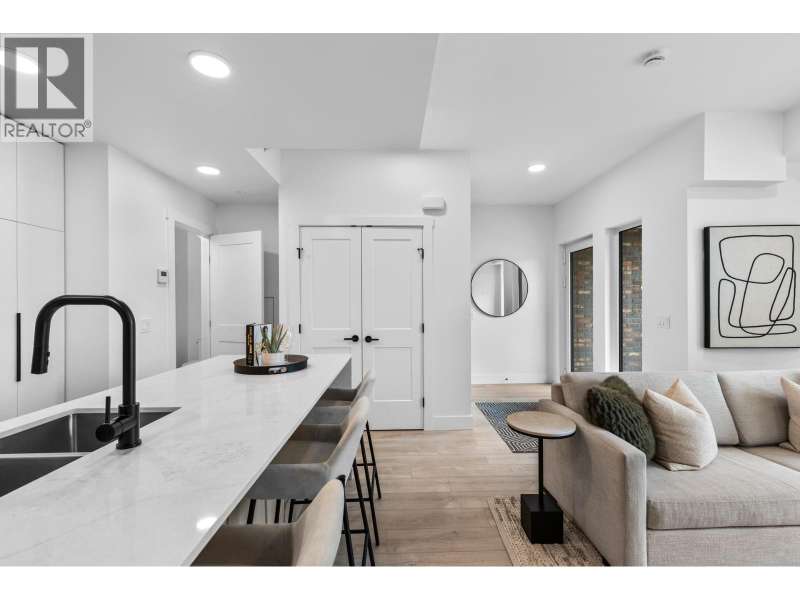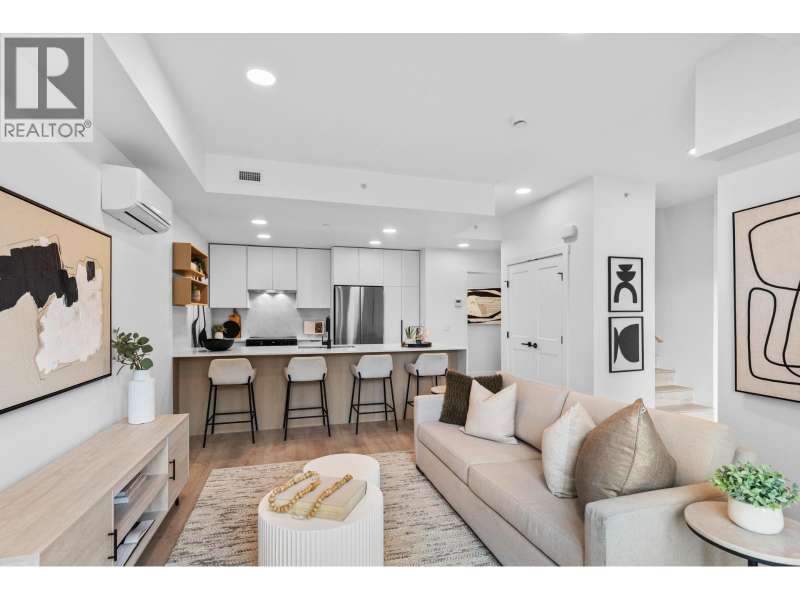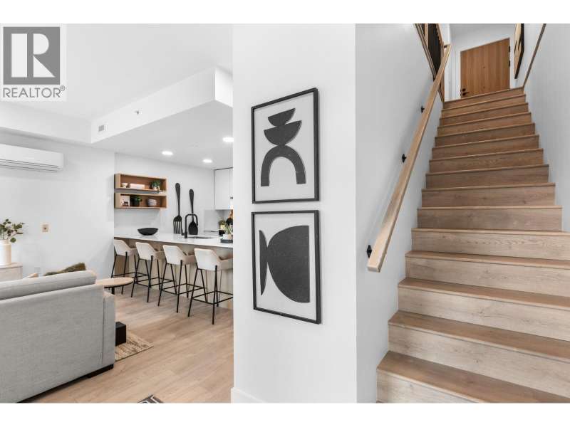 Brand new two storey townhouse style condo with street level entry, situated in downtown building Nolita. Enjoy the perks of condo living without sacrificing space. As you walk in from the quiet street, step into an open concept main floor features an upgraded quartz kitchen, full appliance package, and a light filled living/dining area, half bath on this floor as well. On the second floor, the spacious master suite includes a walk-in closet and its own fully tiled roomy walk-in shower, and double vanity. A second bedroom and a full bathroom along with the versatile den—ideal for home office, guest space, or hobby room. All the perks of downtown Kelowna are just outside your door: beaches, parks, craft breweries and restaurants. A New Home Warranty (2 5 10) ensures no surprise repair bills—just peace of mind. Strata fees cover nearly everything (you only pay your power & internet). Shared amenities include beautifully landscaped courtyard, gas BBQ lounge, fire table seating and an onsite dog park. It’s pet friendly with up to two pets of any size allowed. Smart building access includes secure entry, package management and elevator scheduling via the 1Valet app. Open house- walk ins welcome- Mon-Thur 11-7Pm and Fri-Sun 11-5PM (id:58403)