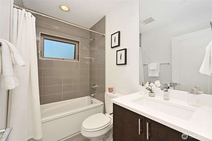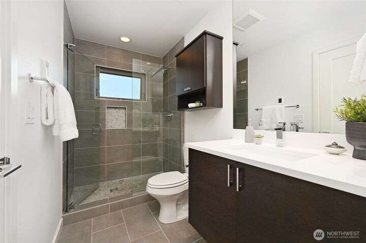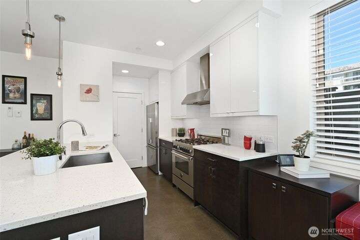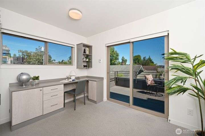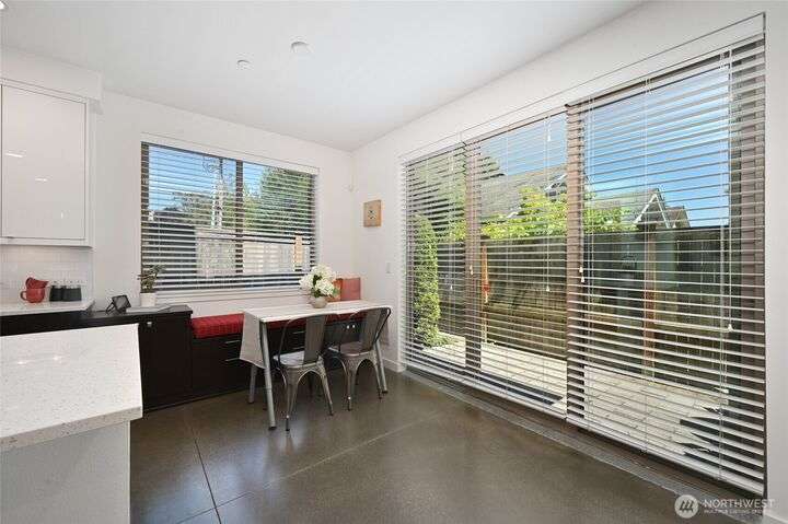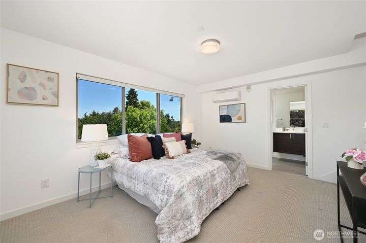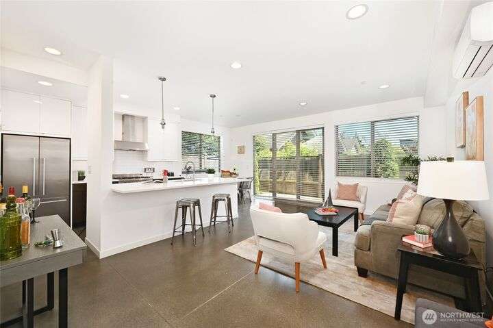 Spacious 2 bed townhome quietly nestled in the heart of Sunset Hill. A rare level entry to the main living space boasting polished concrete floors, ample natural light from large windows and a slider door to a private patio. Open layout w a large kitchen island, quartz counters, designer appliances. Upper level 2nd bedroom with built in office niche (removable) and private deck. Full bath & W/D also on this floor. Large upper level primary w ensuite bath and custom closet system. Mini-split heat & A/C system to stay cool. Roof deck with water and gas hookups, oh and mountain views! Private corner unit, covered parking, extra storage and steps to Sunset Hill’s multiple cafés, shops and dining! Ballard, dwntwn and waterfront close by!