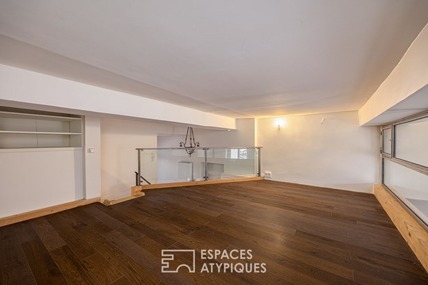 This spacious 92 m2 apartment is located 2 minutes from the Valmy metro station. The entrance leads to a large 22 m2 bedroom with a window overlooking the courtyard and a beautiful 25 m2 living room with its period fireplace and high ceilings (3.67 m). There is also a 18 m2 mezzanine that can be used as a workshop, office or second bedroom.