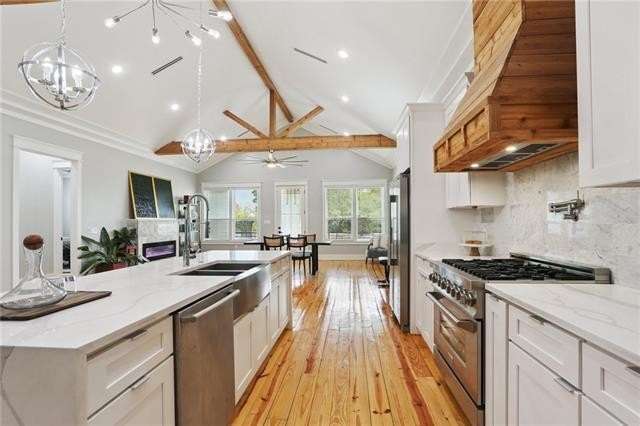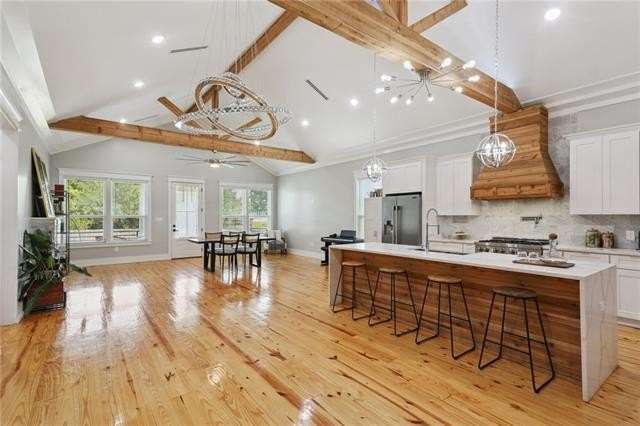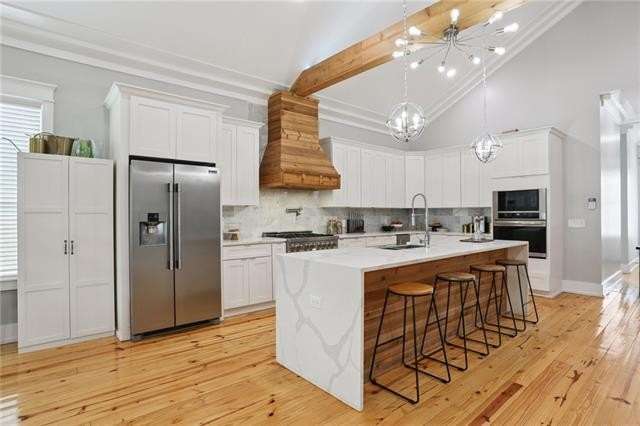 Step inside this one-of-a-kind 4-bedroom, 3-bath residence and prepare to be wowed. From the moment you walk through the grand 8’ doors, the soaring cathedral ceilings with exposed beams and warm hardwood pine floors set the stage for a home that’s equal parts elegant and inviting. The gourmet kitchen features quartz counters, custom wood accents on the island and vent hood, a professional grade 36" gas range with an additional wall oven, built-in microwave, stainless ice maker, and a sleek stainless refrigerator, make it perfect for both everyday living and entertaining. Every bedroom offers generous space and its own large walk-in closet, while the baths shine with marble like tile and modern matte black finishes and spacious linen closets. Outside, a sprawling backyard gives you room to relax, play, or host gatherings, and the home has a storage shed and full home generator! This is a true custom build with craftsmanship and style in every detail; opportunities like this don’t last long in Arabi!