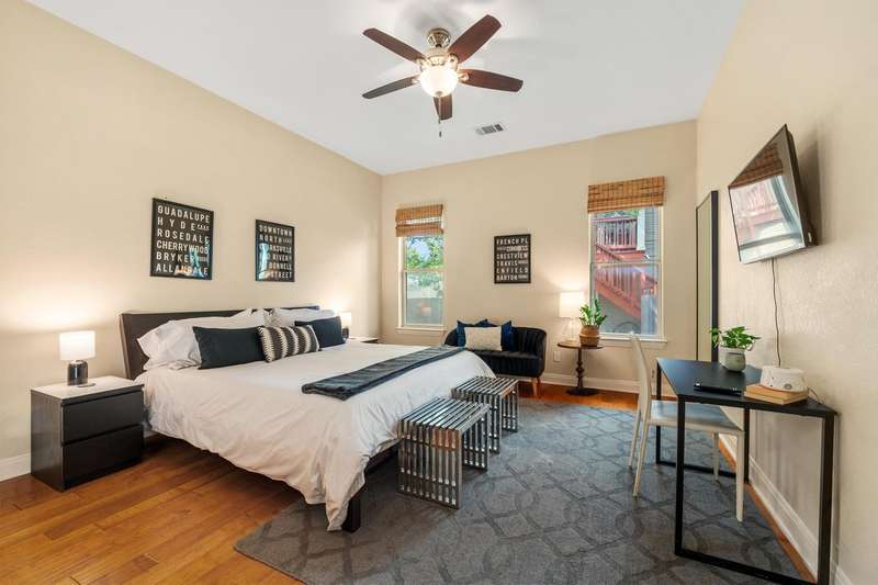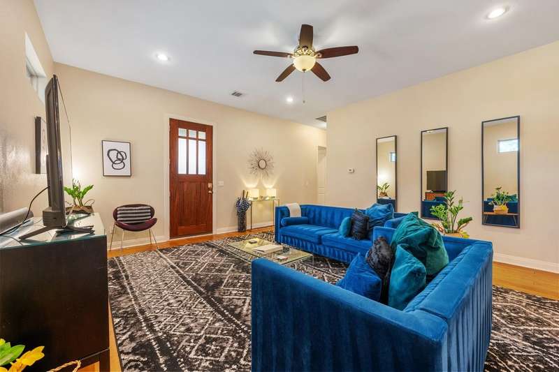 Tucked into a tree-lined pocket of the coveted Holly neighborhood, 111 Adam L. Chapa Senior Street is a rare East Austin residence offering a stylish 3-bed, 2-bath main house framed by a detached, oversized two-car garage topped with a fully finished guest apartment--ideal for visiting friends, an art studio, or short-term rental income potential. Inside, clean architectural lines, abundant natural light, and warm hardwood floors create an inviting modern aesthetic. The open floorplan living room flows seamlessly into a chef's kitchen outfitted for entertaining with a center island, while the tranquil primary suite enjoys a spa-inspired bath and generous closet space. French doors spill out to a landscaped backyard--your own private retreat--where the guest apartment anchors the back of the .15-acre lot and doubles as a quiet work-from-home haven. Step outside and you're moments from everything that makes Holly so magnetic. With Lady Bird Lake's hike-and-bike trail and downtown's vibrant music venues just minutes away, this address effortlessly blends neighborhood charm with the energy of Austin's east-side nightlife--delivering the perfect live-work-play lifestyle in one turnkey package.