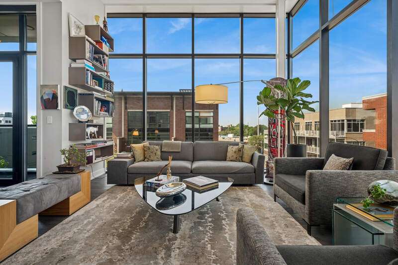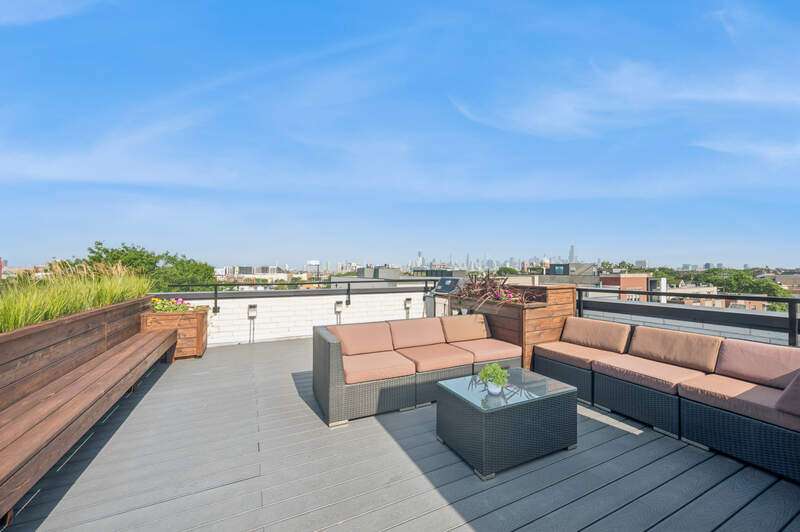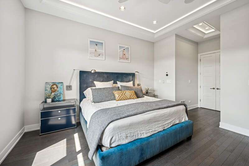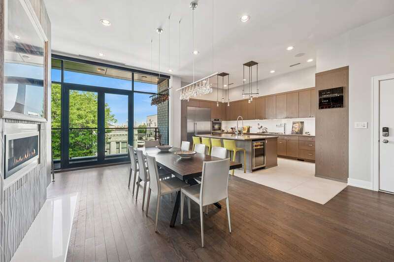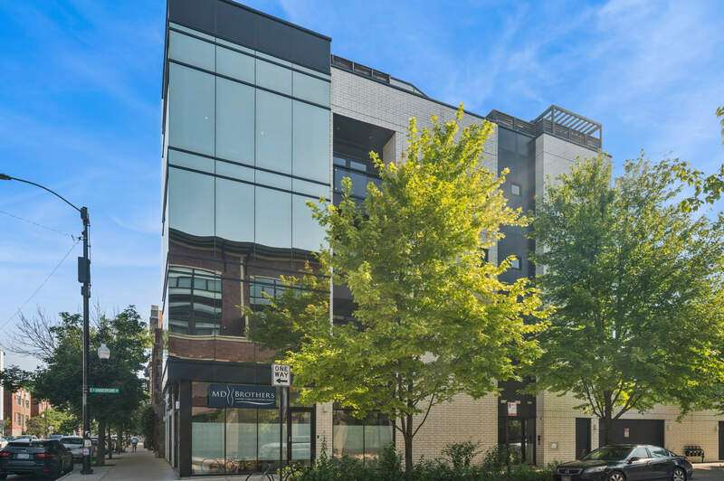 Spectacular full-floor 3 bed, 3.1 bath penthouse condo with direct and private elevator access is perfectly situated in prime Bucktown at the corner of Damen and Shakespeare. Soaring 18' ceilings and dramatic windows flood this home with natural light, while an expansive private rooftop terrace offers unmatched skyline views. Rare, boutique elevator building offers 2-car attached and heated garage parking. Designed for luxurious living and effortless entertaining with more than 2,800 square feet of living space and open-concept living. The spacious living room is framed by dramatic floor-to-ceiling east and north facing windows and a sleek dual-sided fireplace. The adjacent dining area is anchored by a full wet bar and a striking, floor to ceiling, custom glass wine cellar. The ultimate chef's kitchen offers sleek quartz countertops, generous custom cabinetry, and high-end appliances-including a built-in Miele coffee system, double ovens, pot filler, dual dishwashers, and two beverage/wine refrigerators. Just off the living room, two private balconies extend your entertaining space and offer the perfect setting for morning coffee or evening cocktails. The luxurious primary suite features a generous walk-in closet and spa-like bath with dual vanities, a jetted soaking tub, and steam shower. Two spacious secondary bedrooms, each with its own en-suite bath for comfort and privacy. Upstairs, an expansive private rooftop deck offers a true outdoor oasis with sweeping panoramic views of the city skyline. Thoughtfully designed for entertaining and relaxation, this incredible space features built-in seating, an outdoor TV/lounge area, a pergola offering shade and style, and both water and gas lines for easy outdoor cooking and hosting. Attached and heated two-car garage and dedicated storage. Ideally located near Bucktown's best dining, shopping, the 606 Trail, public transport, Midtown Athletic Club and more. Pulaski Elementary School district. Come see this rare offering!
