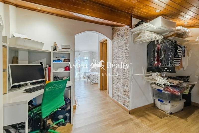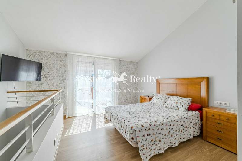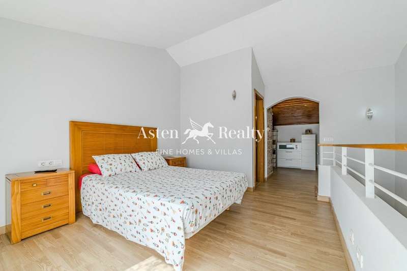 The second floor is occupied by the master bedroom. This space includes a dressing room, an office area located in the attic, and a bathroom with a shower and access to a private terrace, ideal as a relaxation or reading area.
