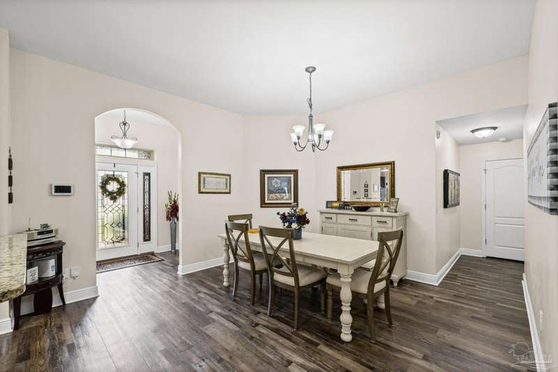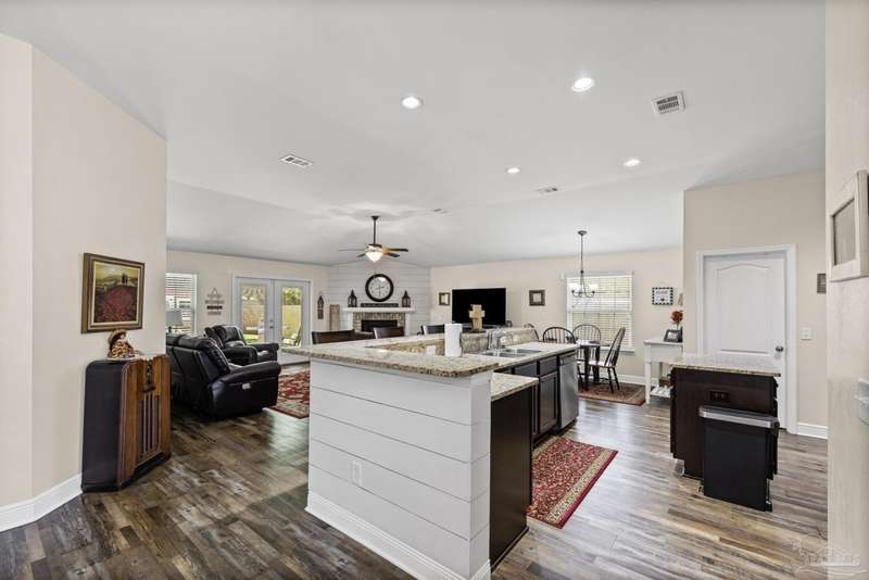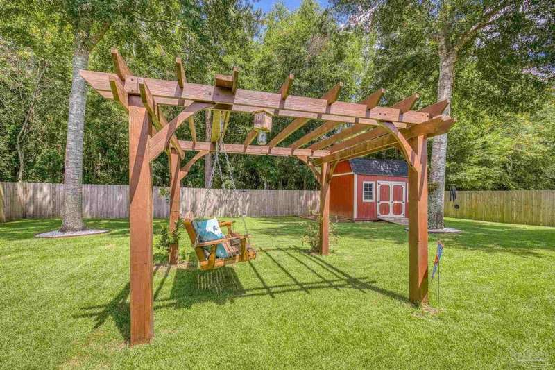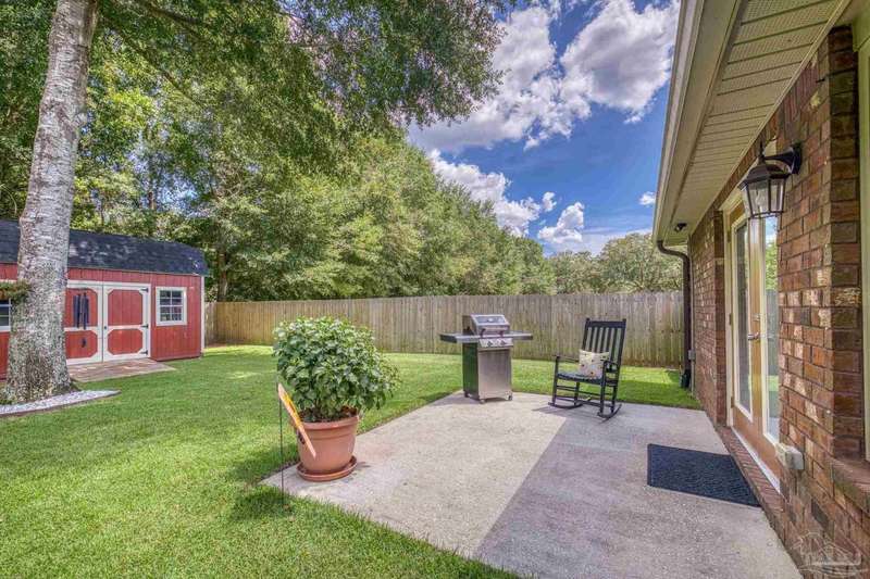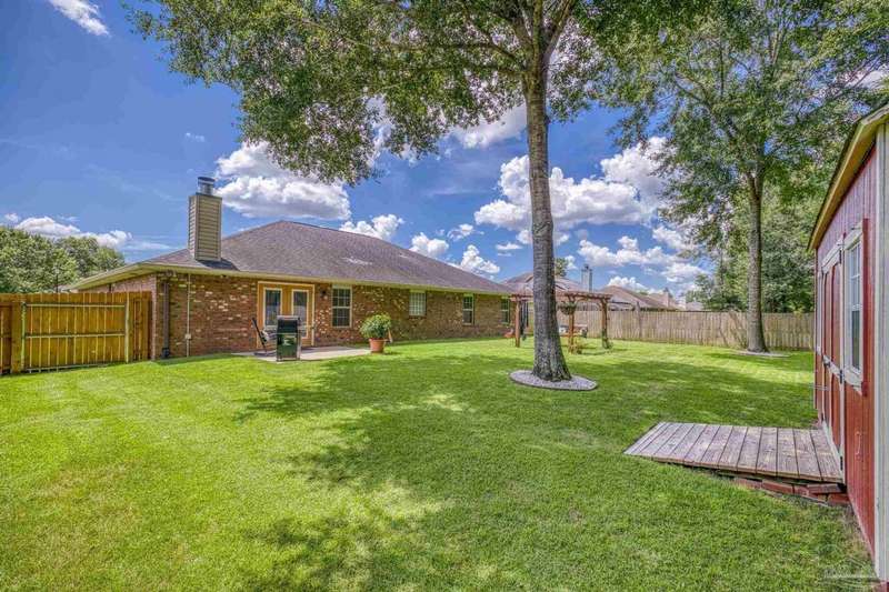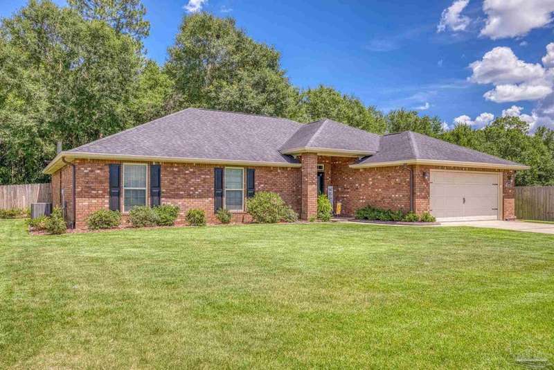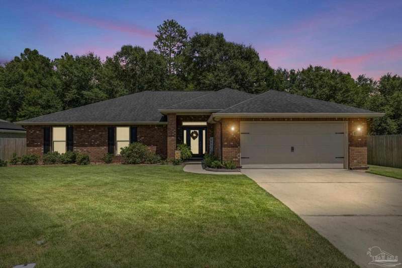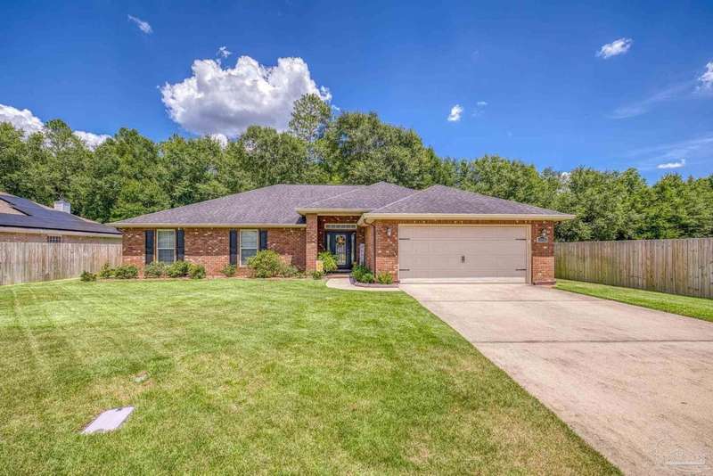 MOTIVATED SELLERS FOR THIS MOVE-IN READY IMMACULATE HOME IN PACE! Searching for your dream home in Pace? Look no further than this immaculate 4-bedroom, 2-bathroom gem in the A Rated Pace School District! When you arrive - notice the AMAZING Curb appeal! This ALL BRICK home, built in 2015, is better than new and boasts an open floor plan with luxury vinyl plank flooring throughout, creating a spacious and inviting atmosphere perfect for both daily living and entertaining especially around the cozy fireplace. The well-appointed and open kitchen flows seamlessly into the living and dining areas, making it easy to stay connected with family and guests and features a pantry, granite countertops, stainless appliances, island with breakfast bar - wrapped with shiplap - and additional eat-in area by a window. The split floorpan includes 3 bedrooms and hall bath on the front of the home and then the Main Suite on the back of the home overlooking the backyard. Talking about the Main Suite - there is a large sitting area in the bedroom, and in the ensuite bath a double vanity, new separate shower, soaking tub and HUGE walk-in closet. Then step outside into your fenced yard with shade trees behind the fence in the back, open portico with swing and the meticulously maintained yard features new Zoysia sod, known for its beauty and durability, a full irrigation system on reclaimed water with internet remote control and rock flower beds with concrete borders. You'll also find a convenient workshop, offering extra storage or a dedicated space for hobbies, electrical and waterproof flooring. This home is truly turn-key! Well insulated - saving you money on your power bill - and ready for you to move into and enjoy! Close to highly rated schools, shopping, Military Bases and so much more - you just need to schedule your showing today!