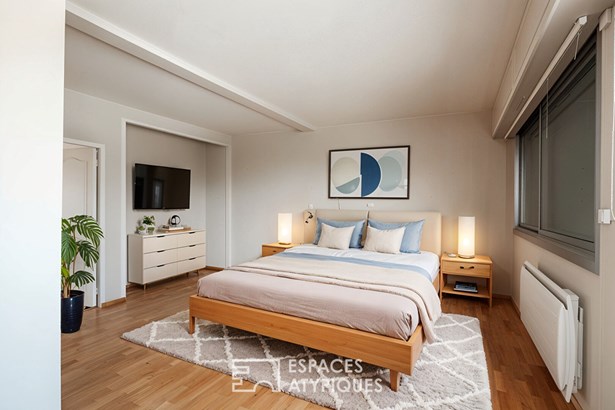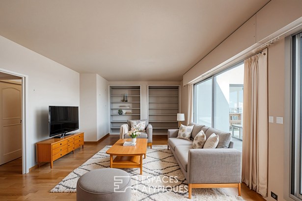 The master suite, with a generous surface area of 24 m2, can accommodate an office space with direct access to the large terrace on the city side. The other two bedrooms also benefit from access to the continuous terrace on the sea side, for waking up facing the horizon. Two bathrooms complete this functional layout. While the apartment requires some updating, it has remarkable potential with its well-designed volumes and materials to preserve, such as its parquet flooring, which gives a certain warmth to the place. Two private parking spaces and a cellar complete this property.