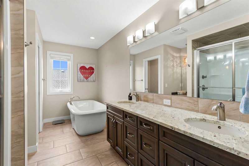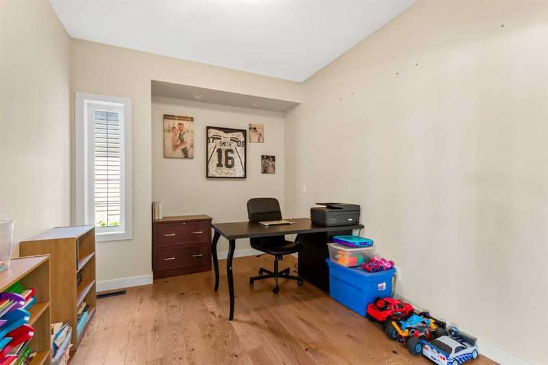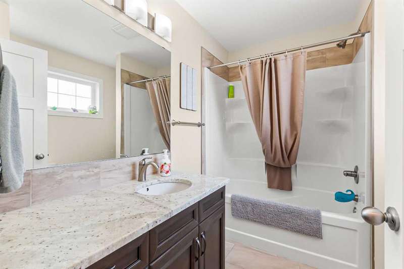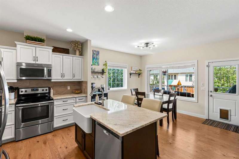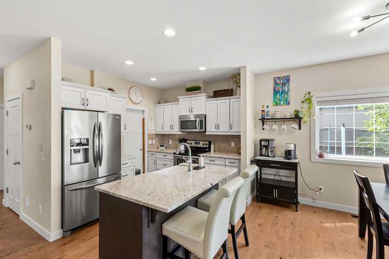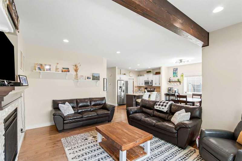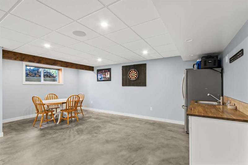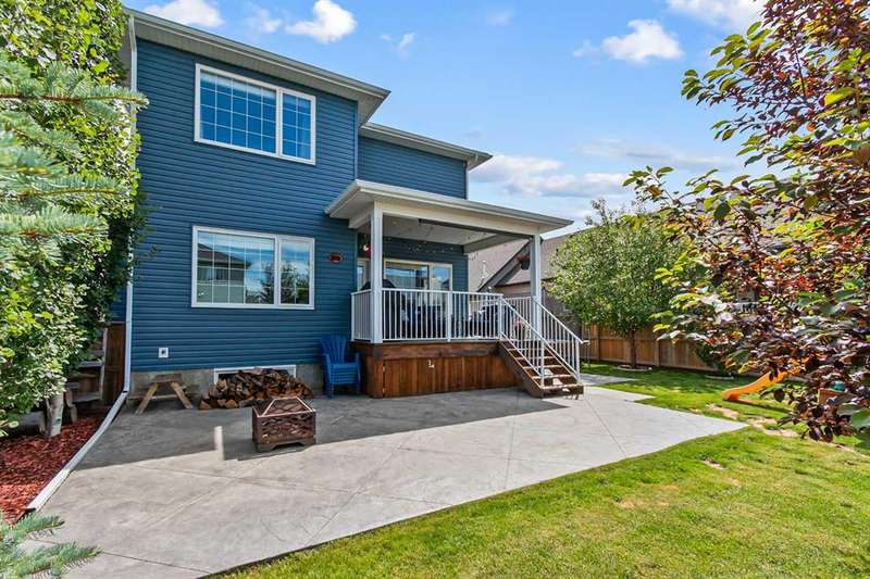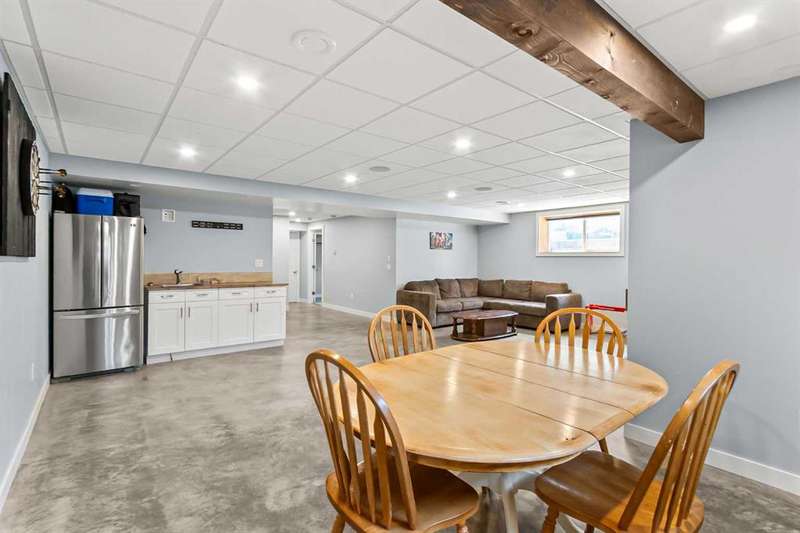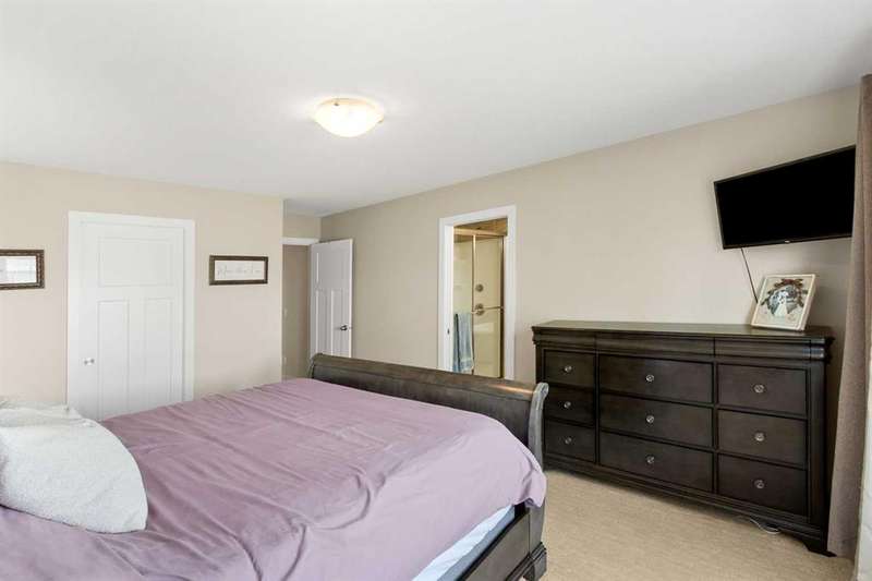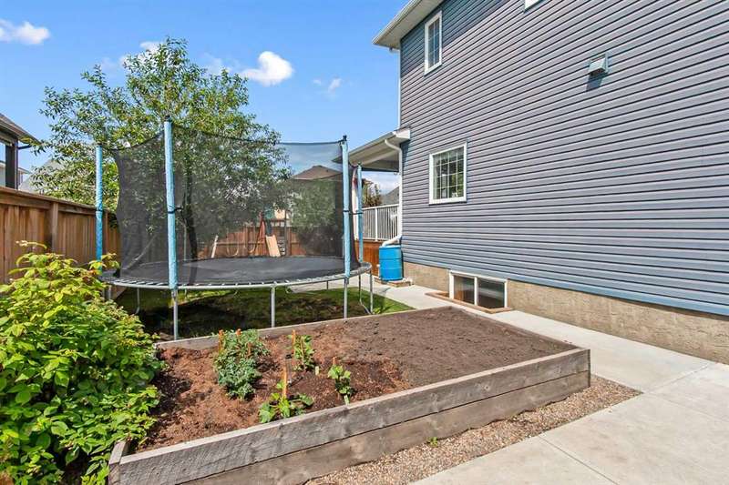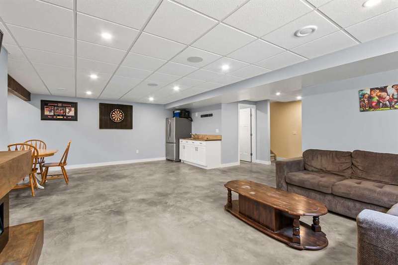 Welcome to this beautiful and well-appointed two-storey family home, built in 2014 and offering nearly 2,400 sq. ft. of thoughtfully designed living space. Ideal for a growing family, this home features three bedrooms upstairs and a fully finished basement, all set on a beautifully landscaped and fenced lot. Step inside to a bright and spacious main floor where the heart of the home is a large kitchen and dining area, complete with quartz countertops, modern cabinetry, and direct access to a west-facing covered deck—perfect for evening barbecues. The main floor also features a cozy living room with a gas fireplace, a private office or den, and a convenient two-piece powder room. Upstairs, you’ll find a generous primary suite with a walk-in closet and a luxurious five-piece ensuite. Two additional bedrooms, a bonus room, a four-piece bathroom, and the laundry room complete the upper level, making it perfect for busy family life. The fully finished basement is designed for entertaining and comfort, with in-floor heated, epoxy-coated concrete floors, a large family room with a wet bar and electric fireplace, a fourth bedroom, another full bathroom, and a utility/storage room. The triple-car oversized garage is a dream for hobbyists or anyone in need of storage, featuring in-slab heating, overhead gas heat, abundant built-in shelving, and plenty of ceiling height for storage. Both the home and garage are equipped with built-in shelving and Bluetooth-controlled speakers throughout, and Govee Perminent lights outside are included for modern convenience. Outside, the yard is fully fenced and professionally landscaped with mature trees, concrete curbing, stamped concrete patio and sidewalks, and a garden shed—offering a private and polished outdoor retreat. This home checks all the boxes for comfort, function, and style. Book your showing today!