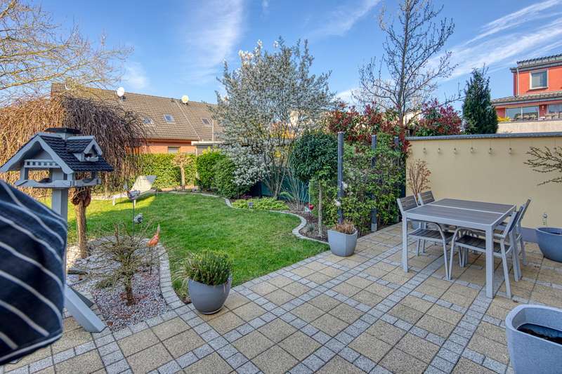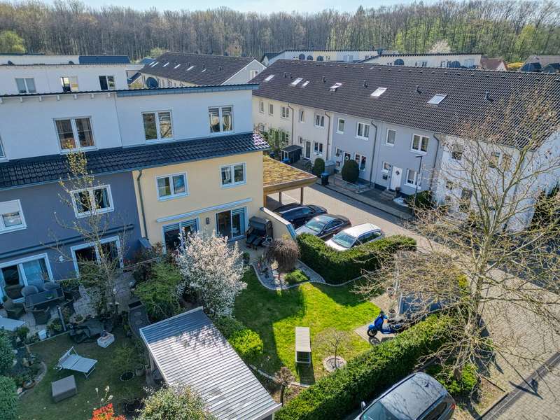 VON POLL IMMOBILIEN presents this modern and family-friendly corner terraced house in a quiet cul-de-sac directly on Lake Otto-Maigler. The property was built in 2003 and offers a living space of approx. 179 m² on a plot of approx. 275 m². The solidly built detached house combines timeless architecture with a well thought-out room concept and fittings that are both timeless and comfortable. A cozy living ambience for the whole family awaits you here on a total of three floors and around five rooms - embedded in a well-kept living environment with a high recreational value. The house conveys a feeling of spaciousness as soon as you enter. The entrance area welcomes you with an inviting hallway that not only has a practical checkroom niche, but also offers direct access to the guest WC and the spacious utility and storage room. The open-plan living, dining and kitchen area forms the heart of the first floor. Large windows let in plenty of natural light and also offer a wonderful view of the lovingly landscaped garden. From here, you have direct access to the spacious, west-facing sun terrace - a place where you can enjoy relaxing afternoons outdoors. An awning provides pleasant shade when needed. The garden is a green idyll with a well-tended lawn and an additional garden shed, which offers practical storage space for tools or garden furniture. The well thought-out room concept continues on the second floor: three well-designed bedrooms offer plenty of space for the whole family or individual use as a guest room or study. The timelessly designed daylight bathroom is equipped with a bathtub and a shower. An additional storage room on this floor provides further storage space. There is a special highlight on the second floor: a spacious, light-flooded room with its own bathroom and shower opens up a wide range of possible uses - whether as a comfortable master bedroom, a teen's room with plenty of privacy or a separate home office area. The combination of openness and functional separation makes this floor a real added value for modern living requirements. In terms of technology and energy efficiency, the house boasts double-glazed plastic windows with roller shutters. Easy-care laminate flooring with integrated sound insulation has been laid in the living areas. The heating and hot water supply are environmentally friendly and efficient thanks to district heating. The façade was given a fresh coat of paint in 2019, while a modern glass canopy at the entrance area and snow guards on the roof not only provide visual accents, but also functional protection. The new zinc cladding on the roof and above the garden wall stylishly rounds off the harmonious overall appearance of the house. The property also leaves nothing to be desired in terms of parking facilities: Two parking spaces are available to the side of the house, including a covered carport. Overall, the house presents itself in a modern and well-kept condition. This offer is ideal for families who are looking for a quiet location near the lake but still want good connections to the city.